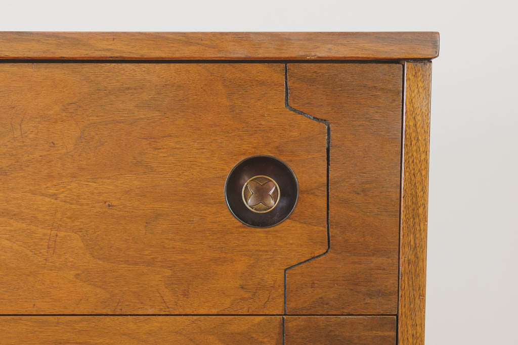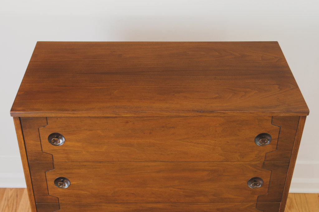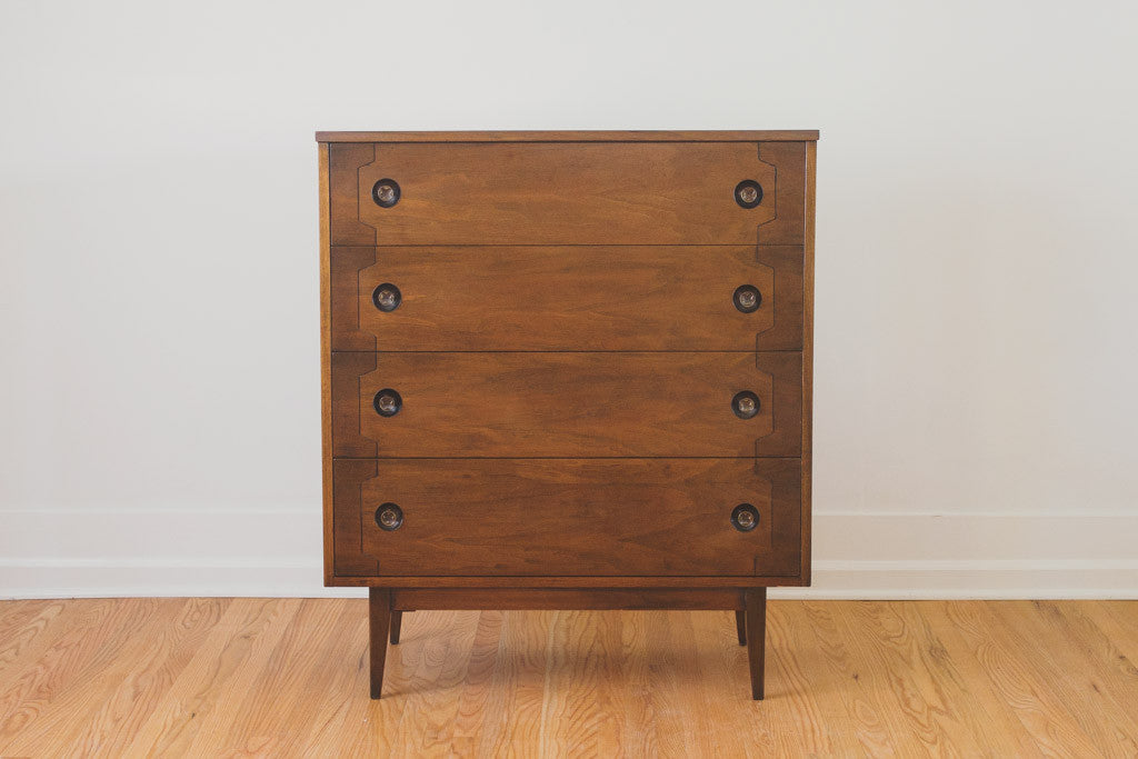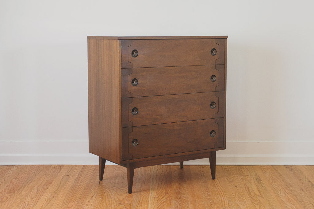 This Mid Century walnut four drawer highboy dresser has inlayed wood details, metal drawer pulls, tapered legs and a wood top. It's in good shape with age related wear. Please see pictures for detailed condition.