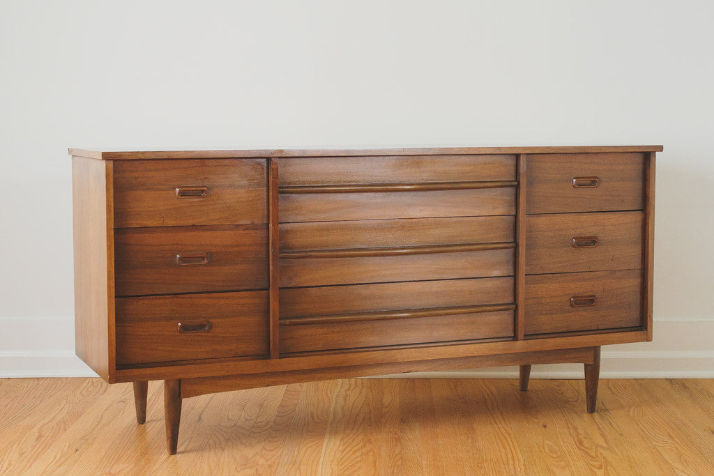 This Mid Century walnut nine drawer lowboy dresser has wood pulls, peg legs and a solid wood top. It's in great shape with some age related wear. It would also be a nice credenza, sideboard or buffet. Please see pictures for detailed condition.