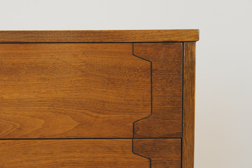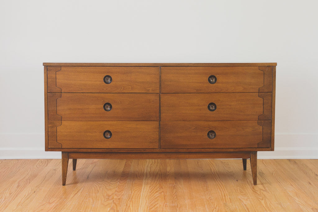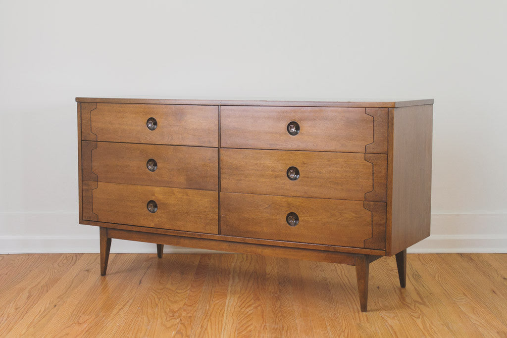 This Mid Century walnut six drawer lowboy dresser has inlayed wood details, metal drawer pulls, tapered legs and a wood top. It's in good shape with age related wear. It could also used as a credenza, sideboard or buffet. Please see pictures for detailed condition.