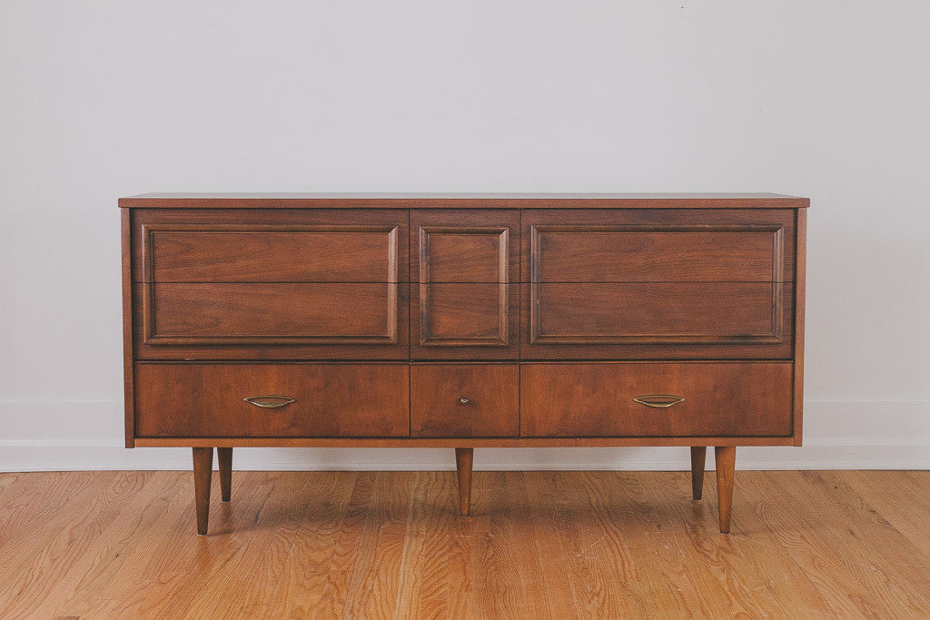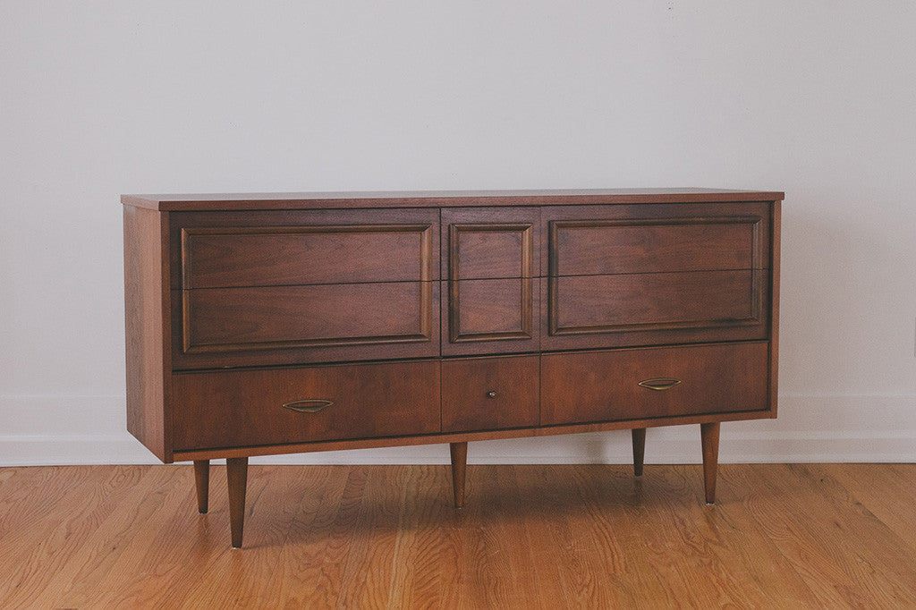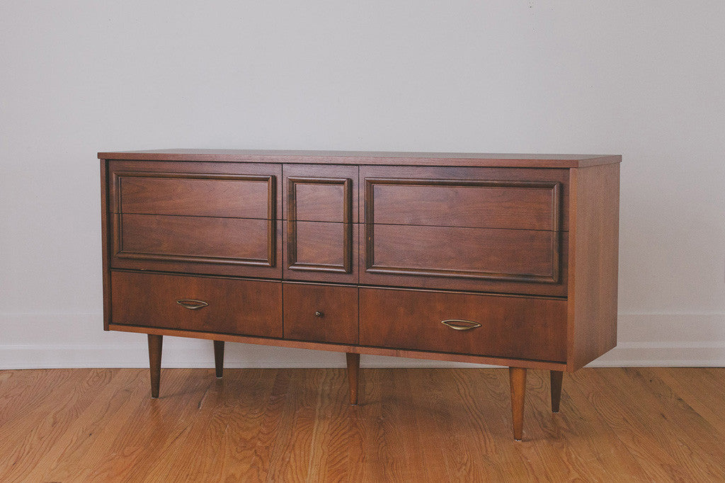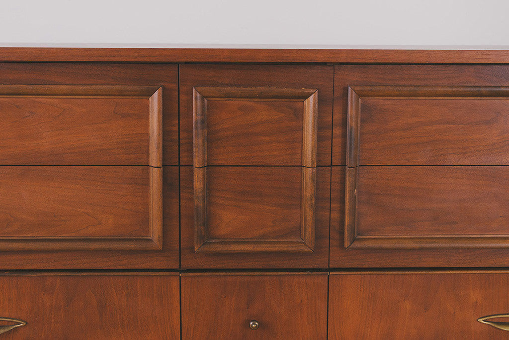 This Mid Century walnut nine drawer lowboy dresser has brass pulls, peg legs and a wood-grain solid surface top. It's in great shape with some age related wear and could also be used as a credenza, sideboard or buffet. Please see pictures for detailed condition.