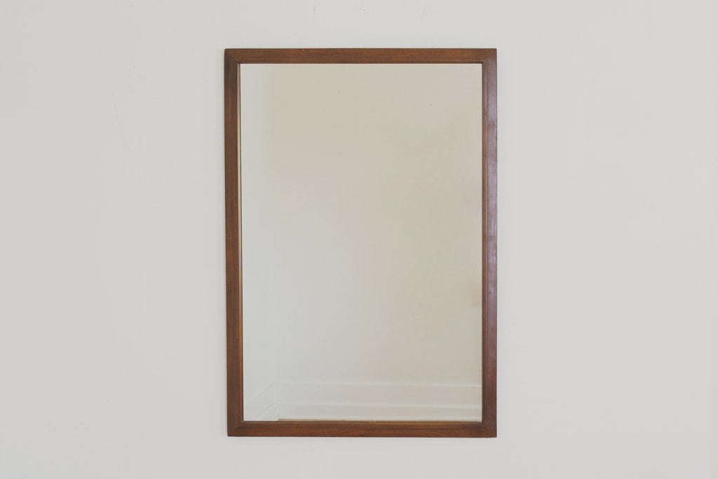 This vintage Mid Century mirror has a solid dark wood frame. The mirror itself is in good shape and would be a nice addition over a bathroom vanity, dresser or in an entryway. The frame shows light age related wear. Please see pictures for detailed condition.