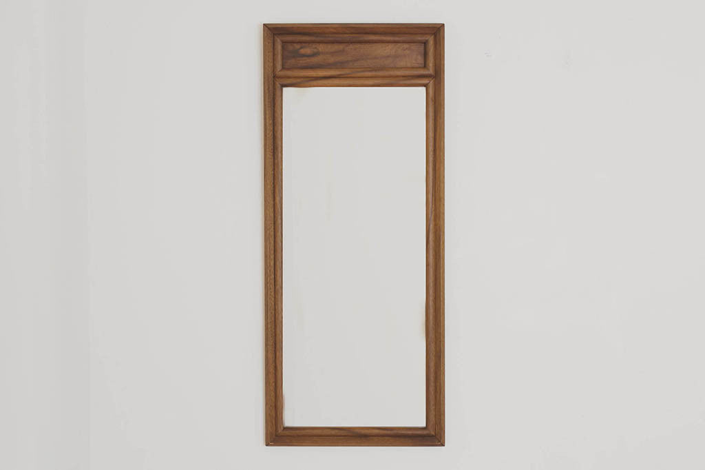This full length Mid Century mirror was manufactured by Stanley. It's walnut with carved wood details and is in good shape with age related wear. Please see pictures for detailed condition.