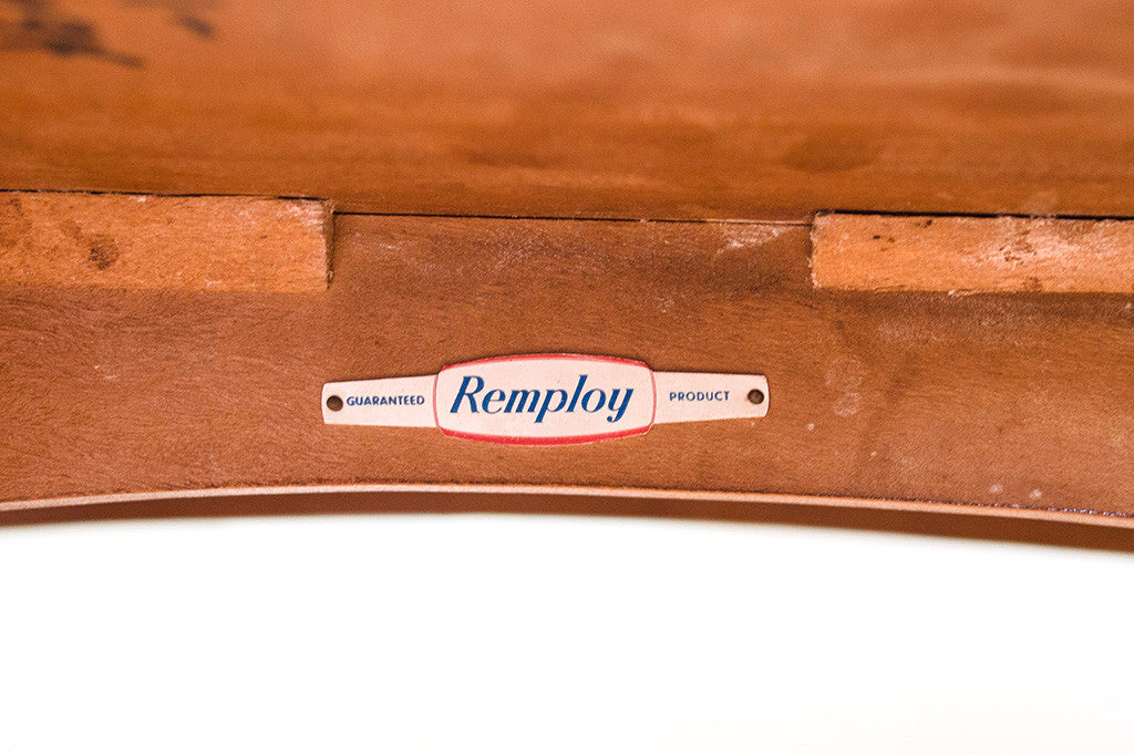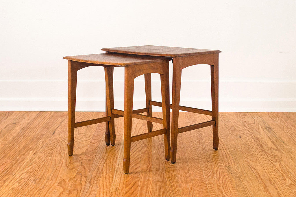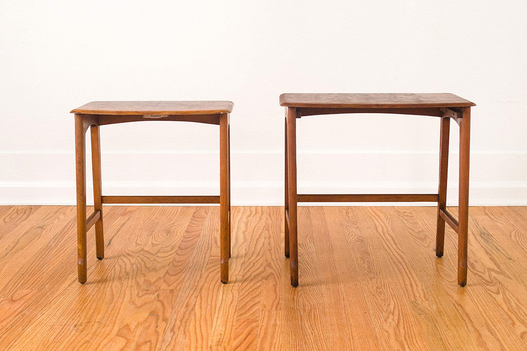 This pair of vintage Mid Century nesting tables were manufactured by Remploy and imported from England. They have solid wood tops and are in overall excellent condition with some light age related wear and a few darker spots on the smaller table. Please see pictures for detailed condition of this set.