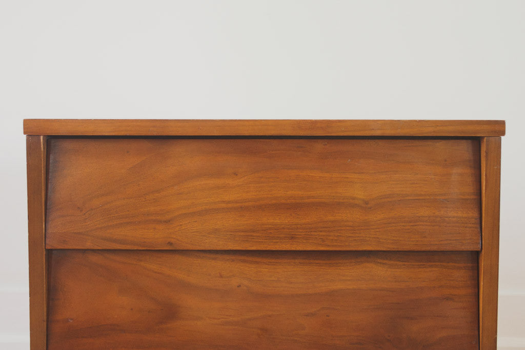 This Mid Century Dixie brand nightstand is walnut with two drawers, tapered legs and a wood top. It's in good shape and could also be used as a side or end table. Please see pictures for detailed condition.