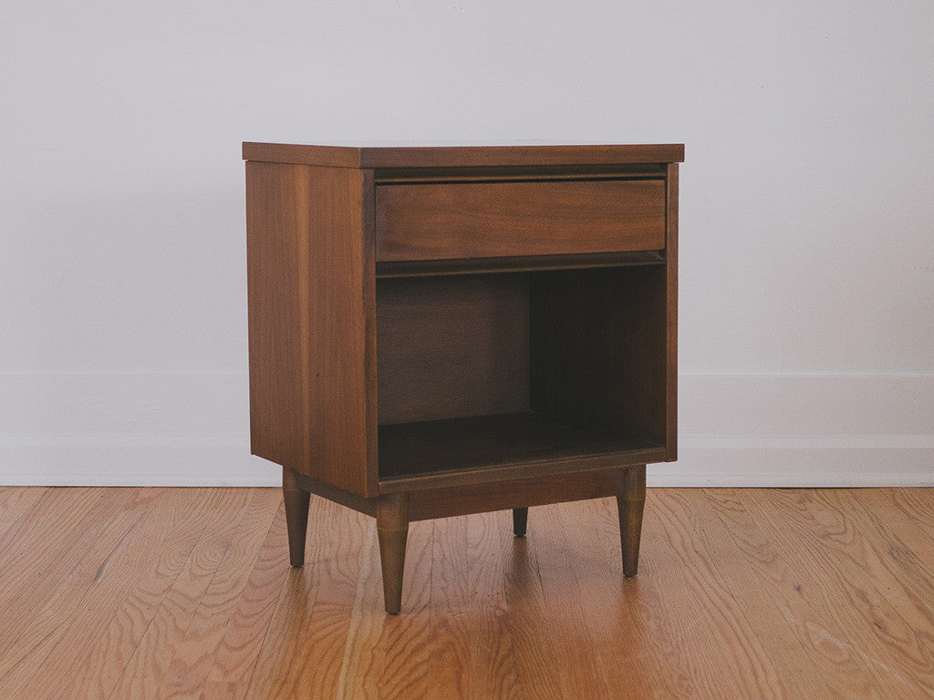 These vintage Mid Century single drawer nightstands have walnut frames, peg legs and solid surface wood grain tops. They're in good shape with age related wear. Please see pictures for detailed condition.