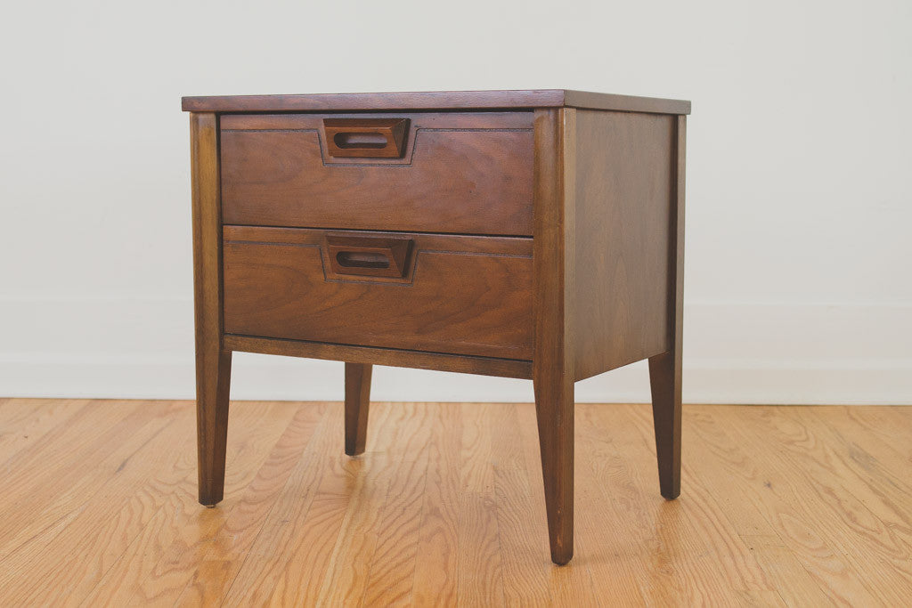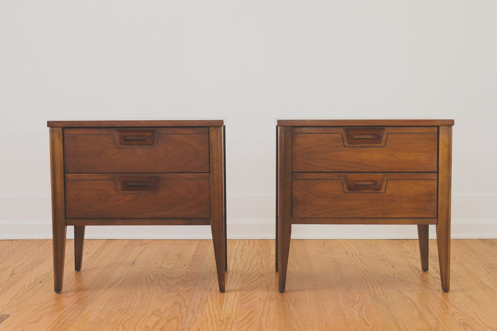 These Mid Century walnut two drawer nightstands have wood pulls, peg legs and solid wood tops. They're in great shape with some age related wear. Please see pictures for detailed condition.