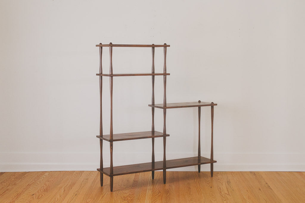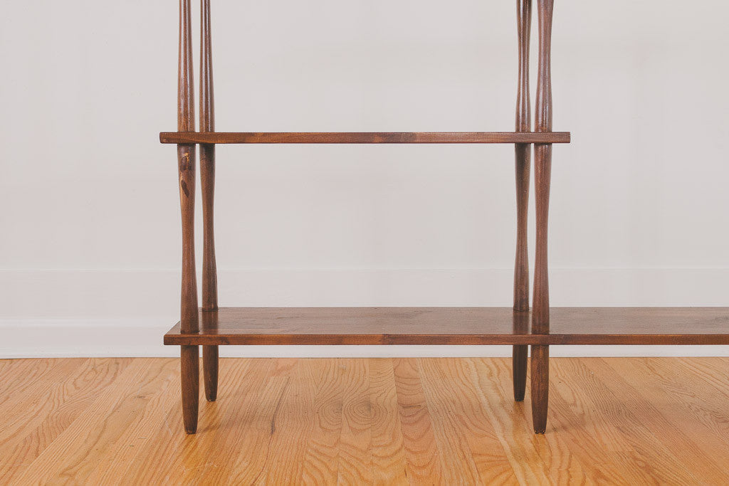 This Mid Century shelving unit is solid wood with a dark walnut finish. It has six shelves and would make a great bookcase, bar, entertainment center or room divider. It's in great shape with light age related wear and can be disassembled for shipping. Please see pictures for detailed condition of this piece.
