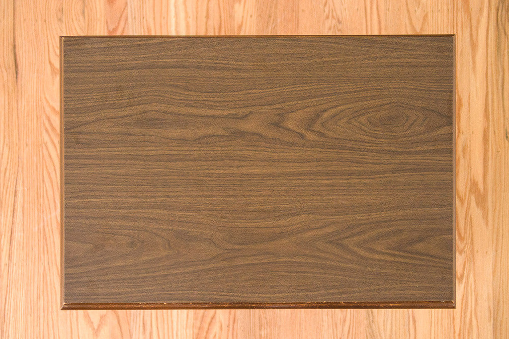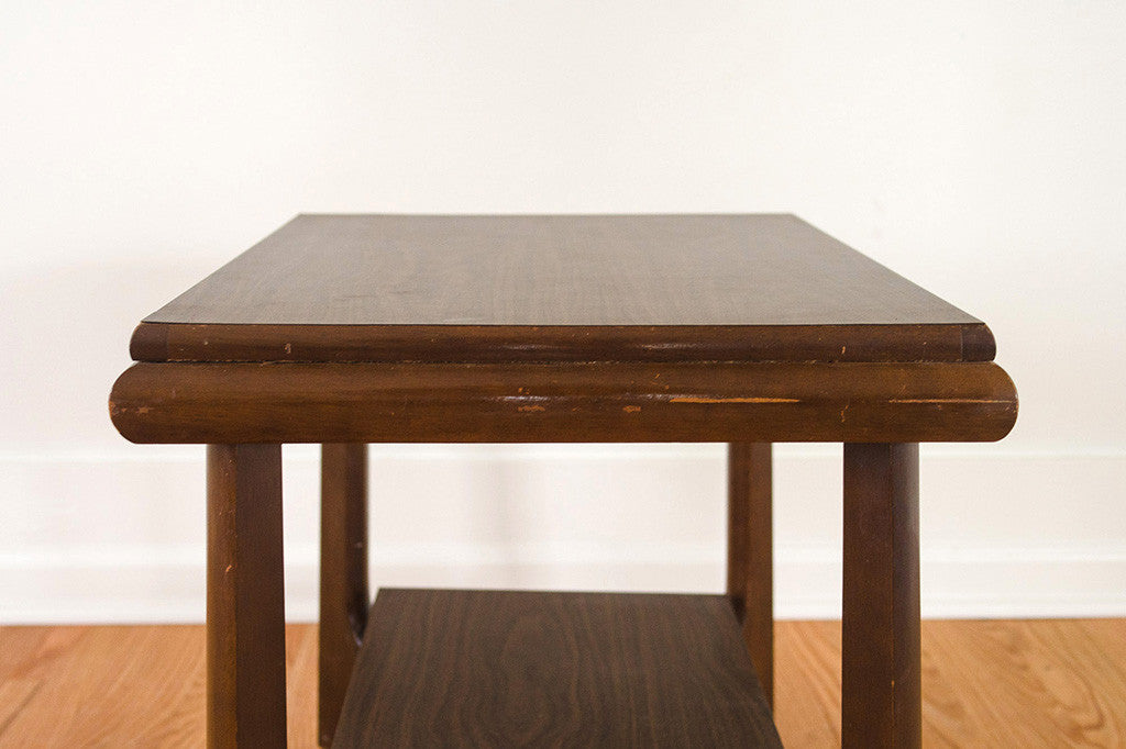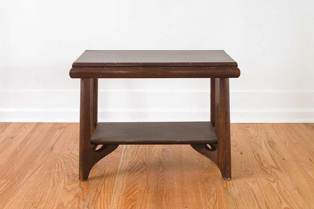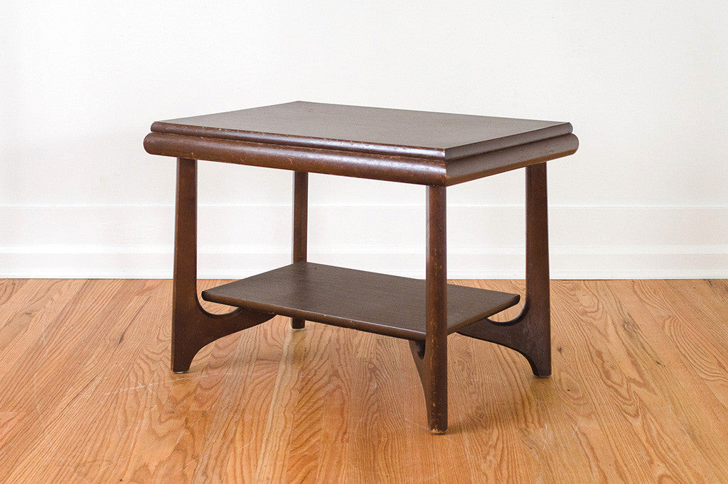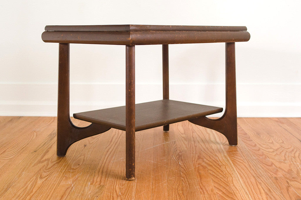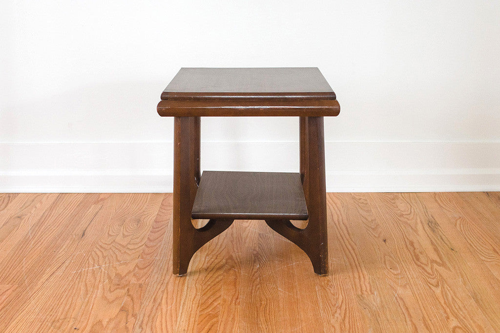 This Mid Century side table was made in the style of Adrian Pearsall. It has a dark walnut base with a wood grain solid surface top. It would be perfect next to a sofa or in between two chairs and could also be a nightstand next to a lower bed. It's in good shape with some age related wear. Please see pictures for detailed condition of this piece.