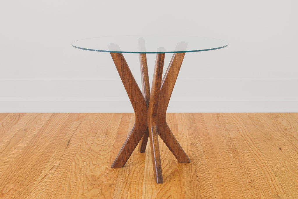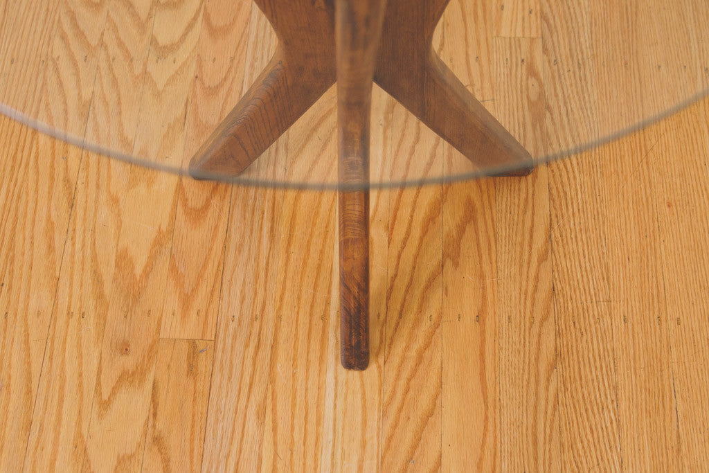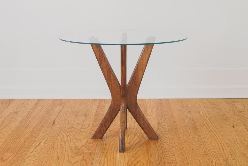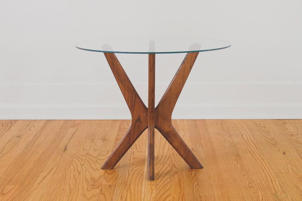 This Mid Century side table has a walnut base and circular glass top. It could also be used as a nightstand or plant stand. It's in good shape with some light age related wear including a small chip in the glass. Please see pictures for detailed condition.