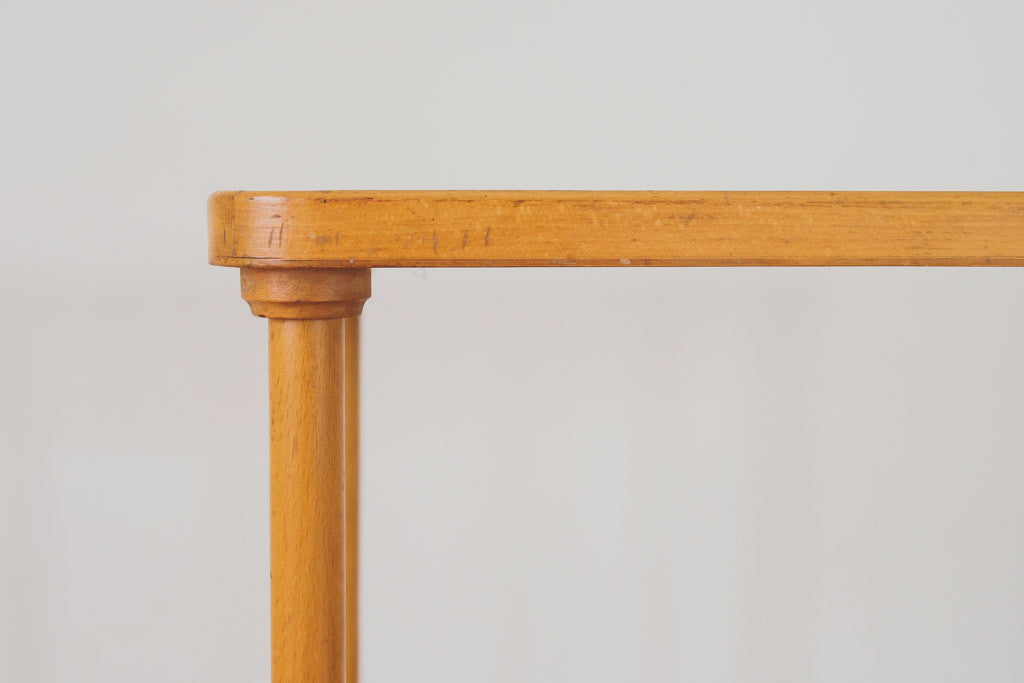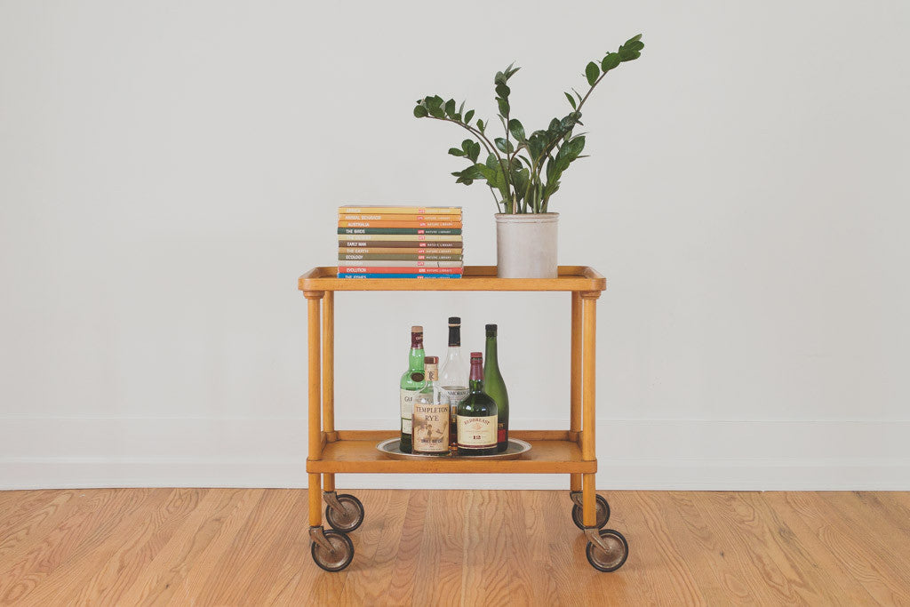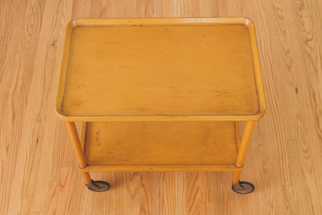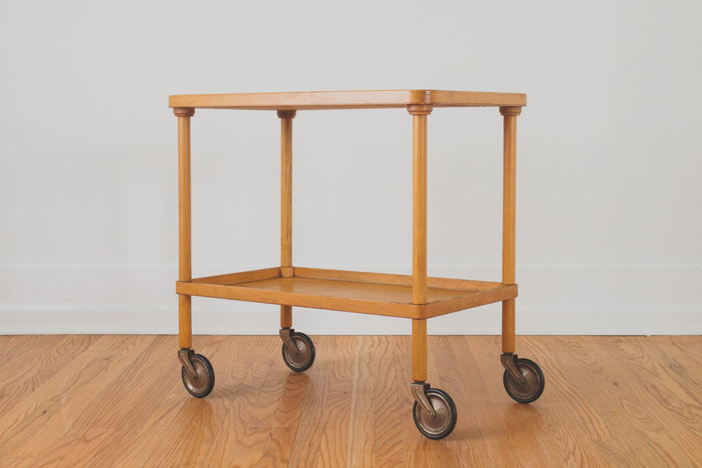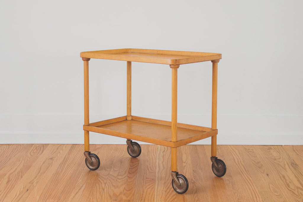 This Mid Century bar cart is light wood with two shelves, and metal and rubber wheels that roll smoothly. It's in good shape with light age related wear. Please see pictures for detailed condition.