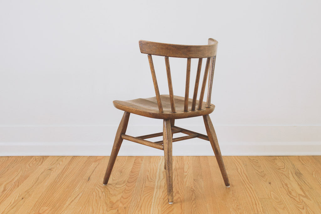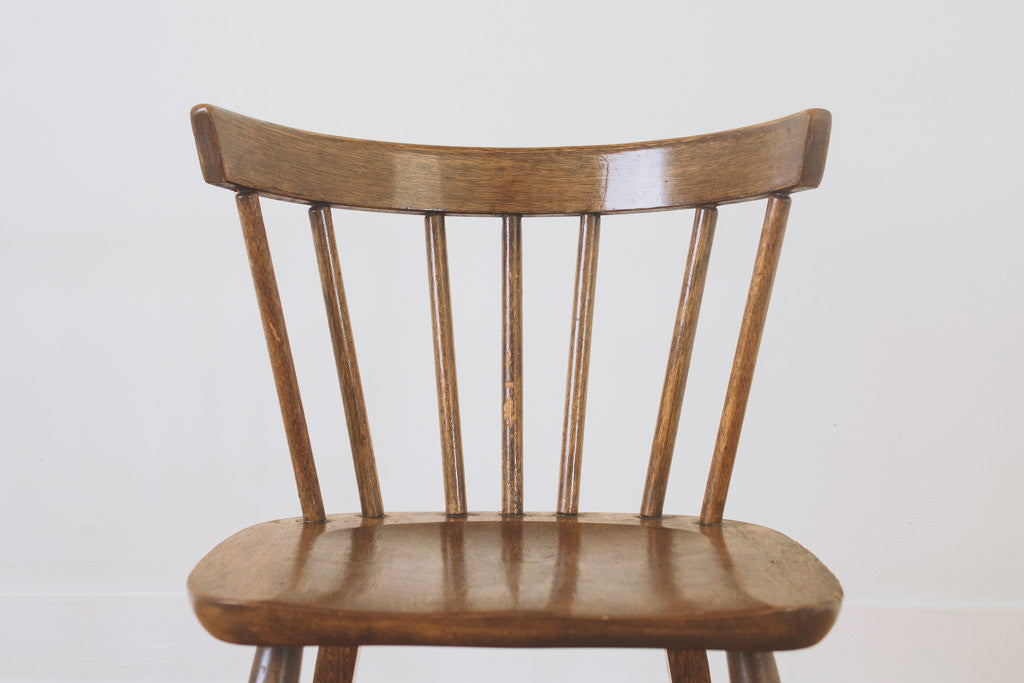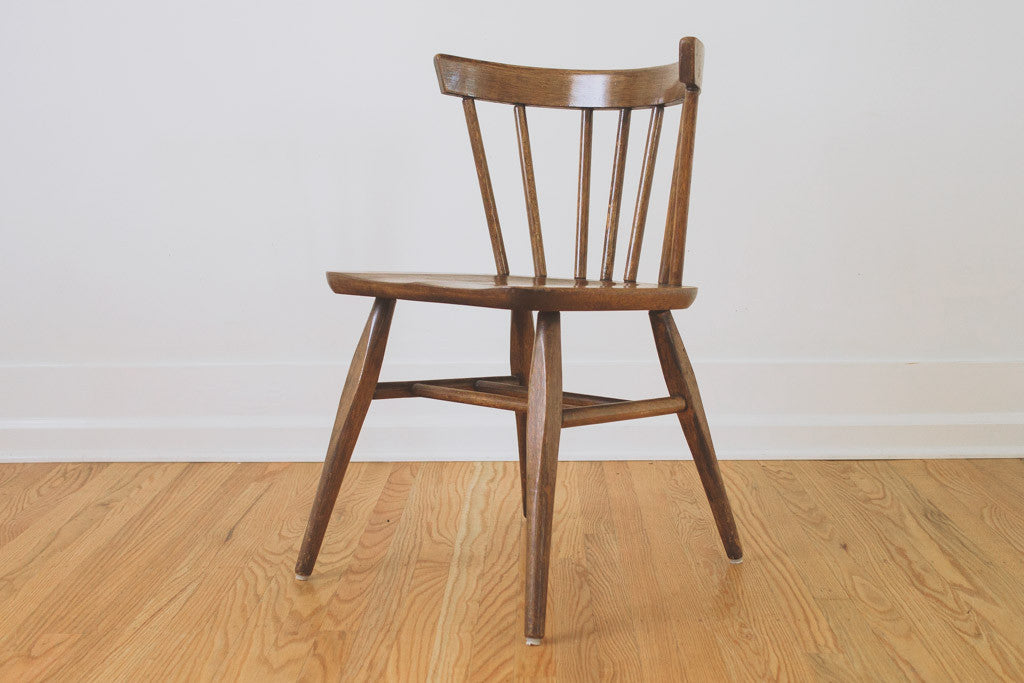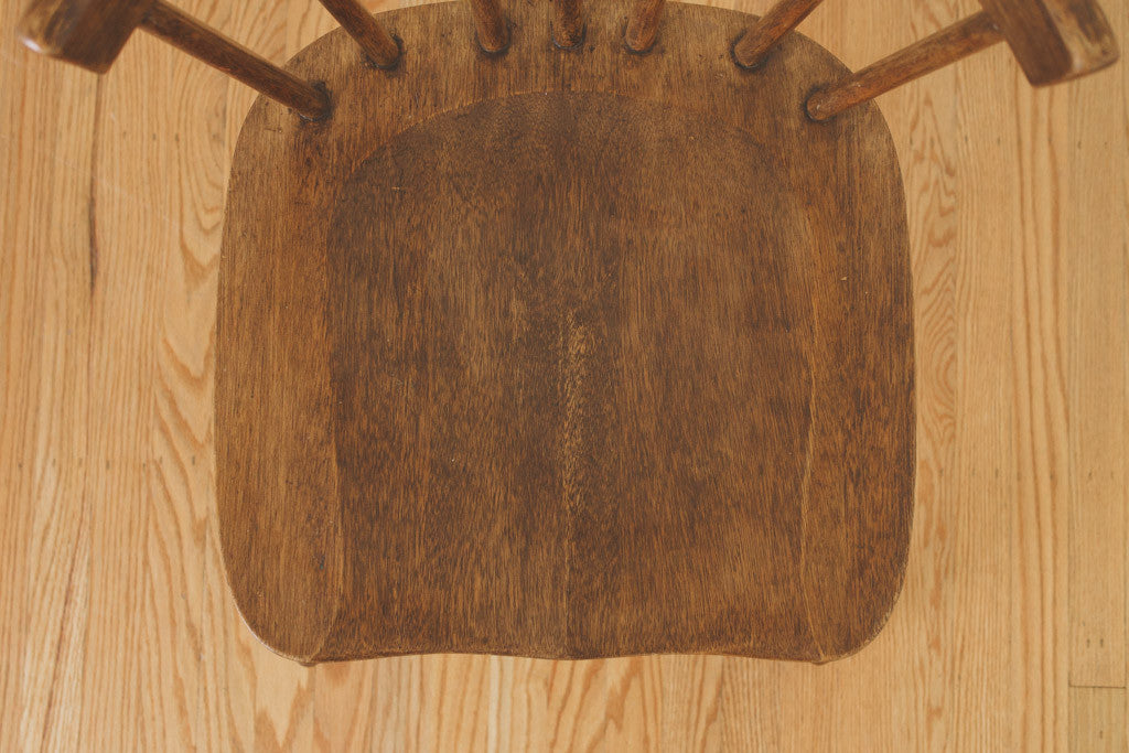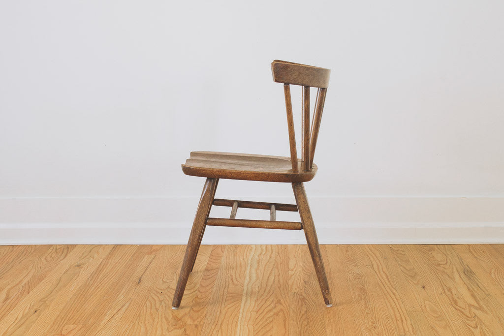 This Mid Century carved oak chair has a curved, dowelled back and carved wood seat made in the style of the Nakashima straight back chair. It's in good shape with age related wear. See pictures for detailed condition.