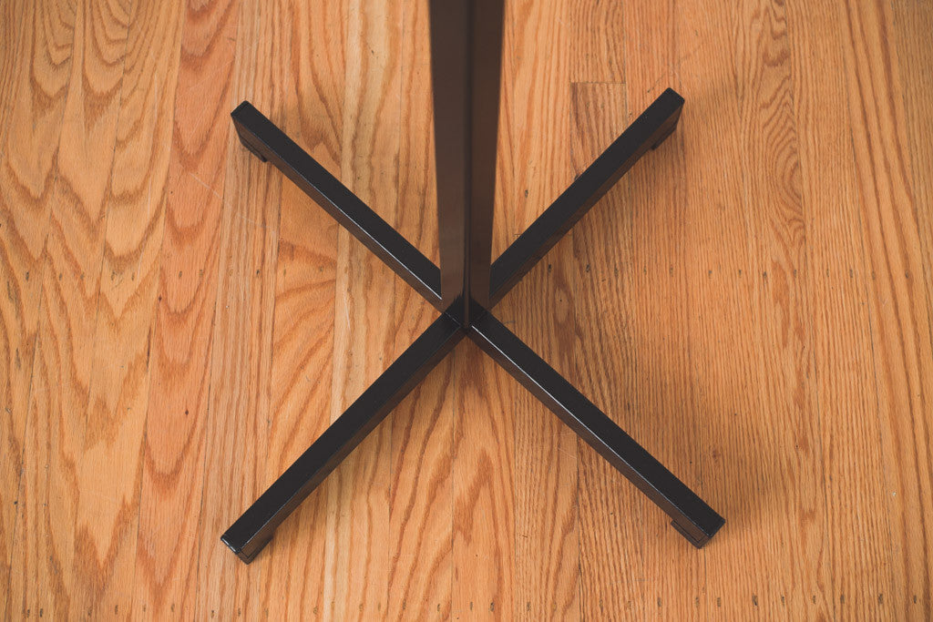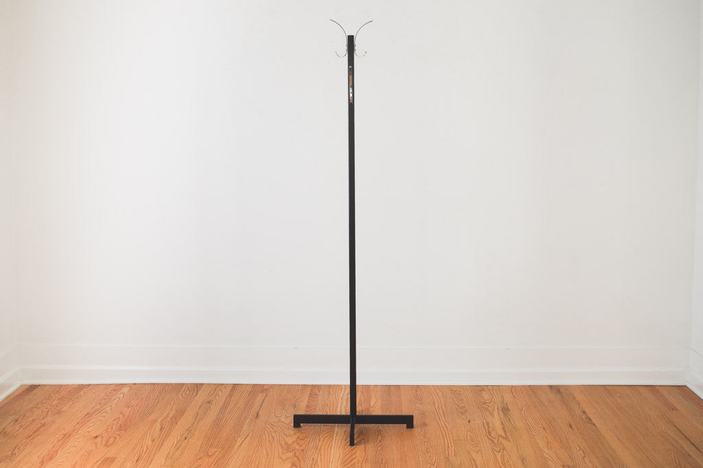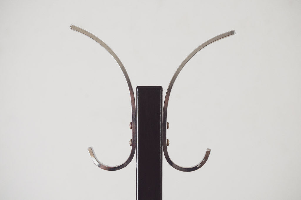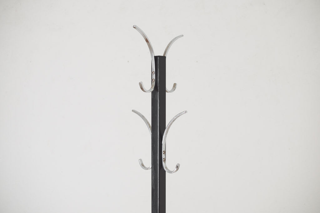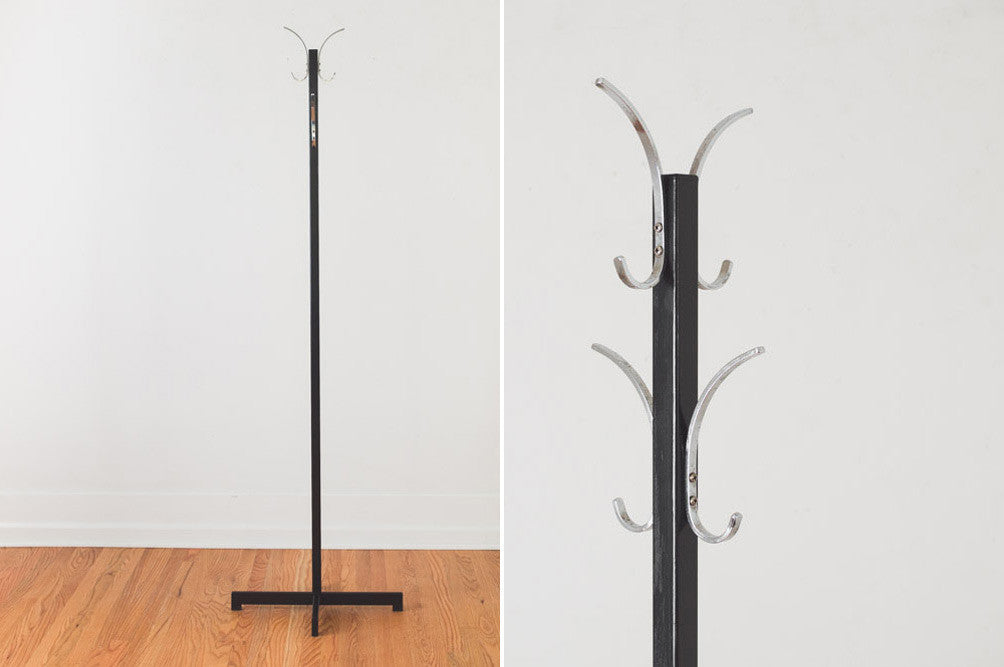 This vintage metal coat rack has four chrome double hooks on a heavy, gloss black frame. It would be great in an entryway, mudroom or used as a towel rack in a bathroom. It's in good shape with age related wear. See pictures for detailed condition.