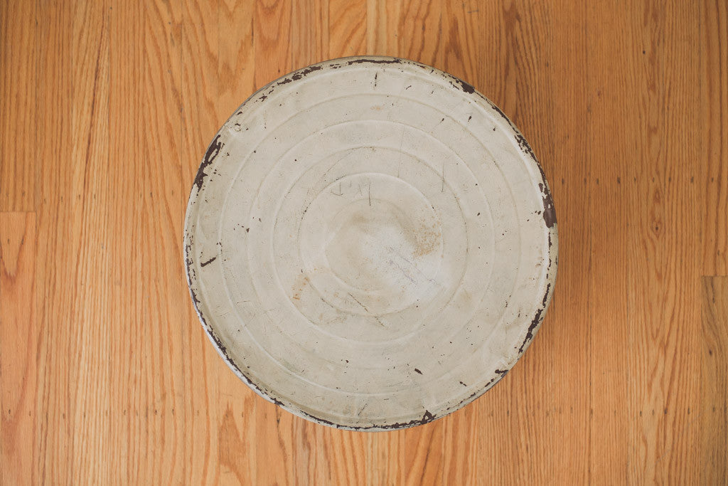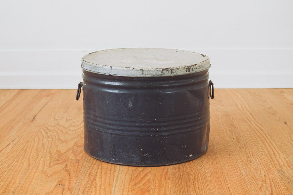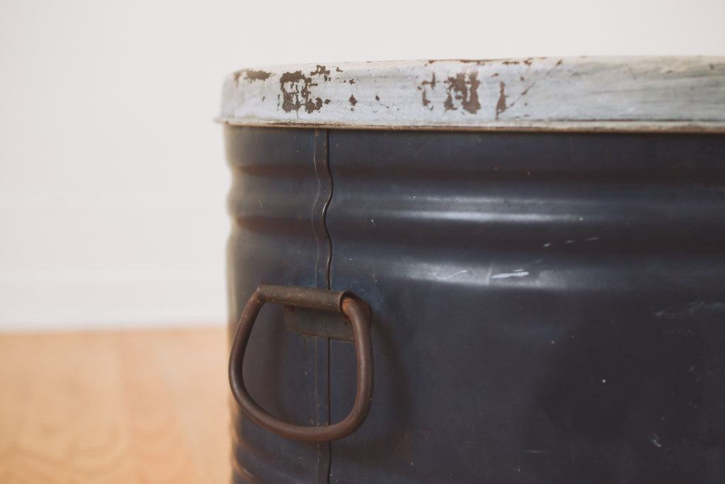 This vintage metal hat tin has distressed blue and white paint. Perfect for extra storage of any kind or as a trash can with lid. It's in good shape with age related wear. See pictures for detailed condition.