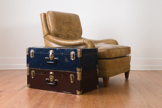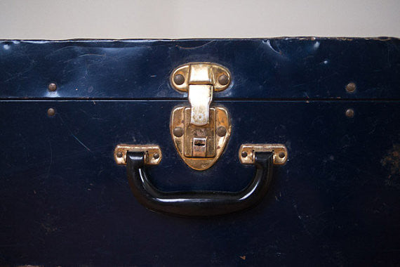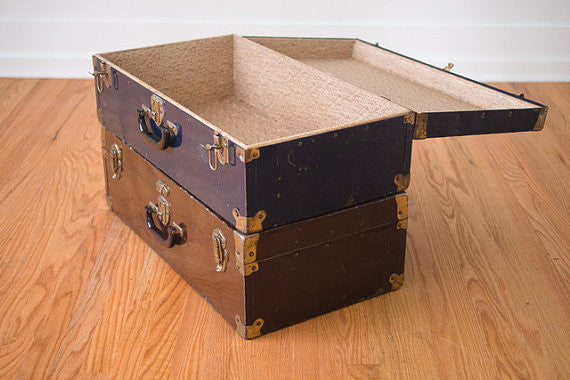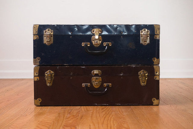 We have a really cool set of vintage metal suitcases with brass hardware and bakelite handles in the shop. They stack on top of each other to make a perfect side table. They're lined on the inside and are nice and clean, great for extra storage. The exteriors are a bit rusty and distressed which gives them the industrial, shabby, rustic look. They would probably be great for under the bed storage as well if you have at least nine inches of clearance. (Sold as a set)