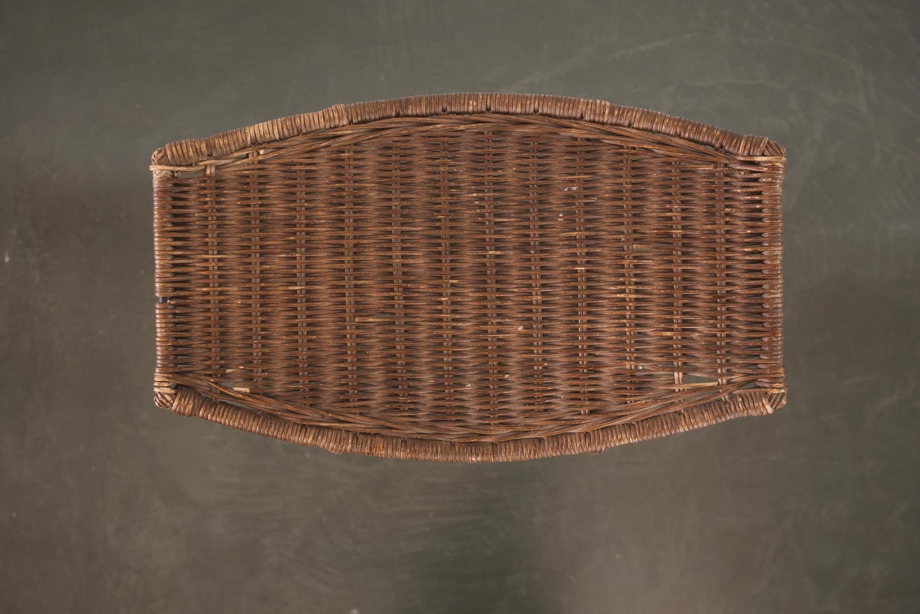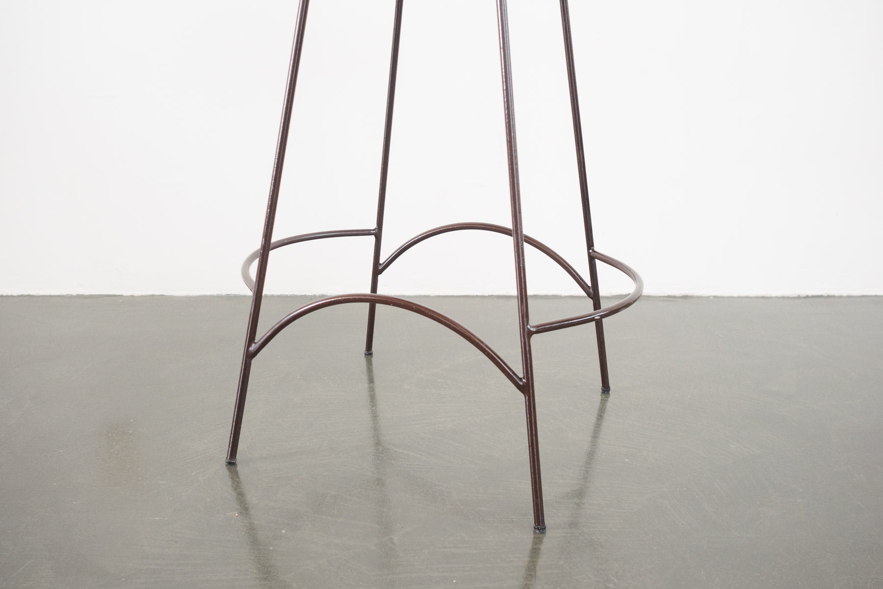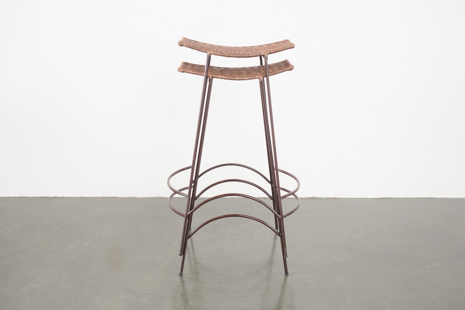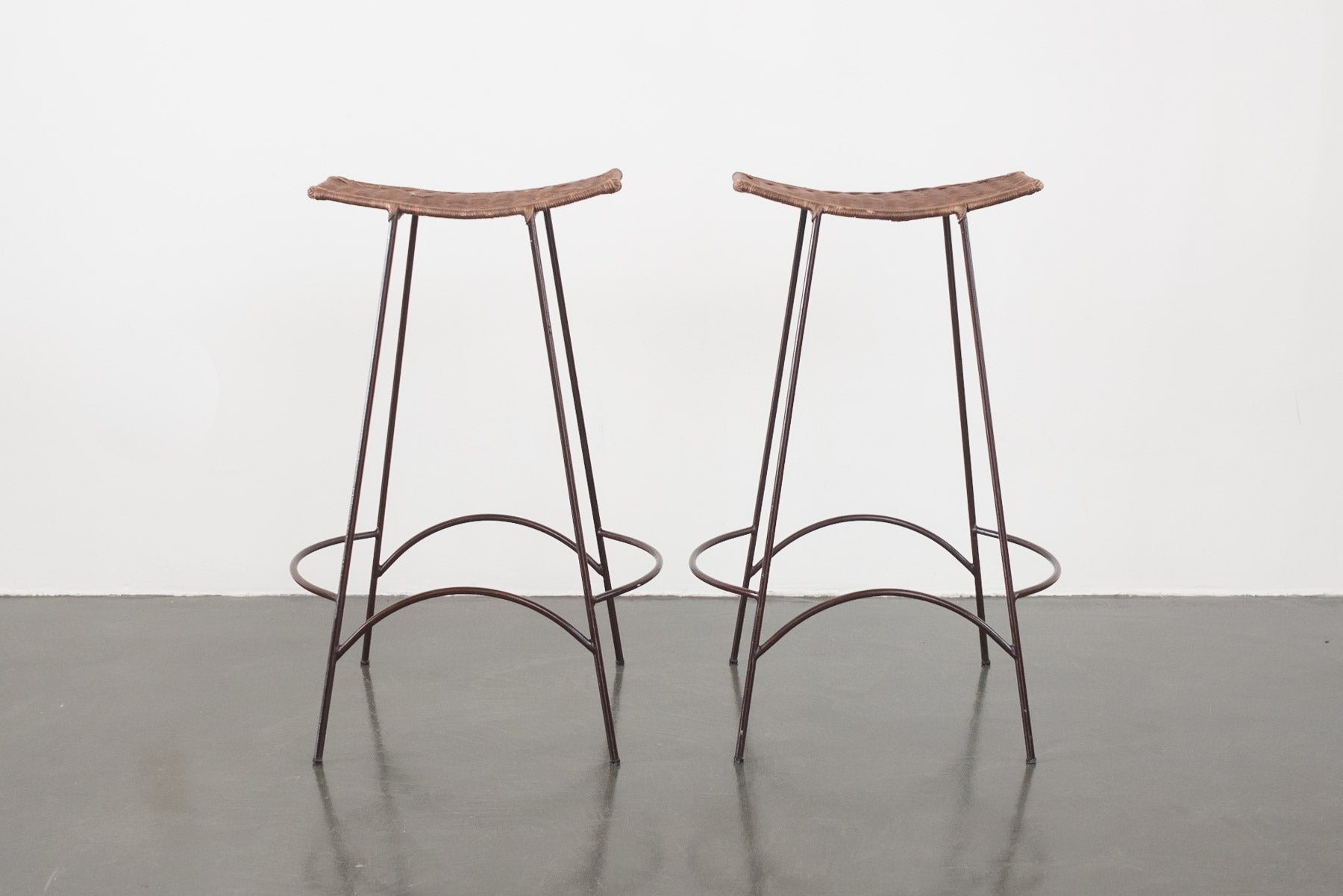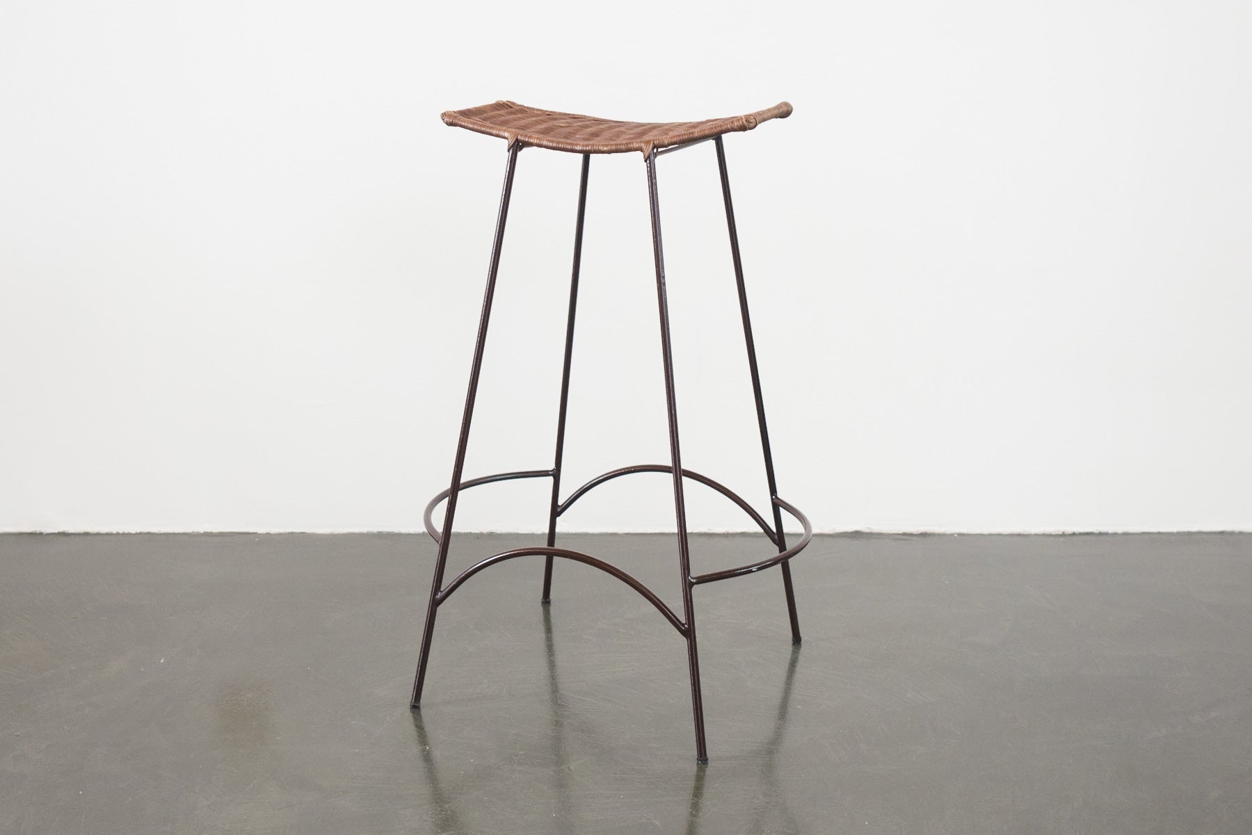 style: Arthur Umanoff, modern, minimalist, bar, stools, stacking, pair material: steel, woven cane age: vintage, Mid Century condition: good/sturdy, age related separation & wear - see pictures other: priced as a set