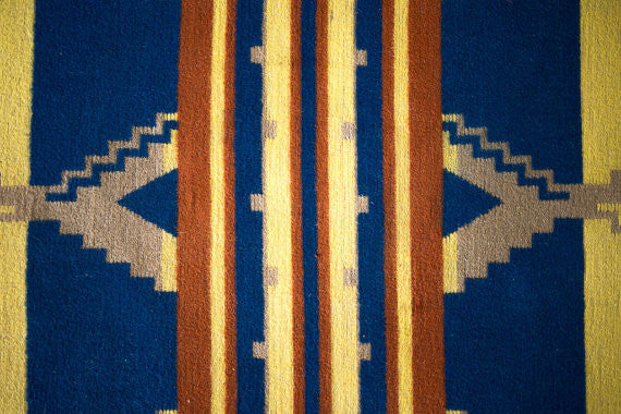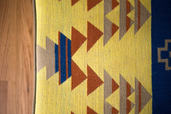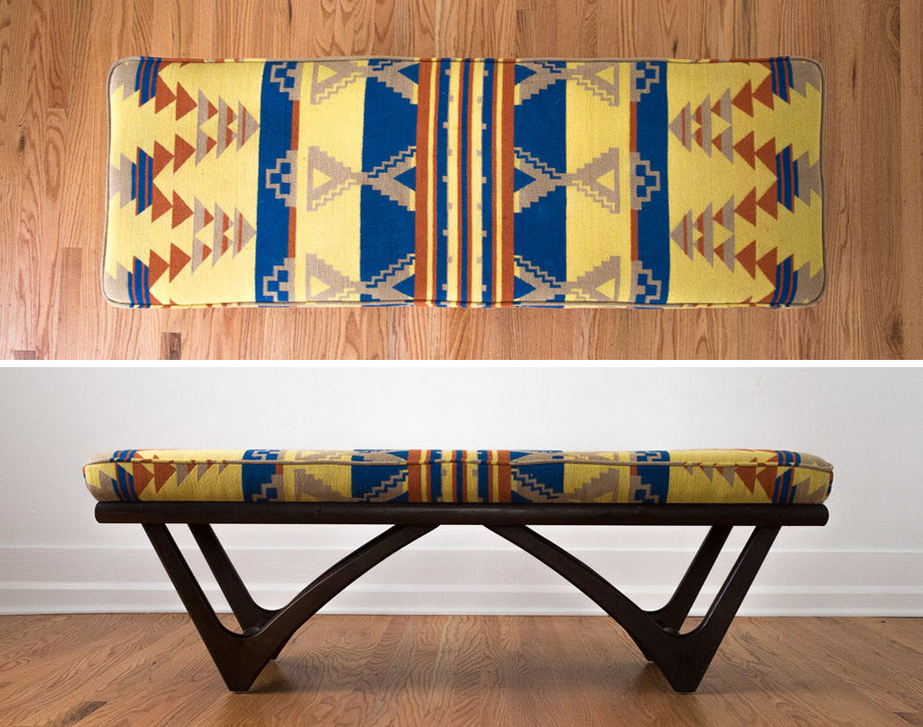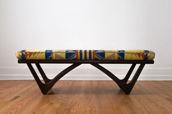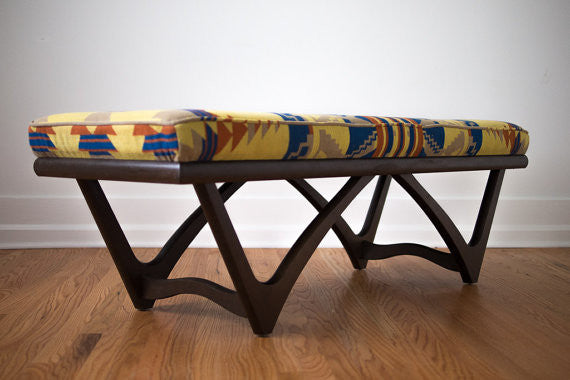 Bench 03 in our vintage camp blanket series. We had a dark wood Adrian Pearsall-esque coffee table upholstered in a vintage Native American camp blanket. It's a handsome piece, perfect for extra seating or as a coffee table. It's in great shape overall with very light natural distressing on the wood and some natural wear to the upholstery.