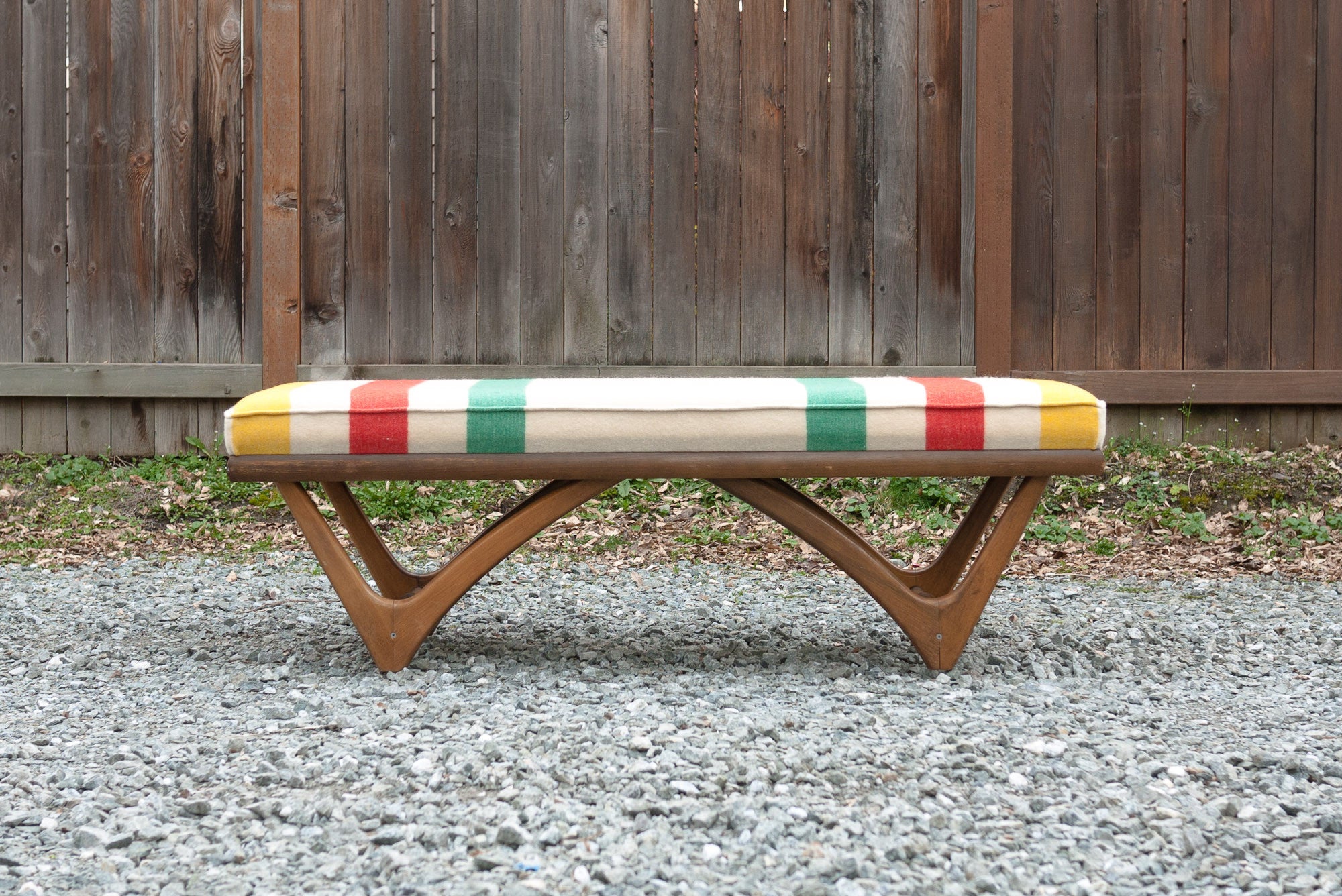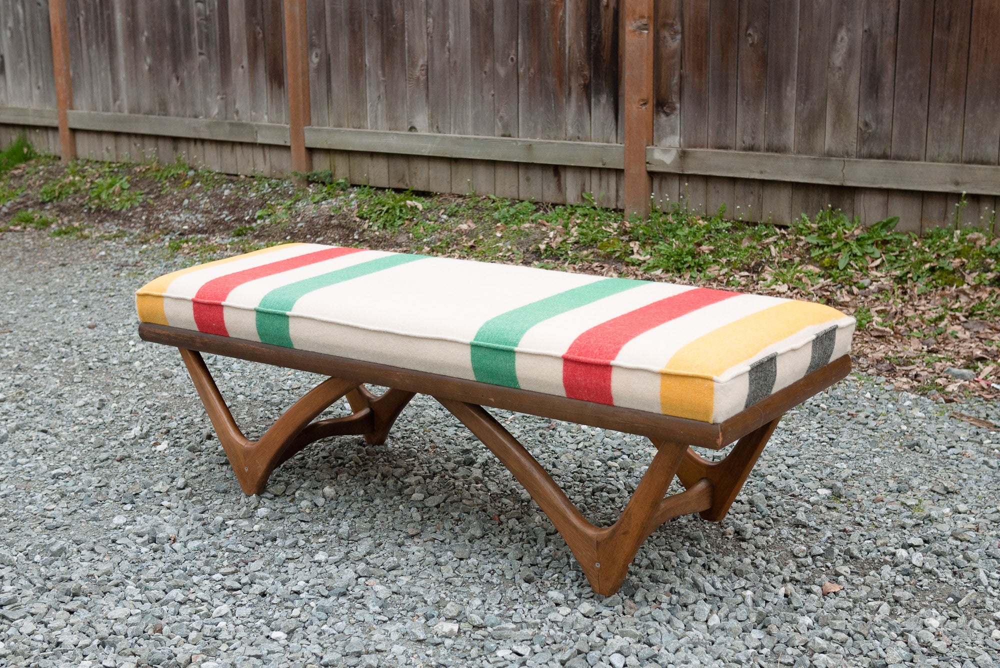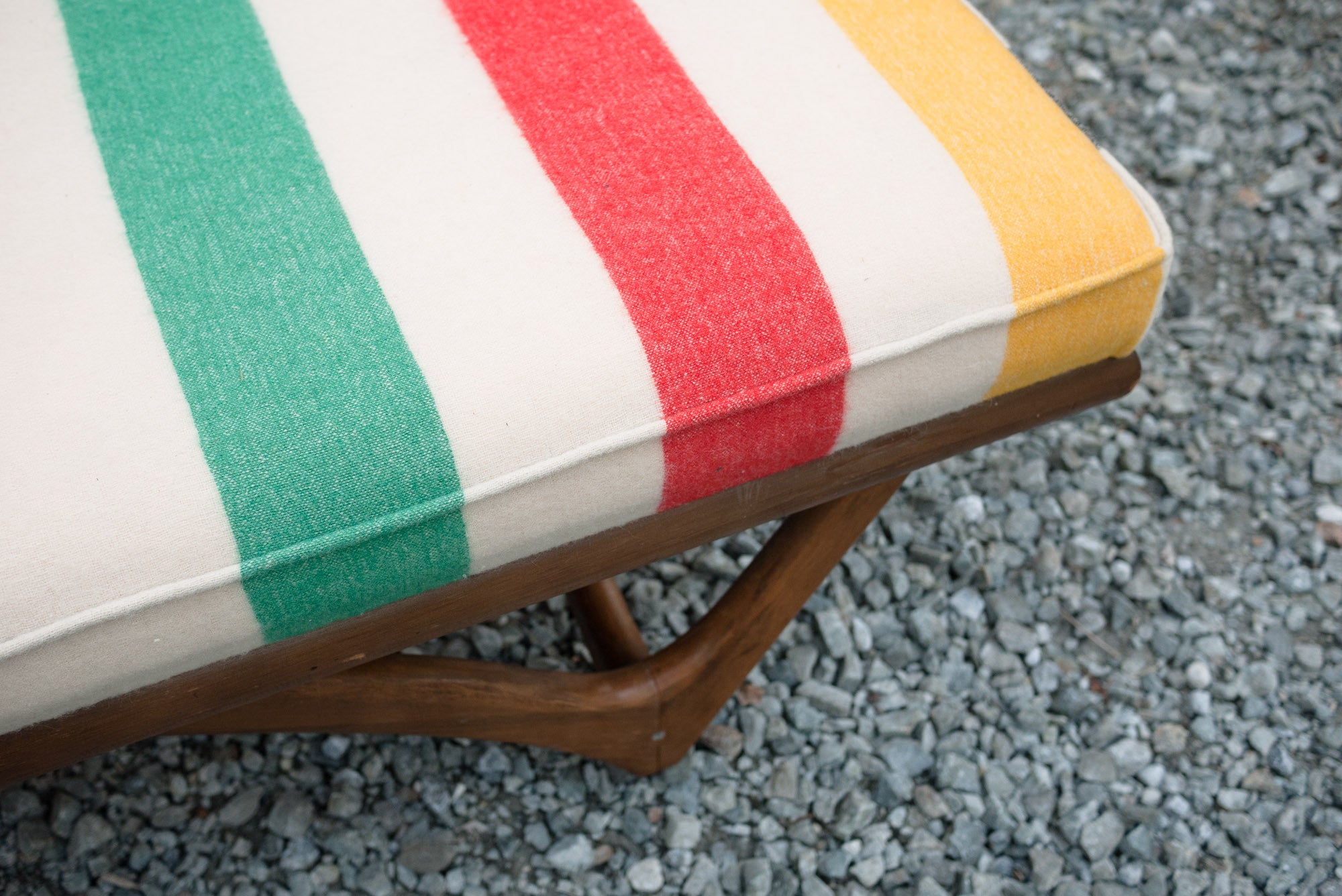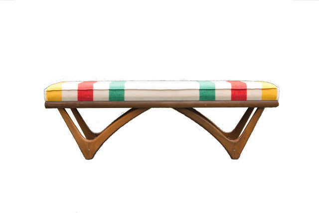 Bench 01 in our vintage camp blanket series. We had a dark wood Adrian Pearsall-esque coffee table upholstered in a vintage Hudson Bay style camp blanket. It's a handsome piece, perfect for extra seating or as a coffee table. It's in great shape overall with very light natural distressing on the wood and some natural wear to the upholstery.
