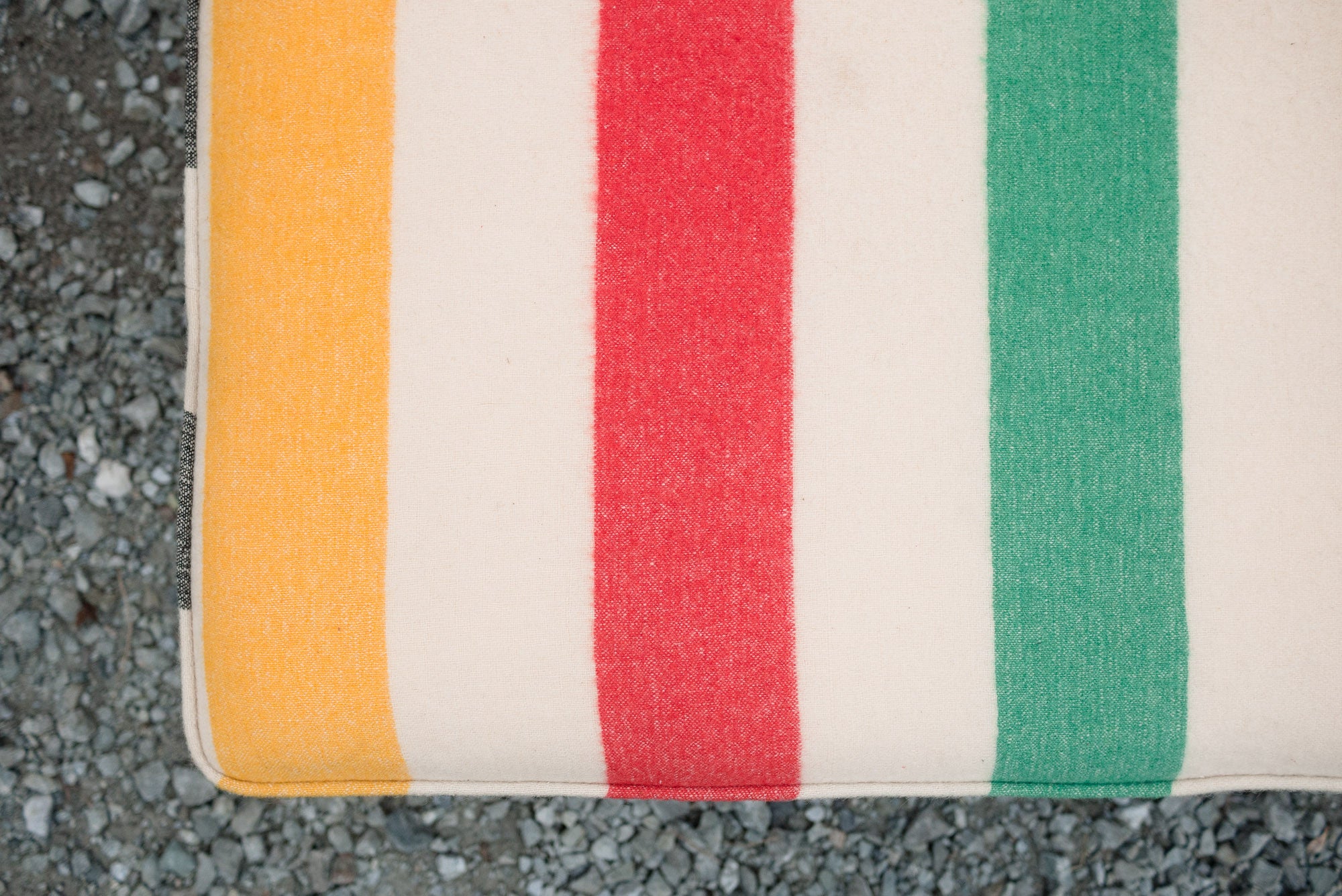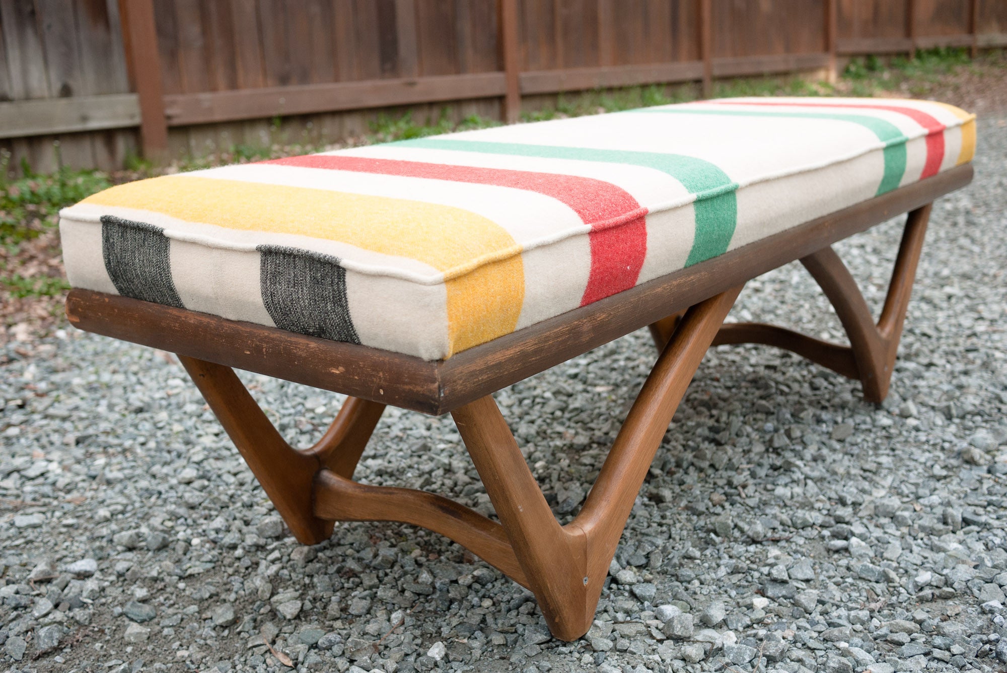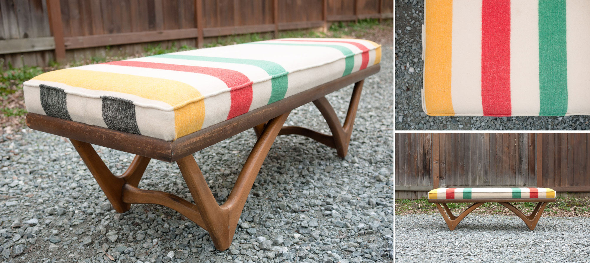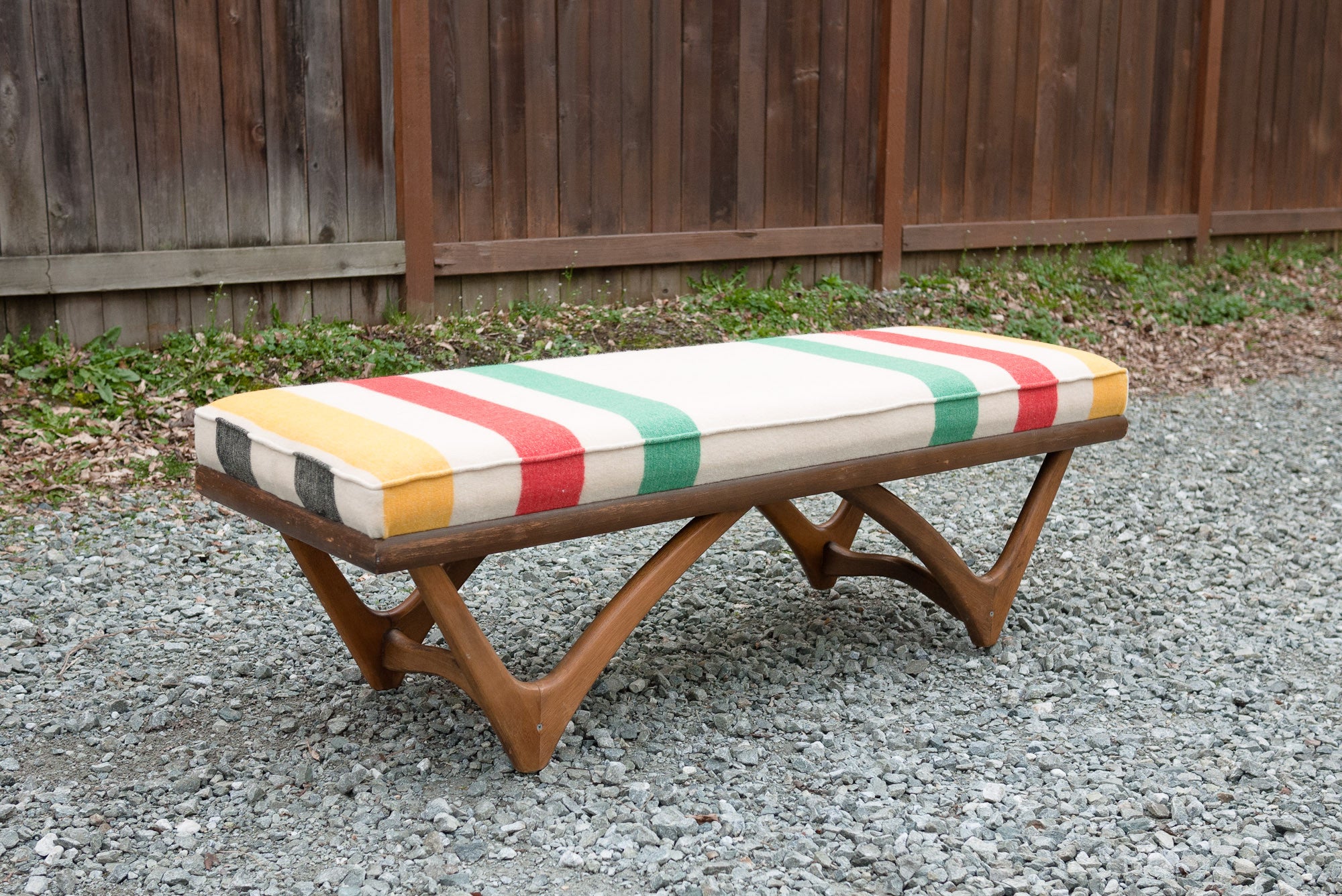 Bench 01 in our vintage camp blanket series. We had a dark wood Adrian Pearsall-esque coffee table upholstered in a vintage Hudson Bay style camp blanket. It's a handsome piece, perfect for extra seating or as a coffee table. It's in great shape overall with very light natural distressing on the wood and some natural wear to the upholstery.