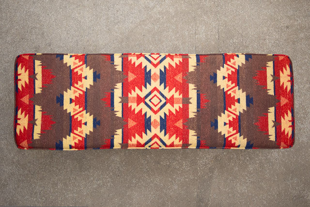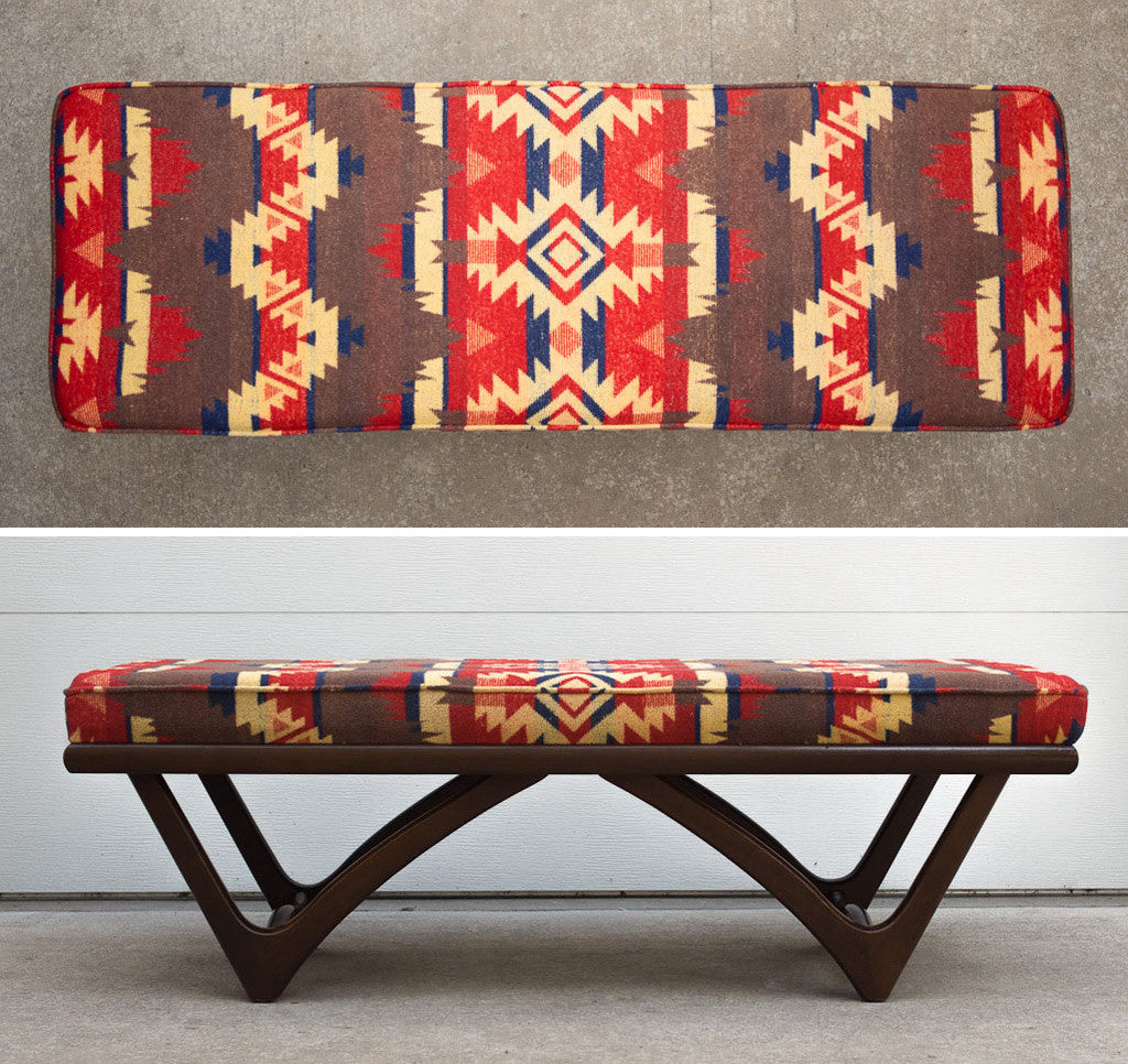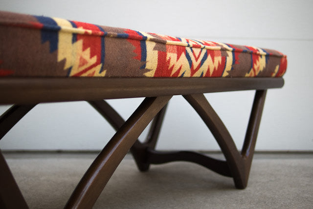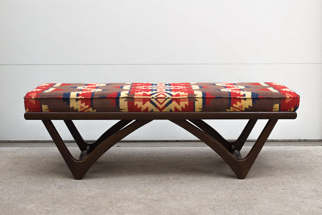 Bench 02 in our vintage camp blanket series. We had a dark wood Adrian Pearsall-esque coffee table upholstered in a vintage Native American camp blanket. It's a handsome piece, perfect for extra seating or as a coffee table. It's in great shape overall with very light natural distressing on the wood and some natural wear to the upholstery.