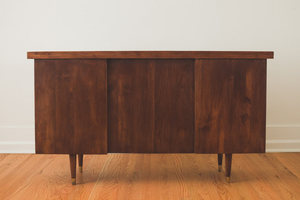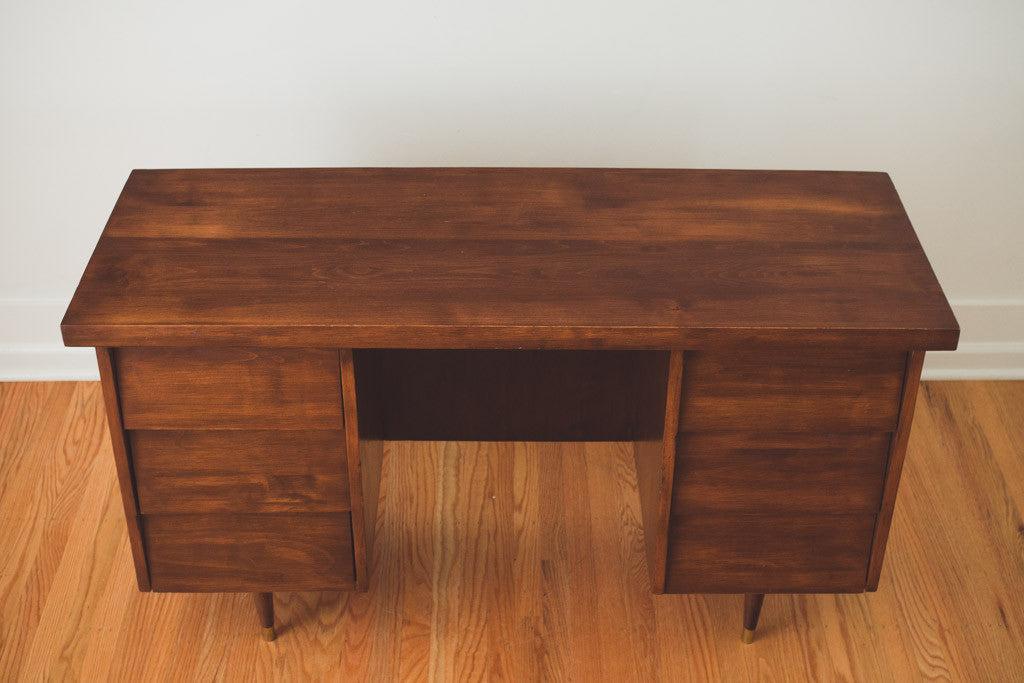 This Mid Century six drawer desk is dark walnut with recessed pulls and a wood top. It's in good shape with age related wear. It has a finished back, so it could also be used as a room divider or in an office. See pictures for detailed condition.