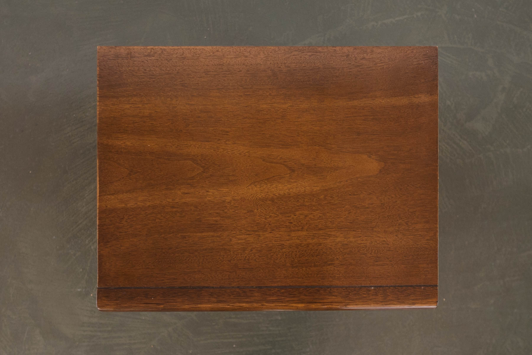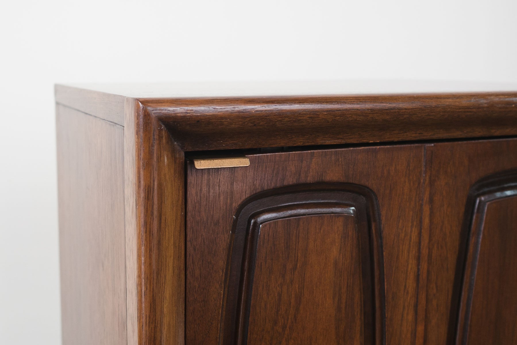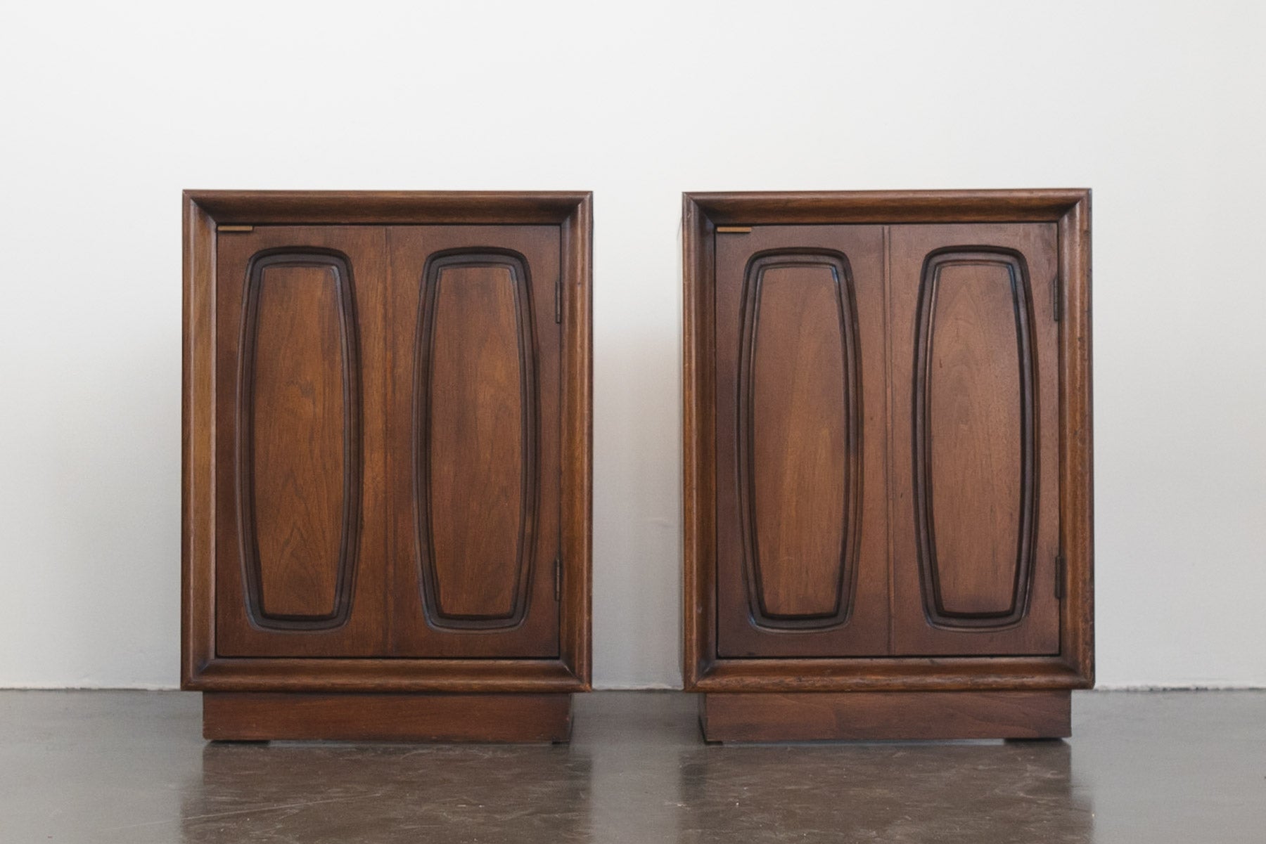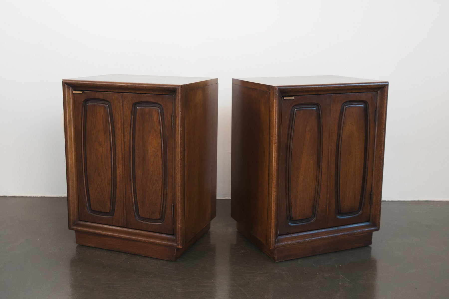 style: pair, modern, nightstands, storage, cabinets, side tables material: wood (walnut) brand: Broyhill, Emphasis Collection age: vintage, Mid Century condition: good, age related wear - see pictures other: priced as a set