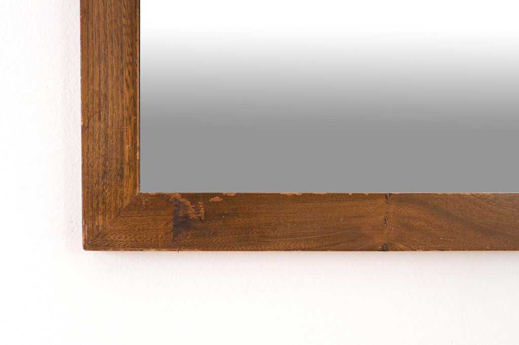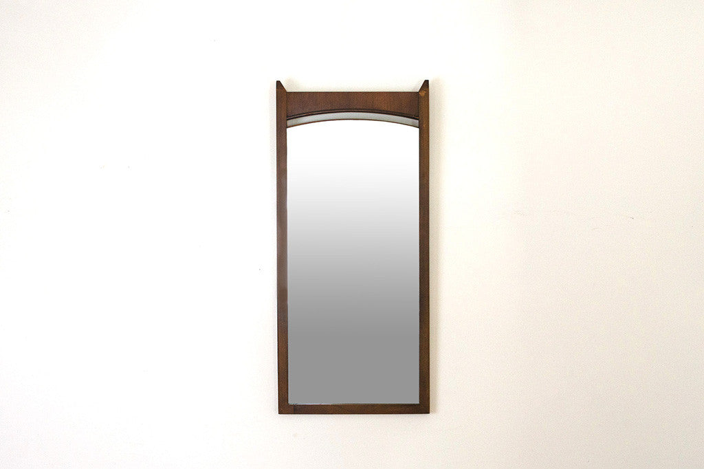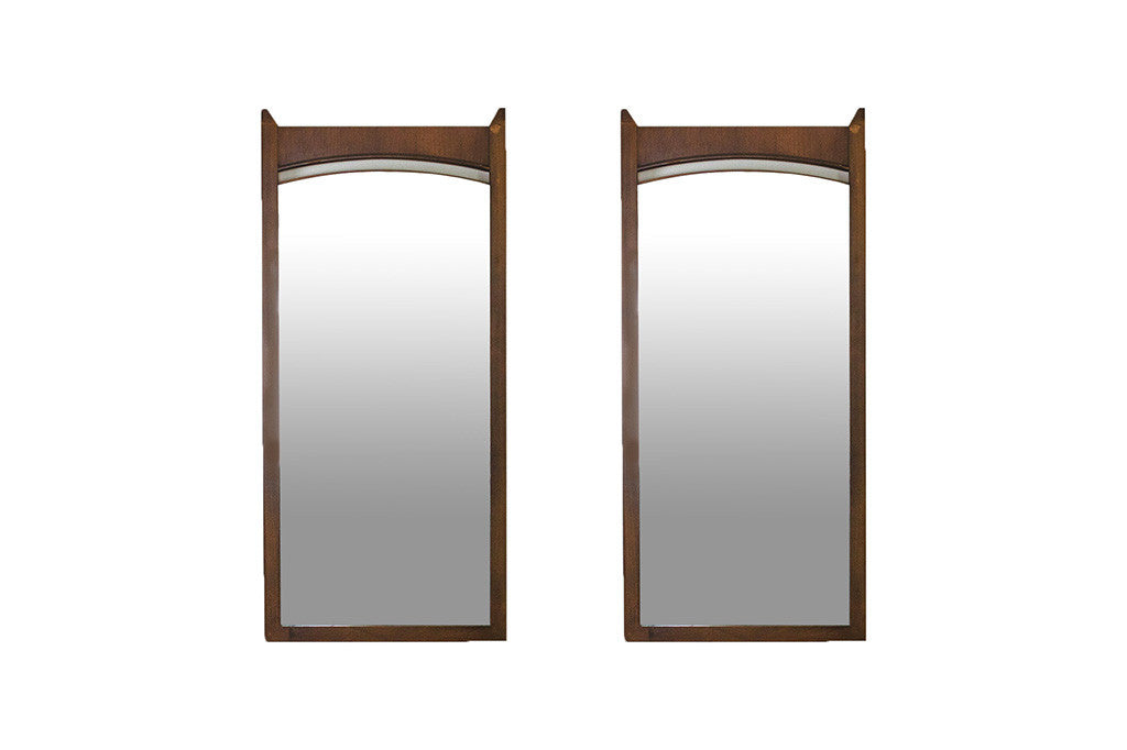 This pair of Mid Century mirrors were quite a find. They have dark walnut frames and the mirrors themselves are in good shape. One of the mirrors has some light wear spots in the top left glass and the other has a very small spot in the middle.