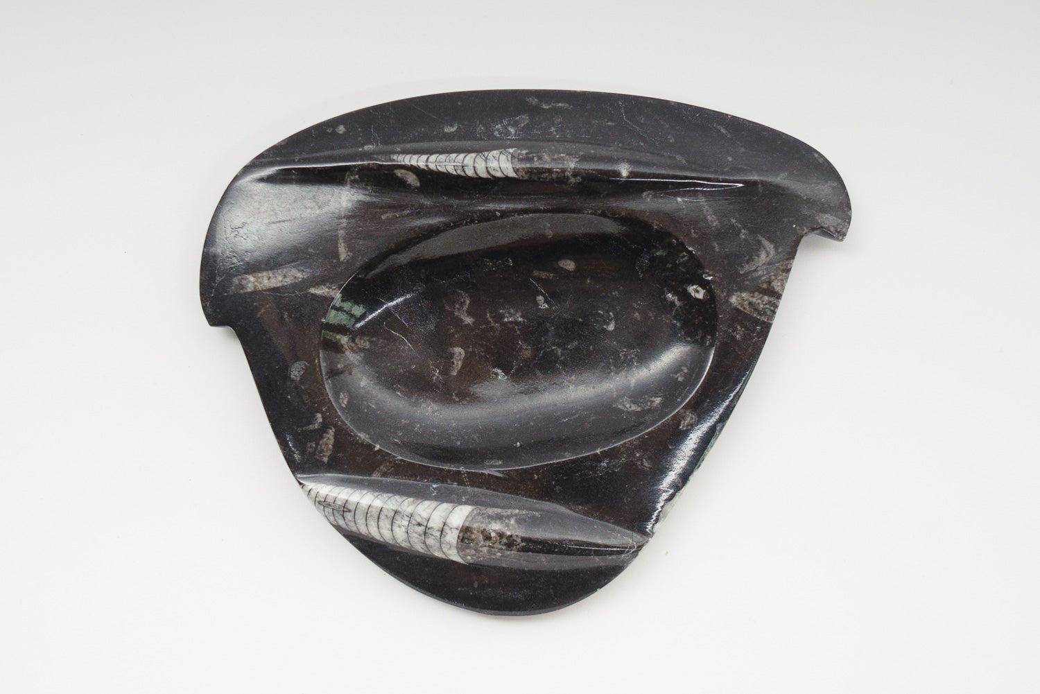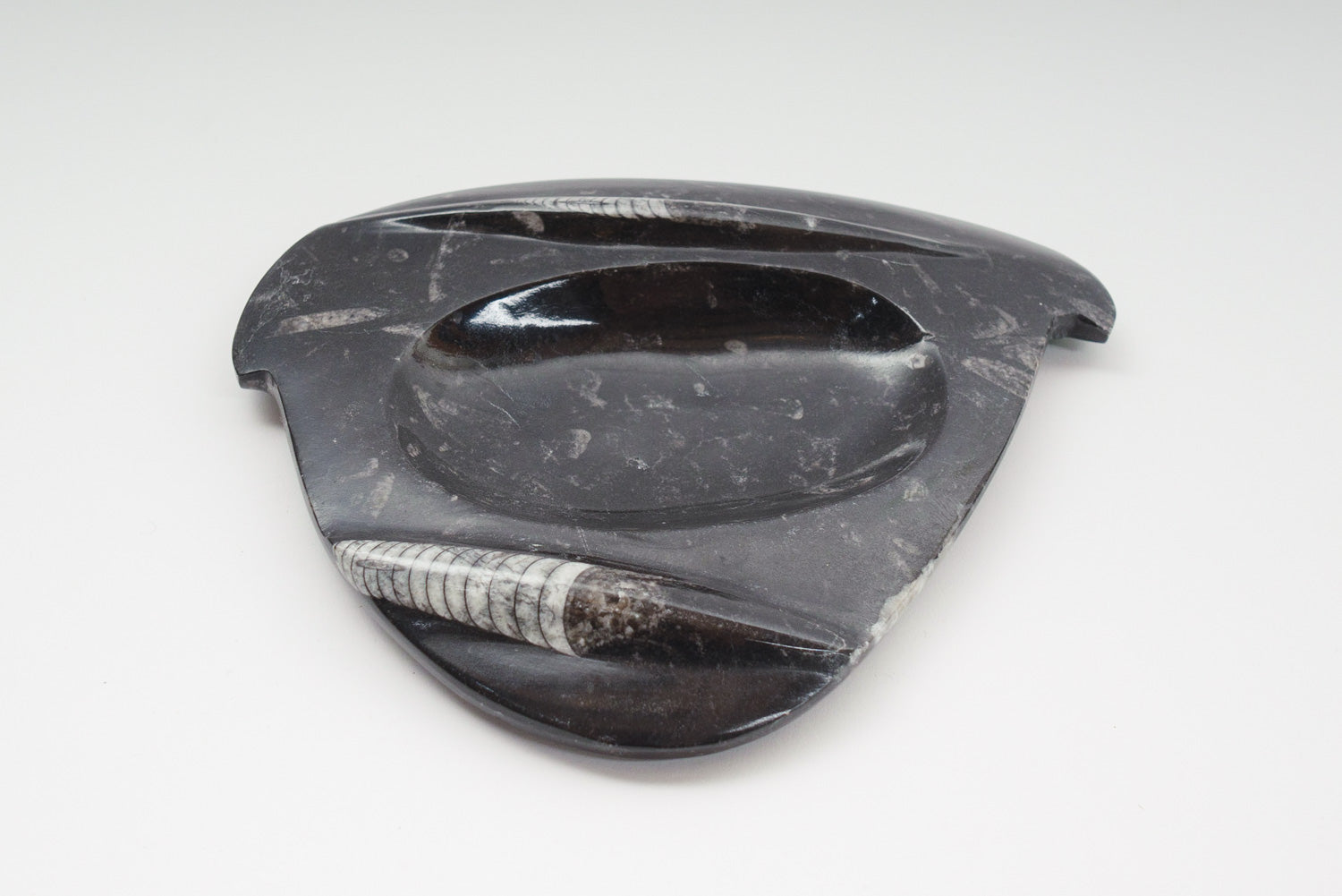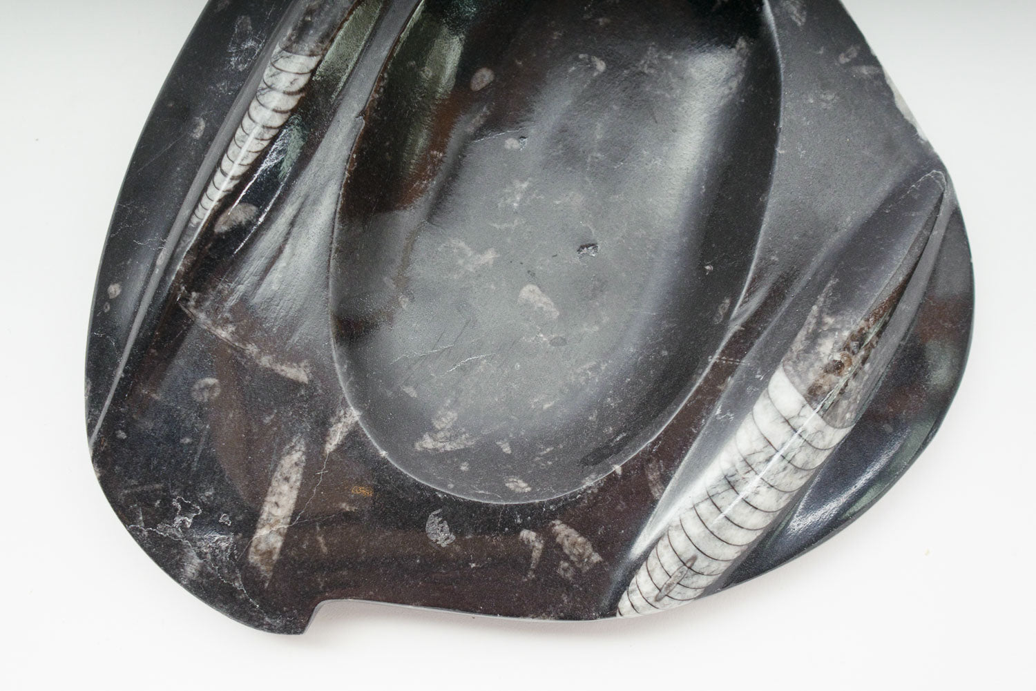 material: carved stone, Orthoceras fossil (extinct cephalopod)