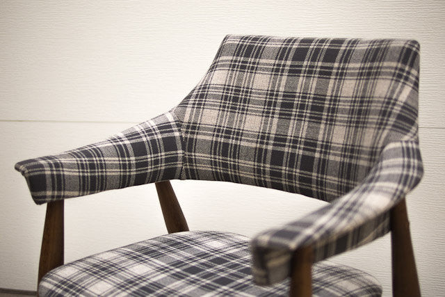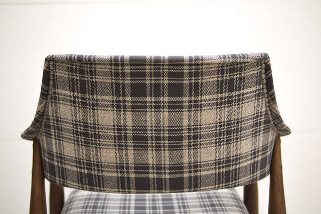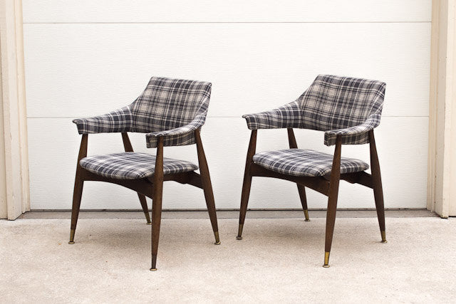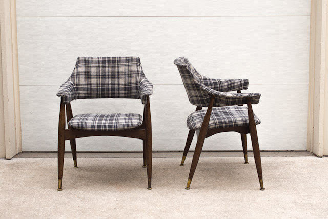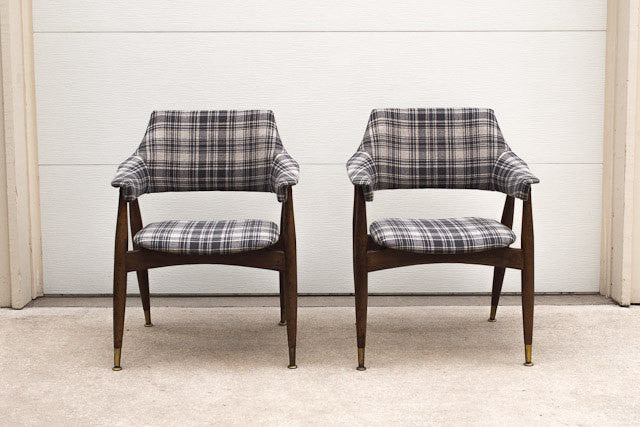 We had this set of Mid Century arm chairs reupholstered in a vintage grey plaid tweed fabric. They have a floating seat with dark wood legs, brass feet and nailhead detail along the back. They are very sturdy and the curved back design makes them extremely comfortable.