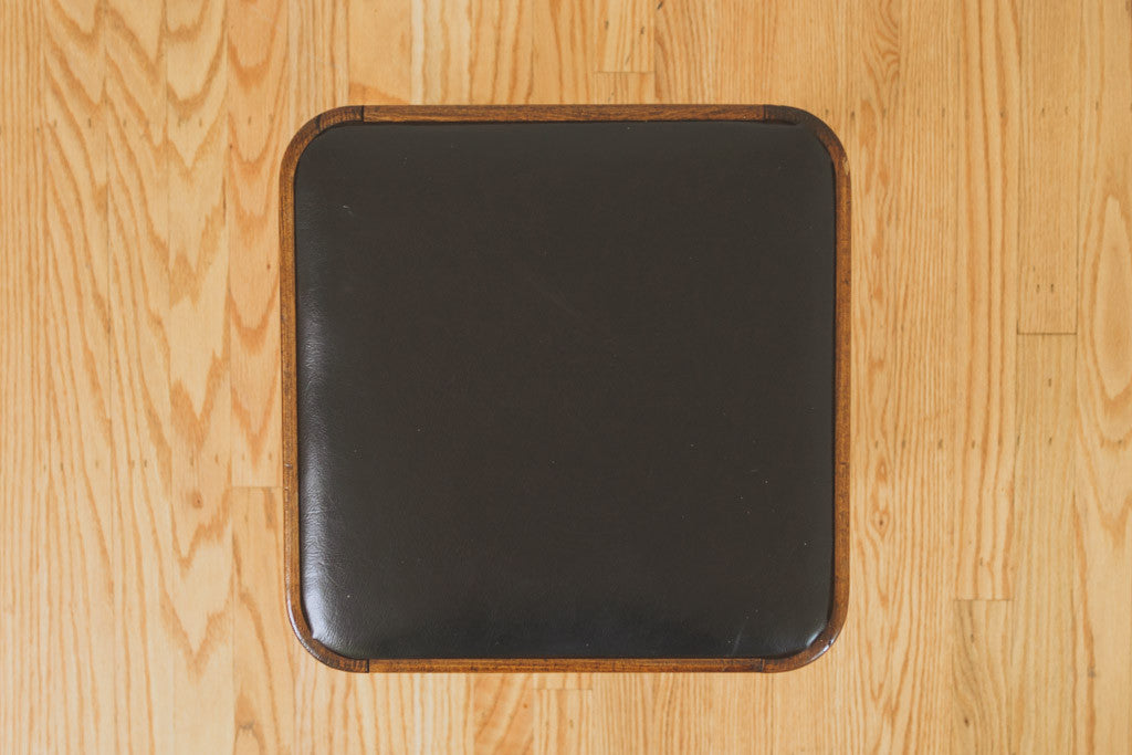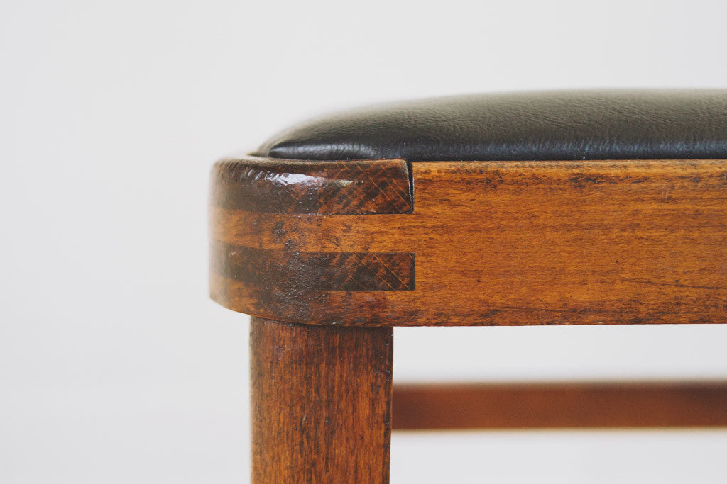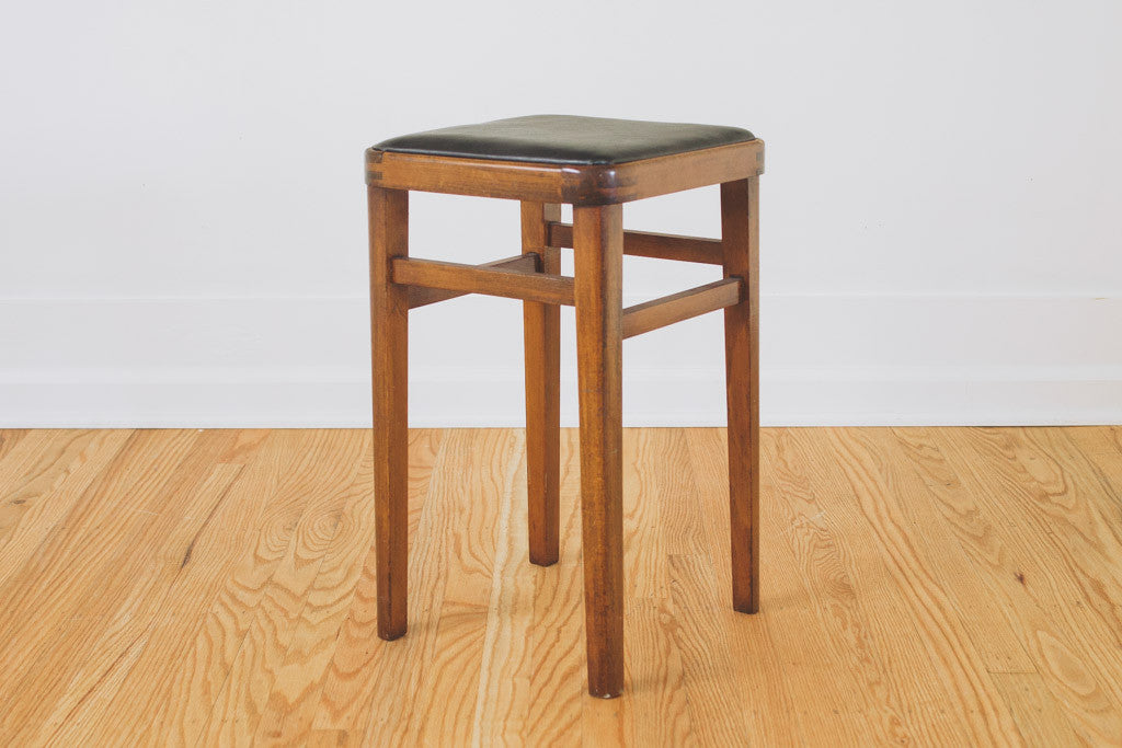This Mid Century stool was made in England. It has a black naugahyde seat and oak frame. It's in good shape with age related wear.