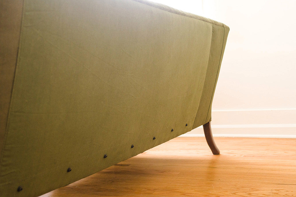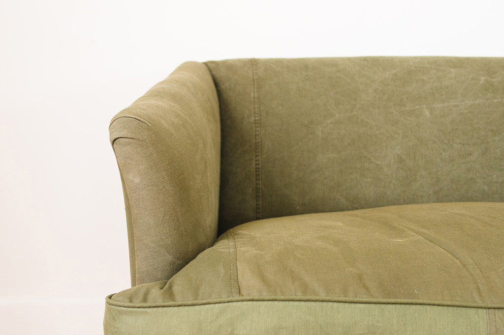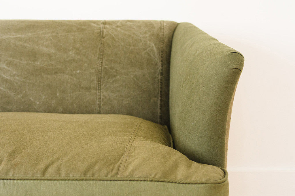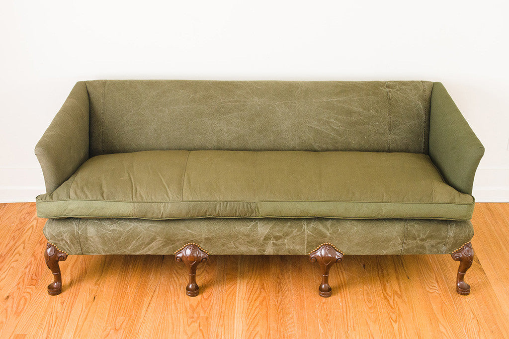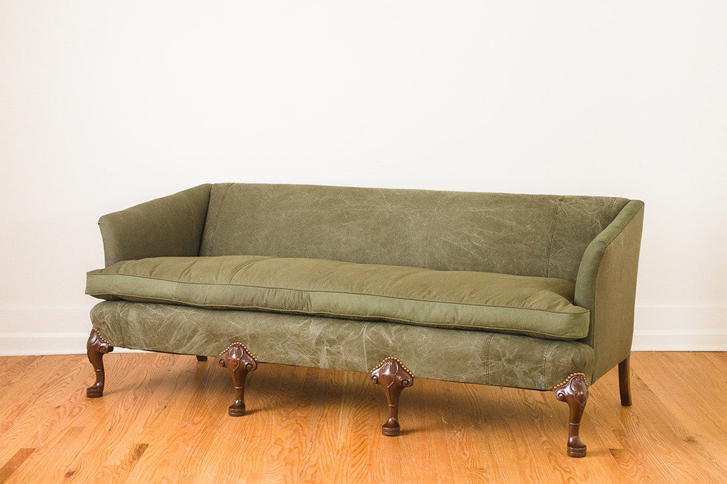 This antique clawfoot sofa was reupholstered in vintage military canvas. It has a down-filled bench cushion, brass nailhead accents and wood cabriole style legs. It was internally restored with eight way hand tied springs. It's comfortable and big enough to nap on. Please see pictures for detailed condition of this piece.