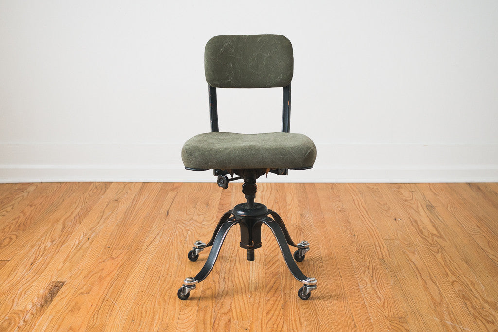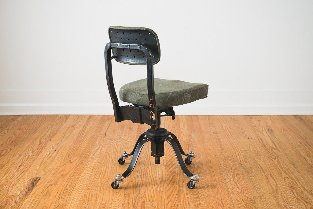 style: Mid Century, industrial, adjustable rolling desk chair material: military tent canvas, metal frame info: Remington Rand age: vintage, reupholstered condition: good, age related wear - see pictures