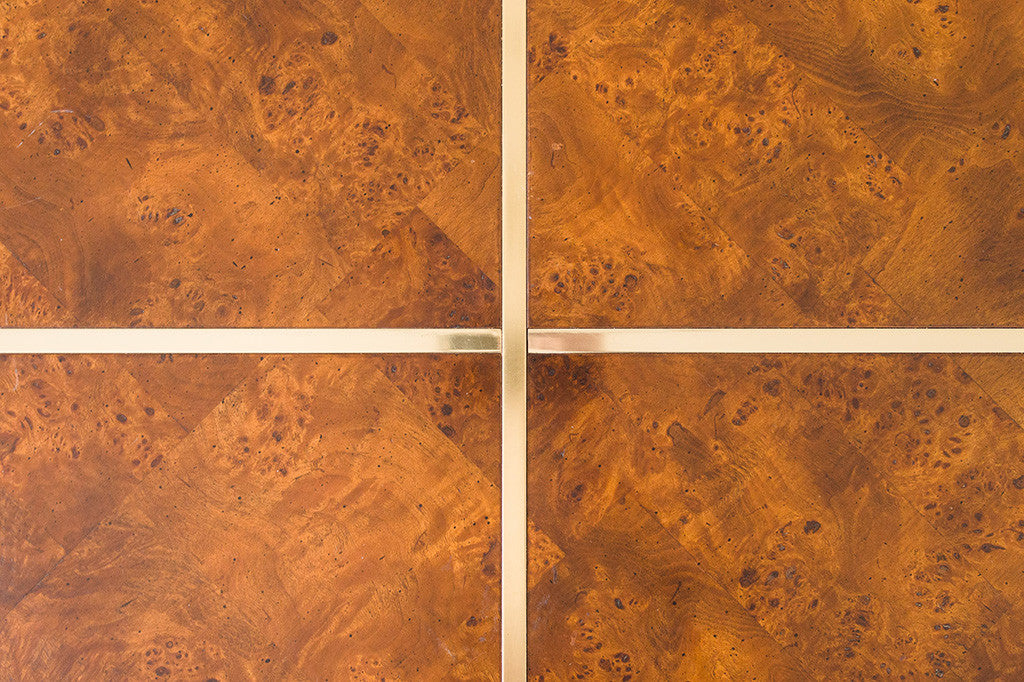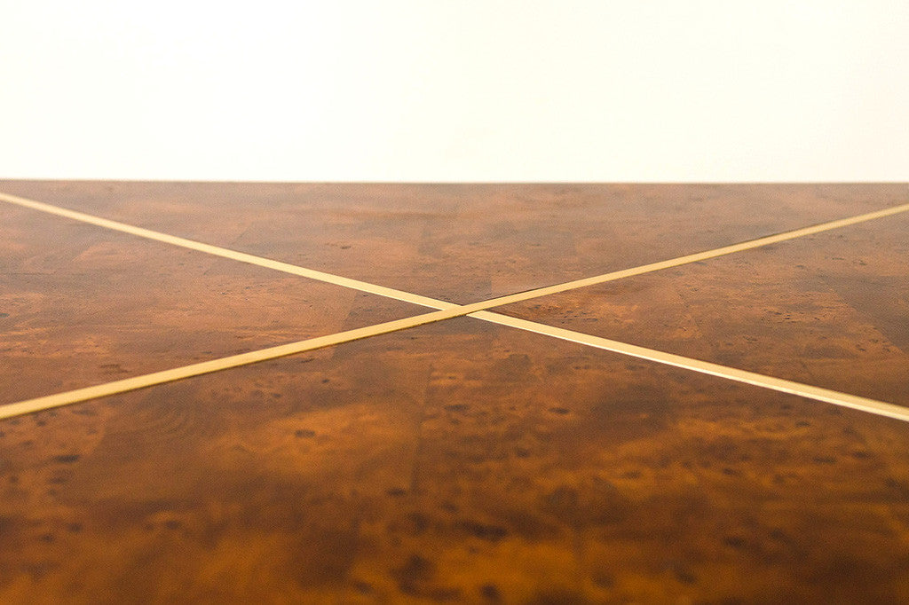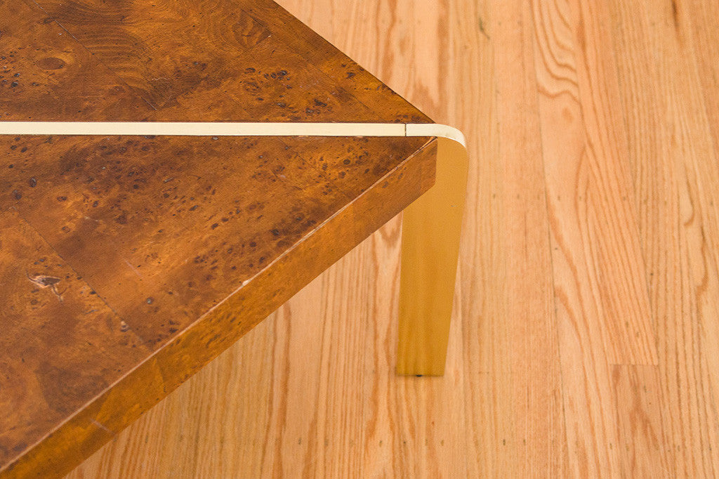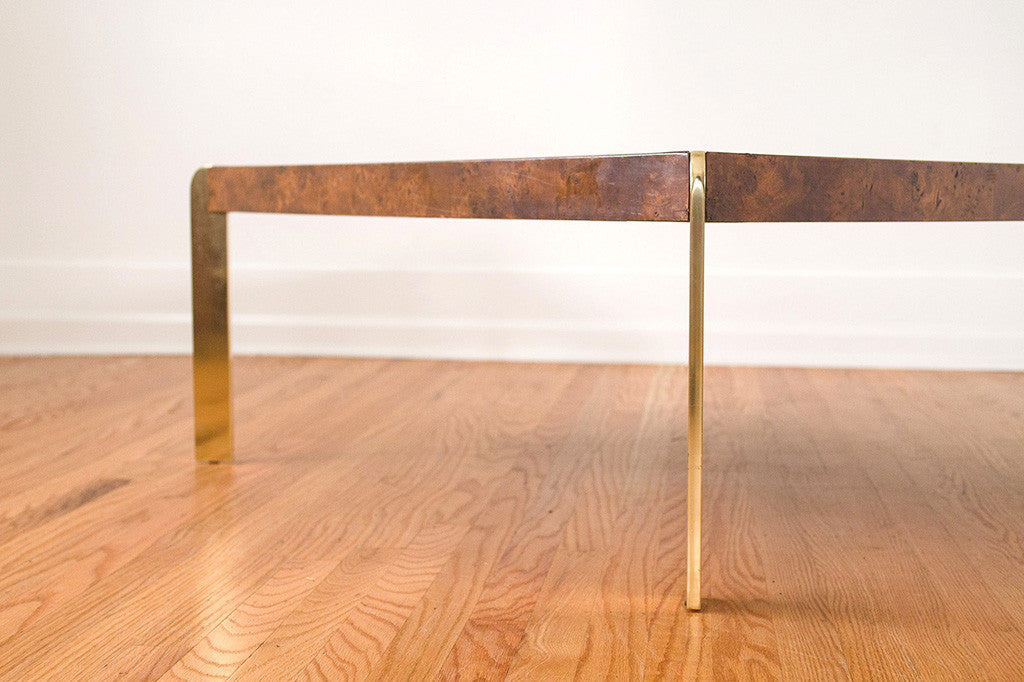 This Mid Century Milo Baughman coffee table was an incredible fine. We haven't seen another one of this style for sale anywhere. It's a perfect square with burlwood veneer with a brass inlay and brass legs. It's in great shape with some light age related wear to the edges and legs. Please see pictures for detailed condition of this piece.