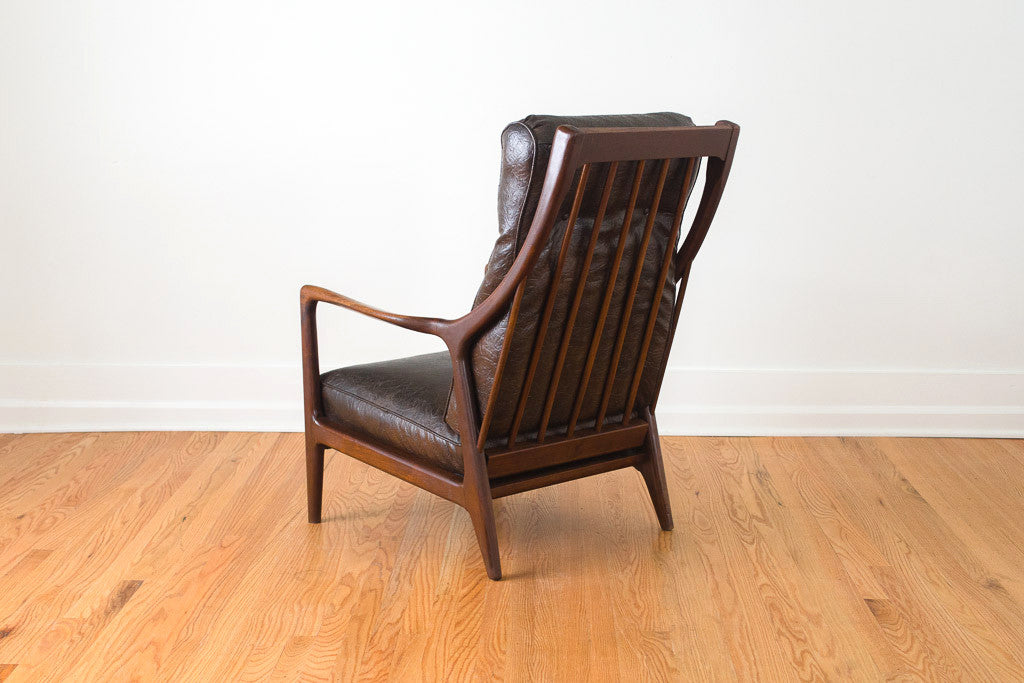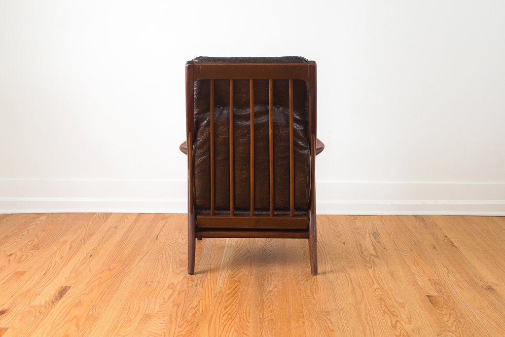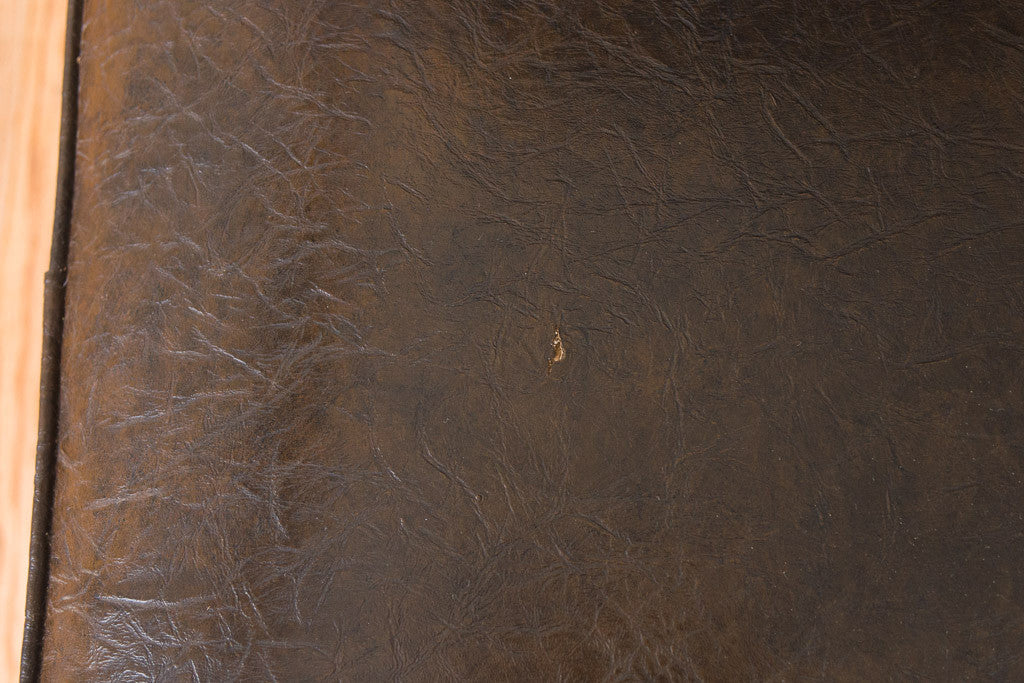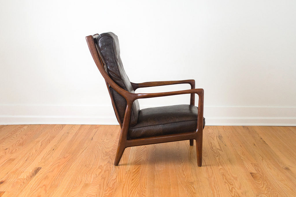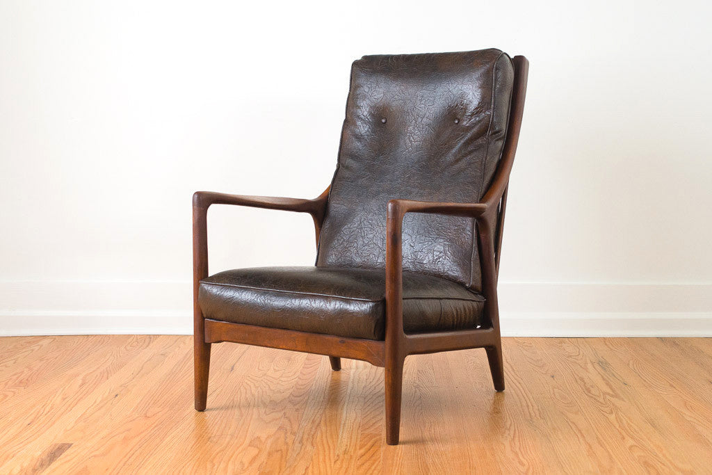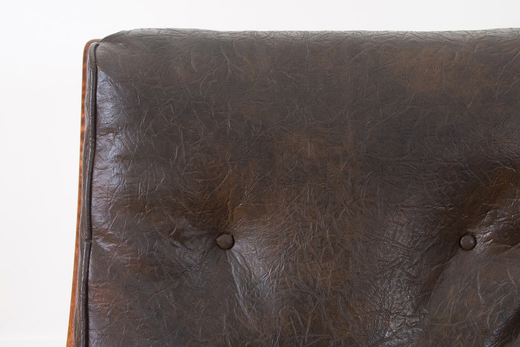 This Mid Century reclining chair is upholstered in textured brown Naugahyde.