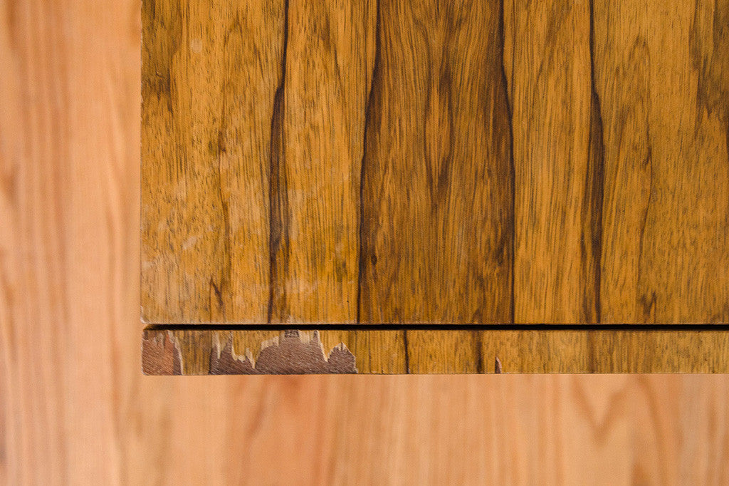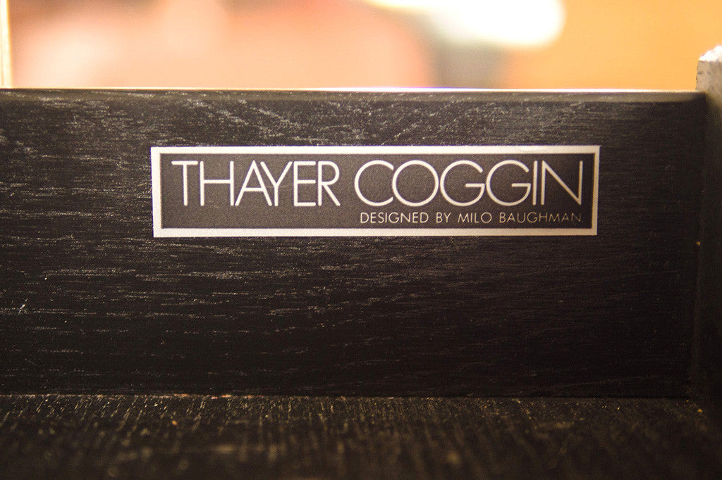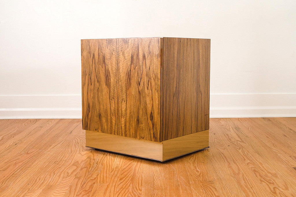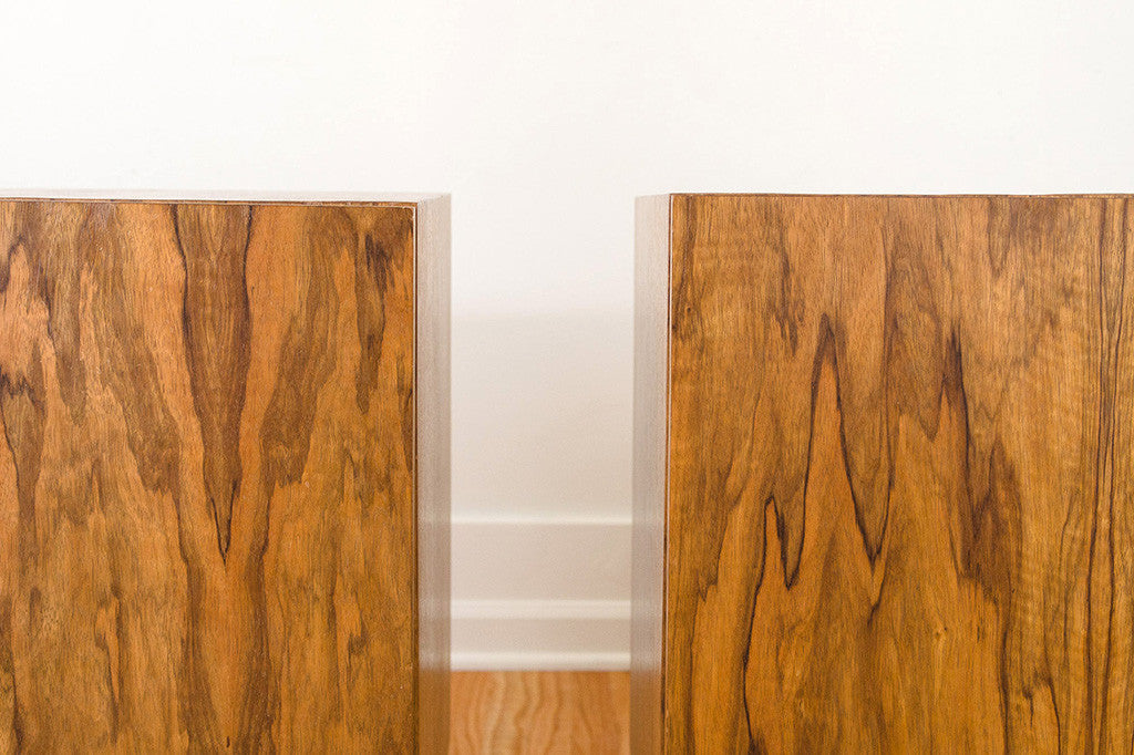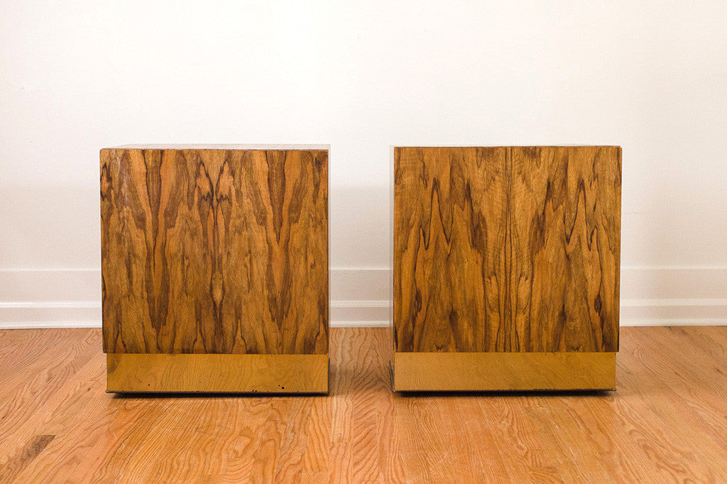 These vintage Hollywood Regency style nightstands were designed by Milo Baughman and manufactured by Thayer Coggin. They're a cube minimalist style with a rosewood exterior, brass base and interior storage drawer. These pieces have wood tops and are in overall good shape with some age related wear including small chips in the finish and a spotting on the base. The listed price is for the pair. Please see pictures for detailed condition of these pieces.
