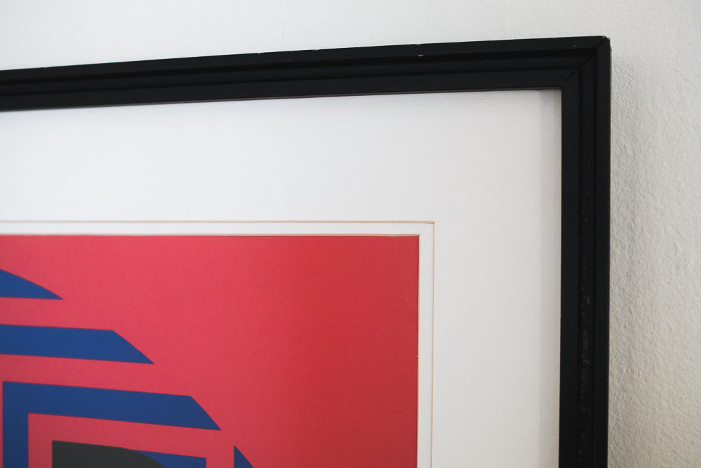 style: Mid Century, Mod, black, blue, red and white, geometric, minimalist