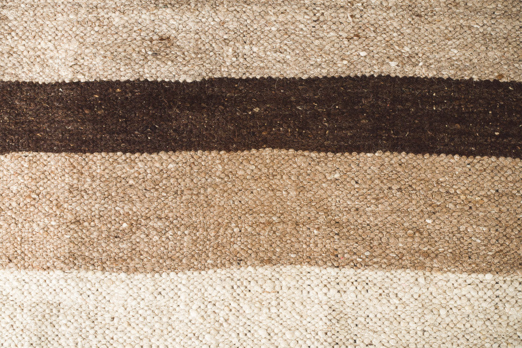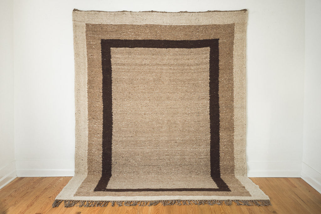 This vintage Moroccan hand knotted wool rug has a cream base with brown and tan accents. It's in good shape with age related wear. See pictures for detailed condition.