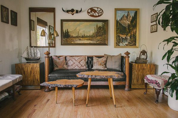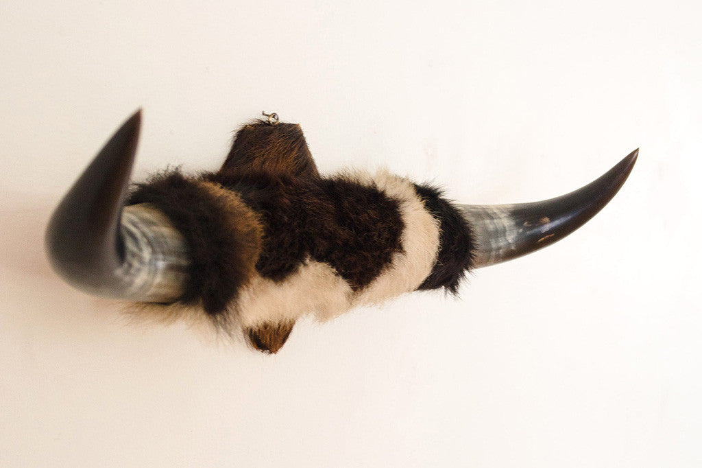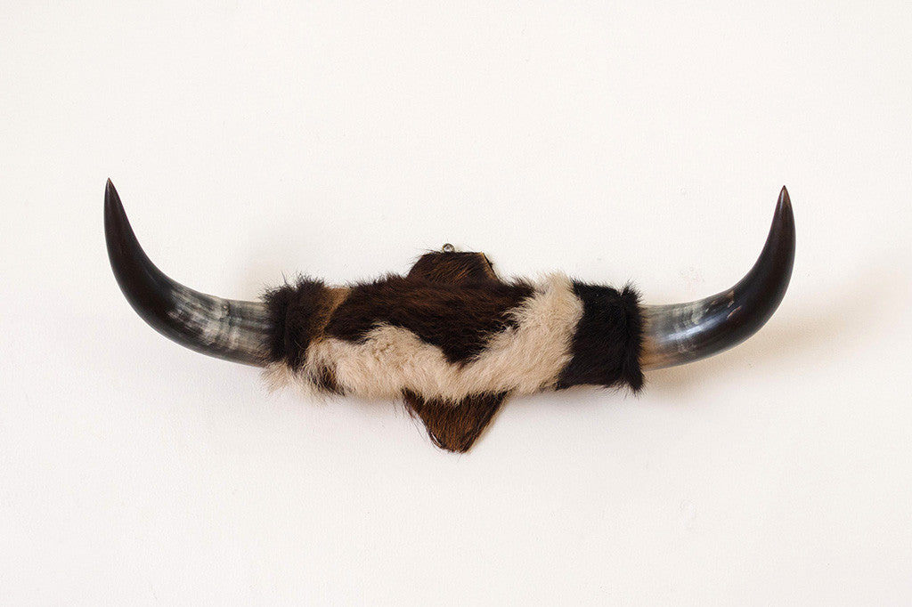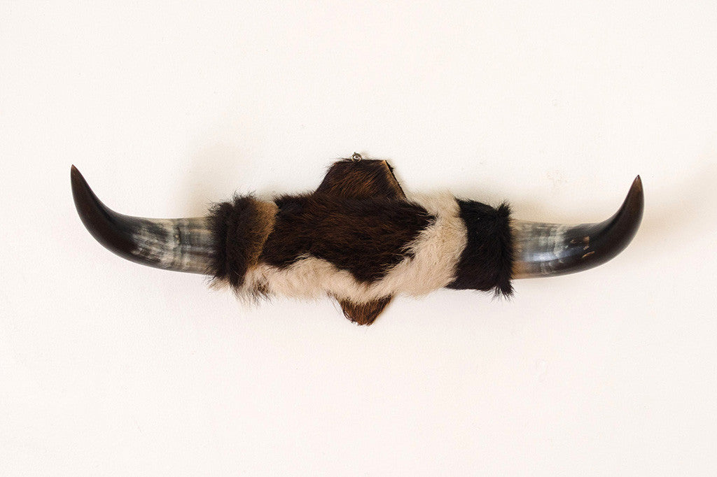This is a vintage set of mounted bullhorns. They are mounted on a shield-shaped plaque. The mount and center are wrapped in a section of brown and white cowhide. They're in great shape with age appropriate wear. They would make a great coat, hat or towel rack. Please see pictures for detailed condition of this piece.