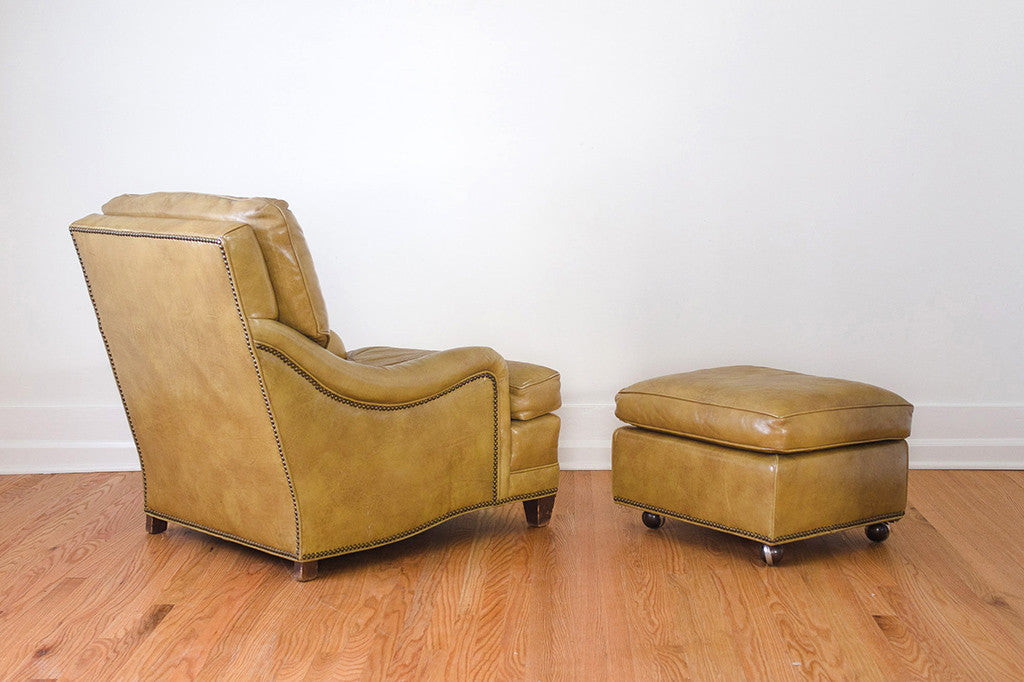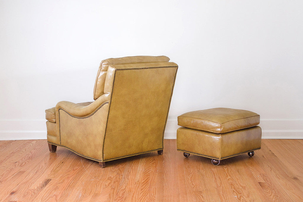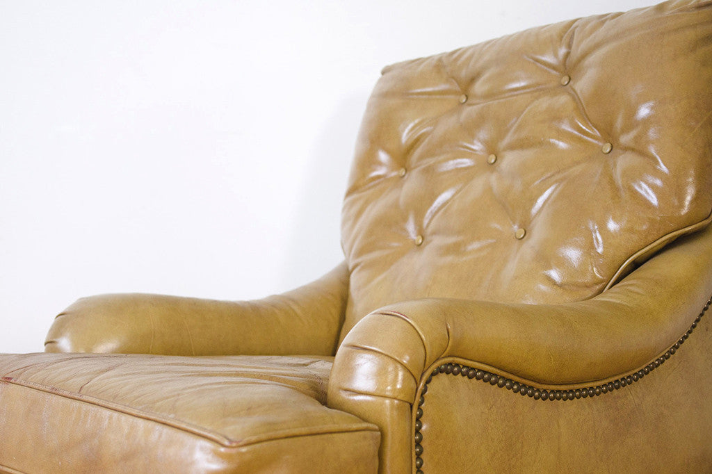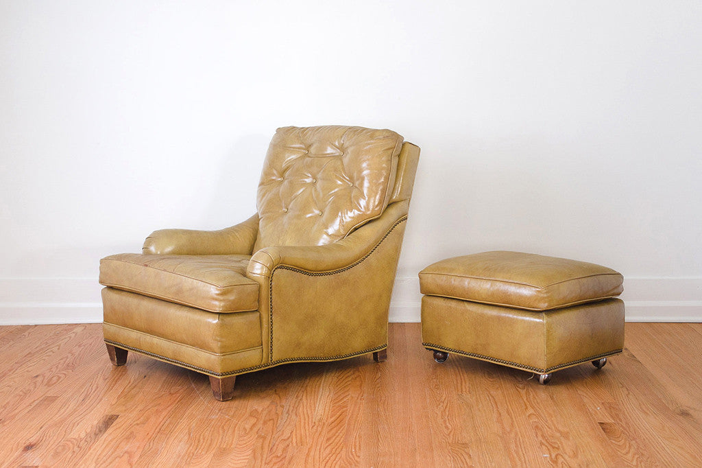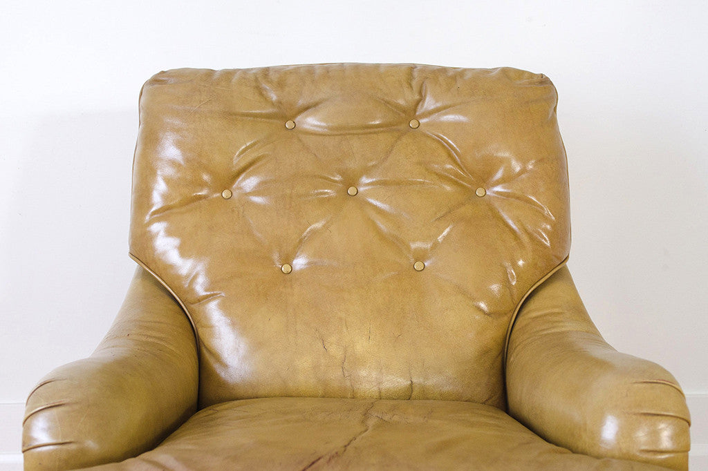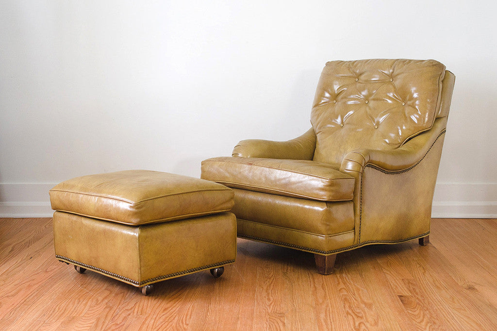 This handsome vintage leather club chair set is unmarked but was most likely made by Schafer Bros. It's a mustard tufted leather English roll arm style chair with nailhead trim and matching ottoman. The leather upholstery is in good overall shape with a heavily distressed finish from years of use, the most wear being on the seat. Please see pictures for detailed condition of this piece.
