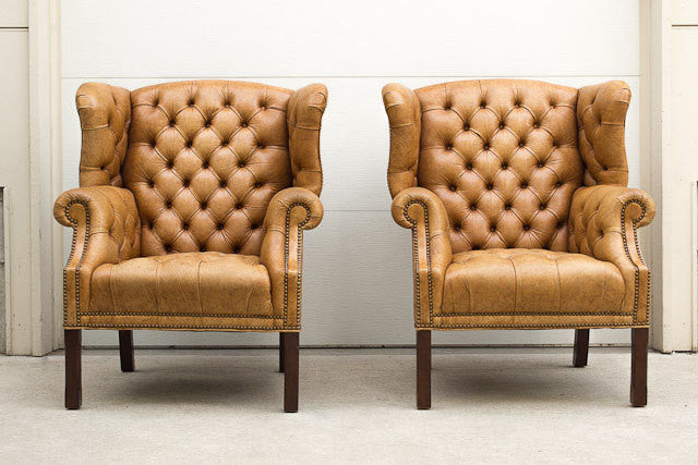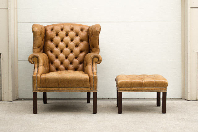 Rare set of vintage tufted leather wingback library chairs with one matching ottoman. This set is upholstered in a very hard to find leather with nailhead trim and dark wood legs. They're sturdy and very comfortable with a moving life story. The leather is in great shape with some distressing and natural wear on the seats. A small tear was professionally repaired on the back of one of the chairs.