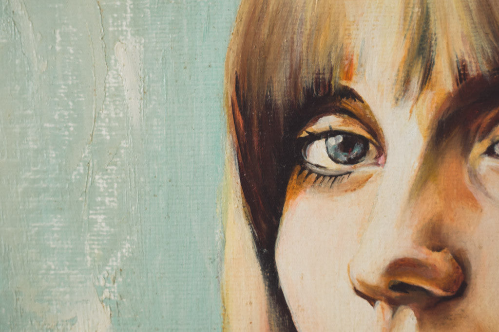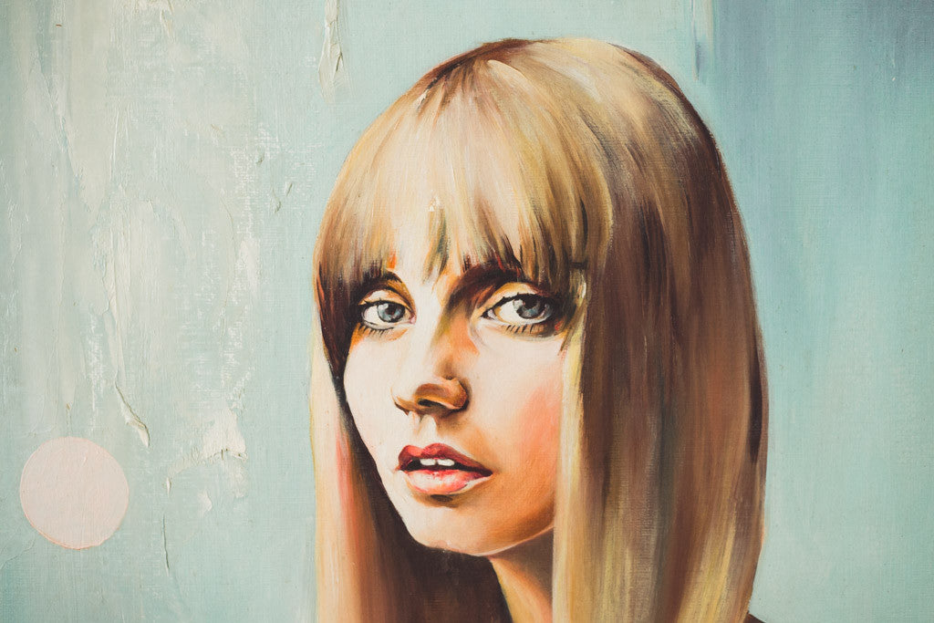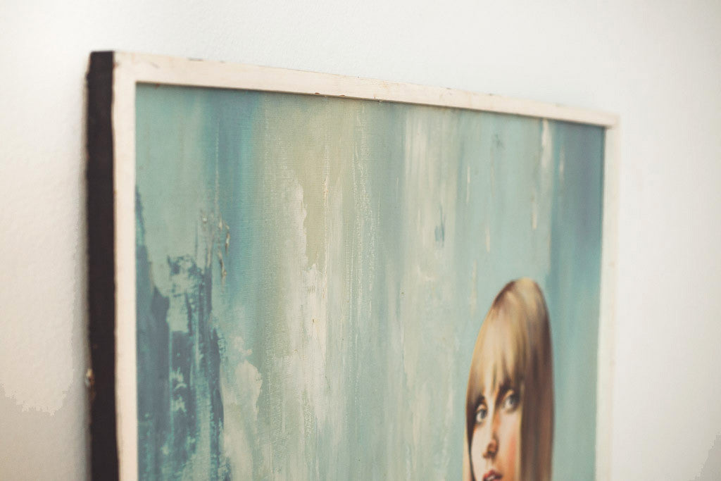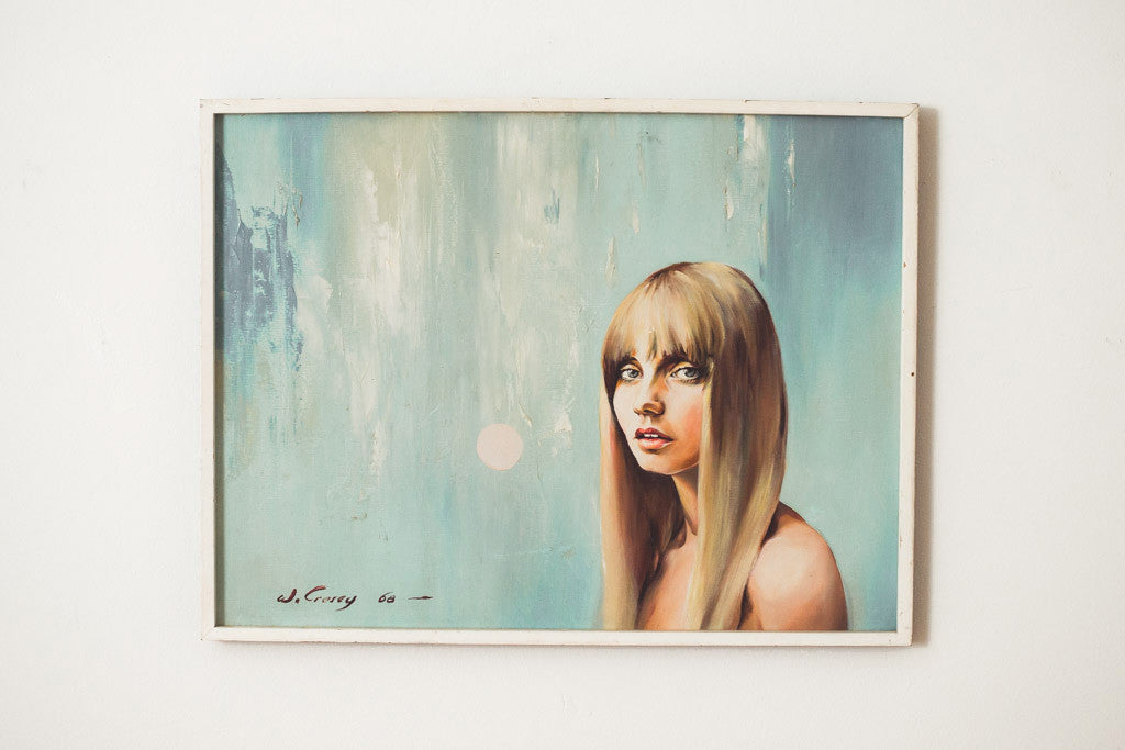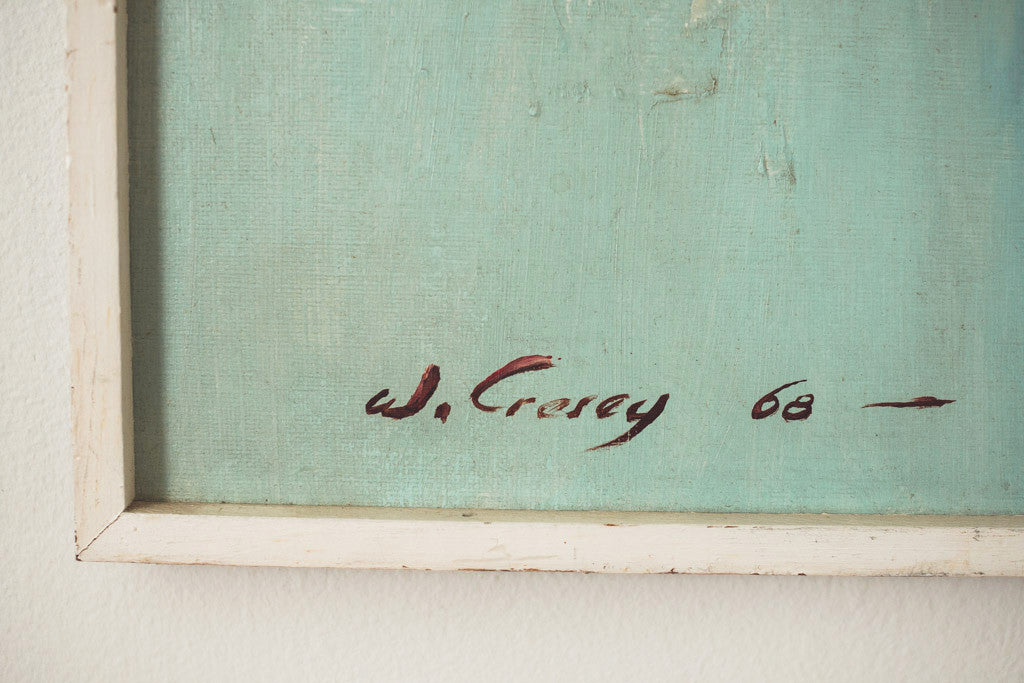 This framed Mid Century oil painting is a portrait of a woman signed, "Walter Cresey 68" titled "In Between". It's in good shape with age related wear, mostly to the fame. See pictures for detailed condition.