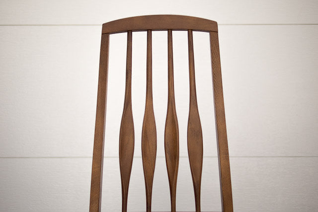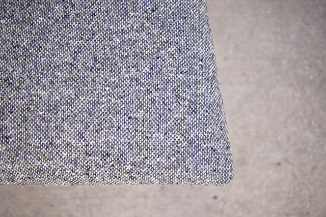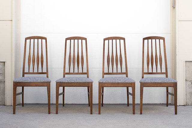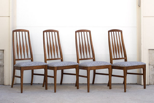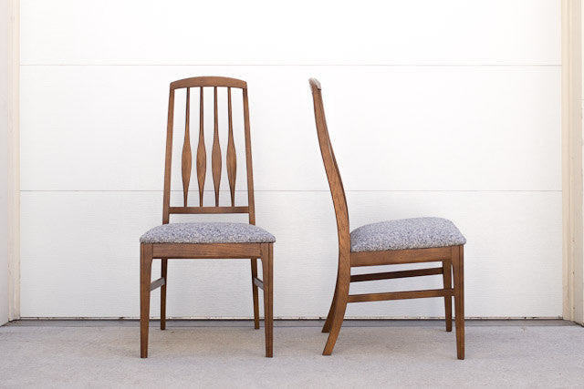This is a handsome set of four custom upholstered dark walnut Mid Century dining chairs. They look very similar to the Niels Koefoed for Hornslet Mobelfabrik "Eva" dining chairs. We had them reupholstered in a vintage gray wool tweed suit fabric. They are in overall excellent condition with minimal surface wear to the wood and very comfortable seats.