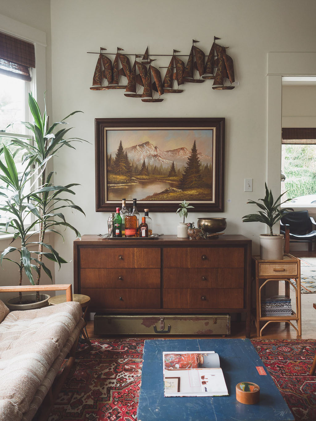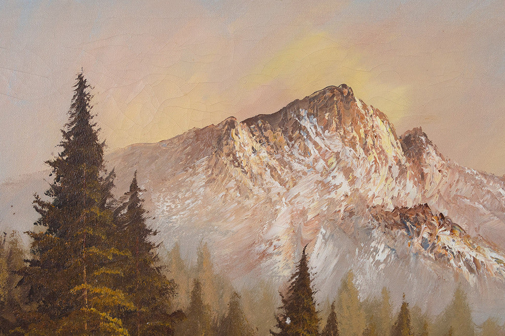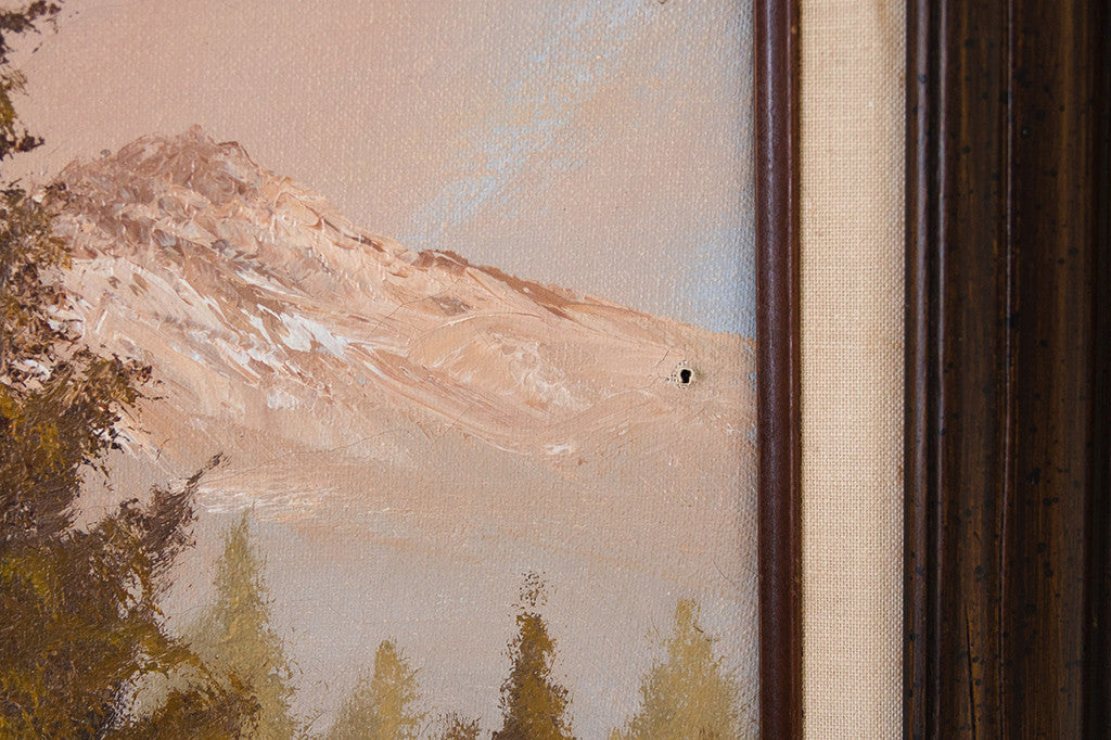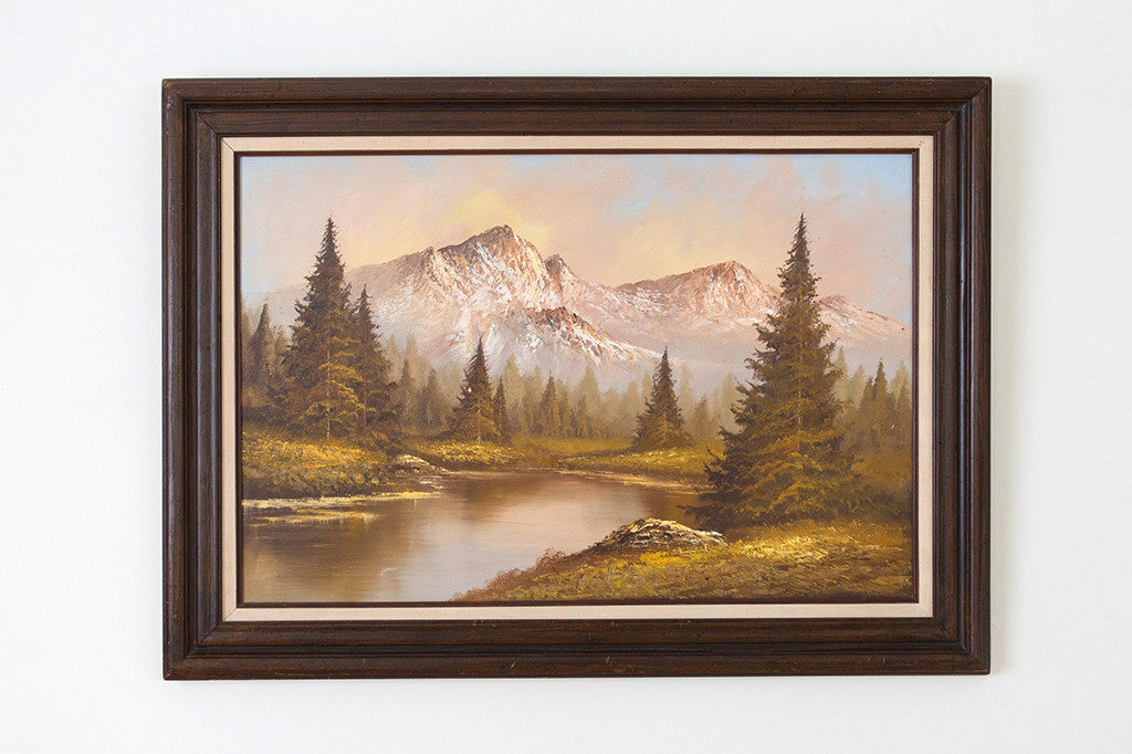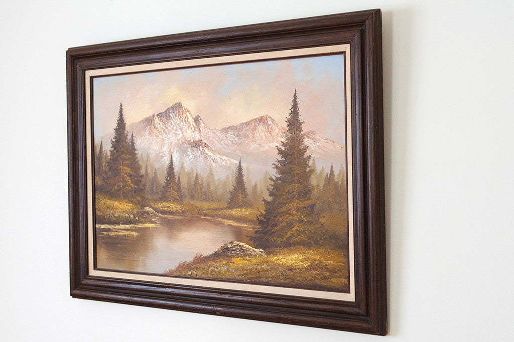 This signed vintage oil painting features large evergreen trees, snow covered mountains and lake. It has a dark wood frame with a cream canvas border. It's in good shape with age related wear. See pictures for detailed condition.