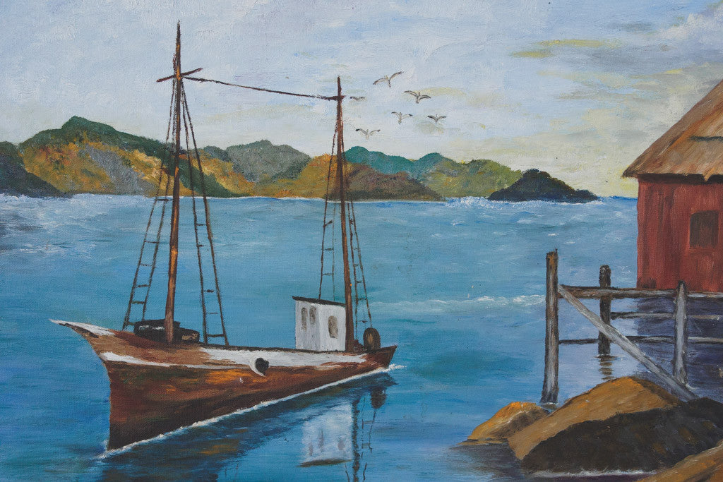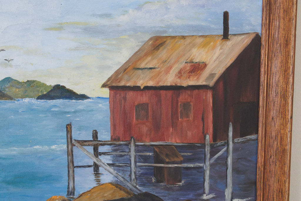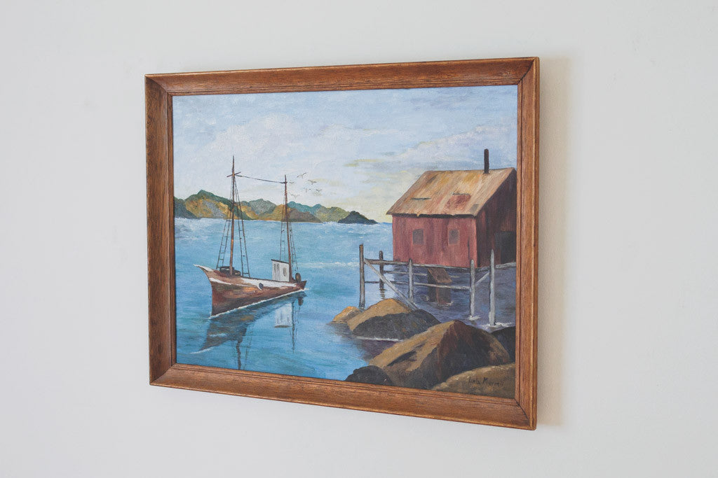 This original nautical oil painting of Nova Scotia is framed and signed, "Lela Murrell". It has a boat and boathouse in the foreground with hills in the background. It's got a great color palette and is in good shape with age related wear. Please see pictures for detailed condition.