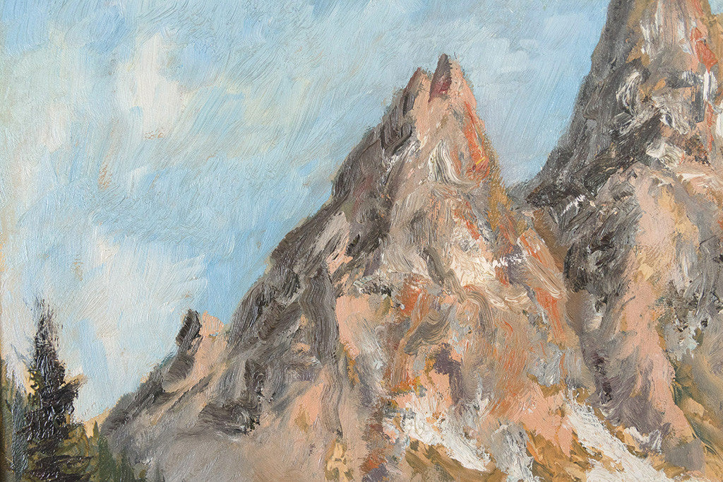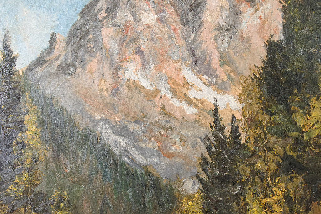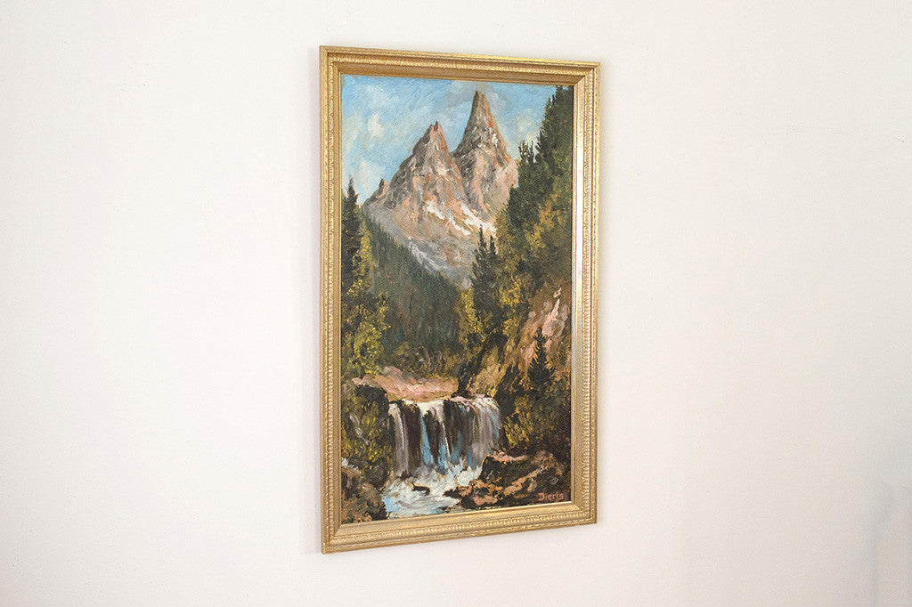 This large framed vintage oil painting is signed, Dierks. It features an outdoor forest scene with a waterfall, evergreen trees and mountains. It's in great overall shape and is ready to hang. Please see pictures for detailed condition of this piece.