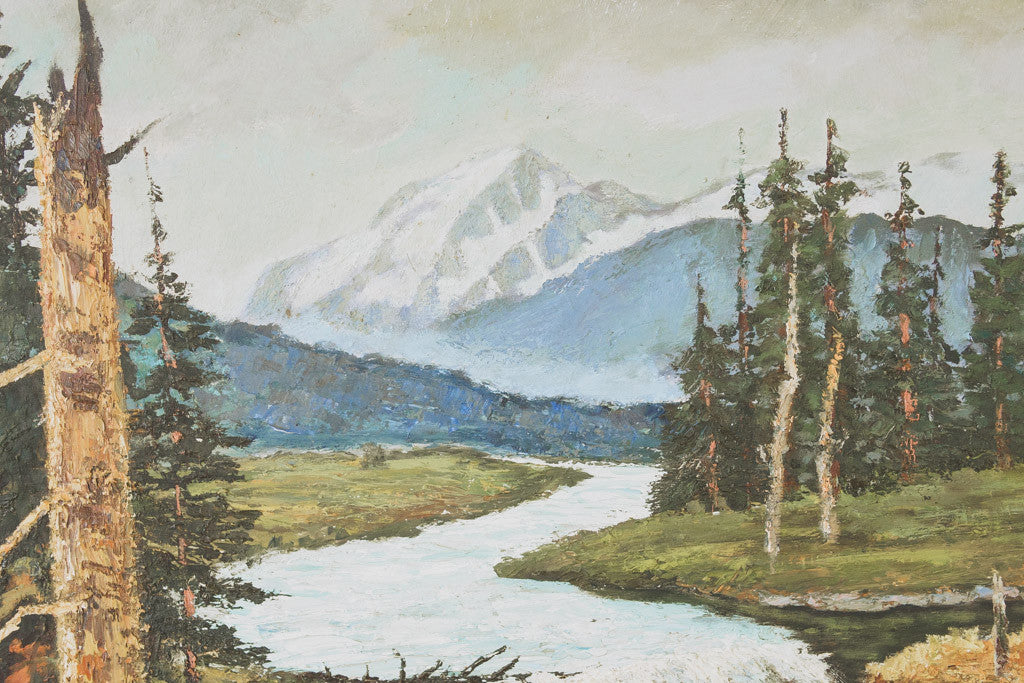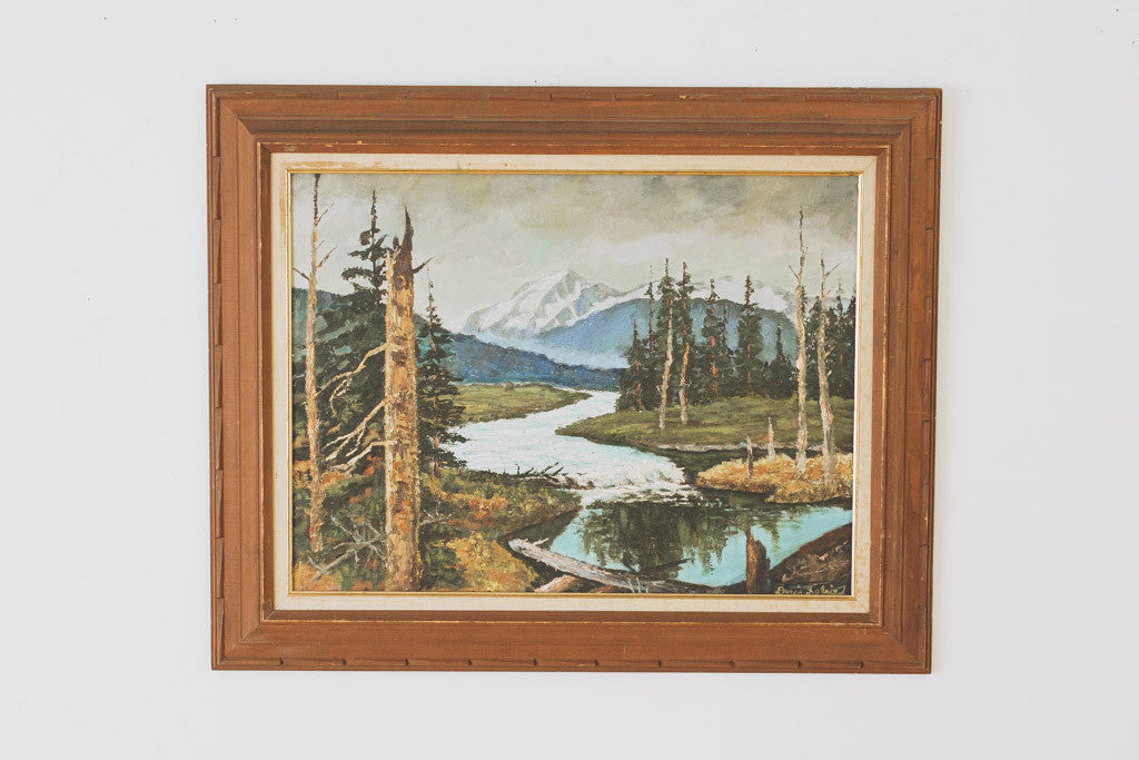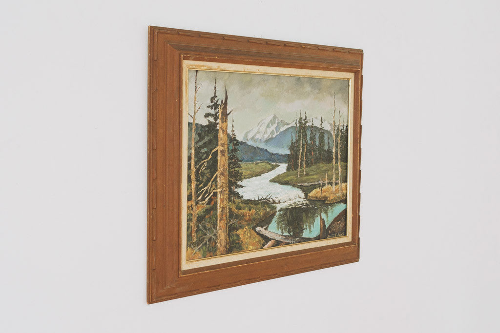 This vintage framed original oil painting is signed by the artist and stamped 'Made in Sweden'. It features a bright outdoor forest scene with evergreen trees, a mountain and river. It's in good shape with age related wear. See pictures for detailed condition.