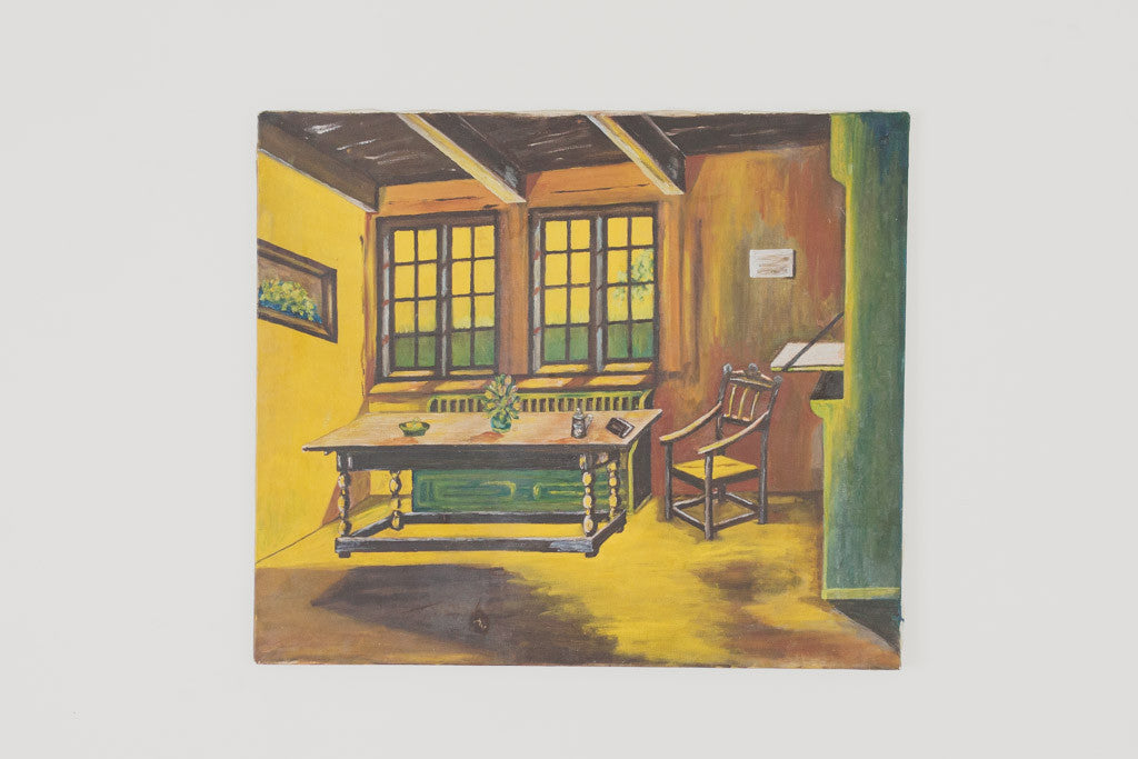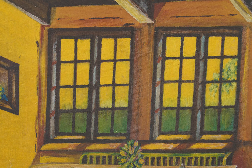 This vintage rustic oil painting is a bright still life of a dining room with a table, chair and large mullioned windows. It's in good overall shape and is ready to hang. Please see pictures for detailed condition.