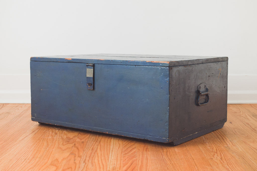This old wood trunk has distressed navy paint. It's in good shape and would make a great coffee table, end of the bed storage piece or side table. See pictures for detailed condition.
