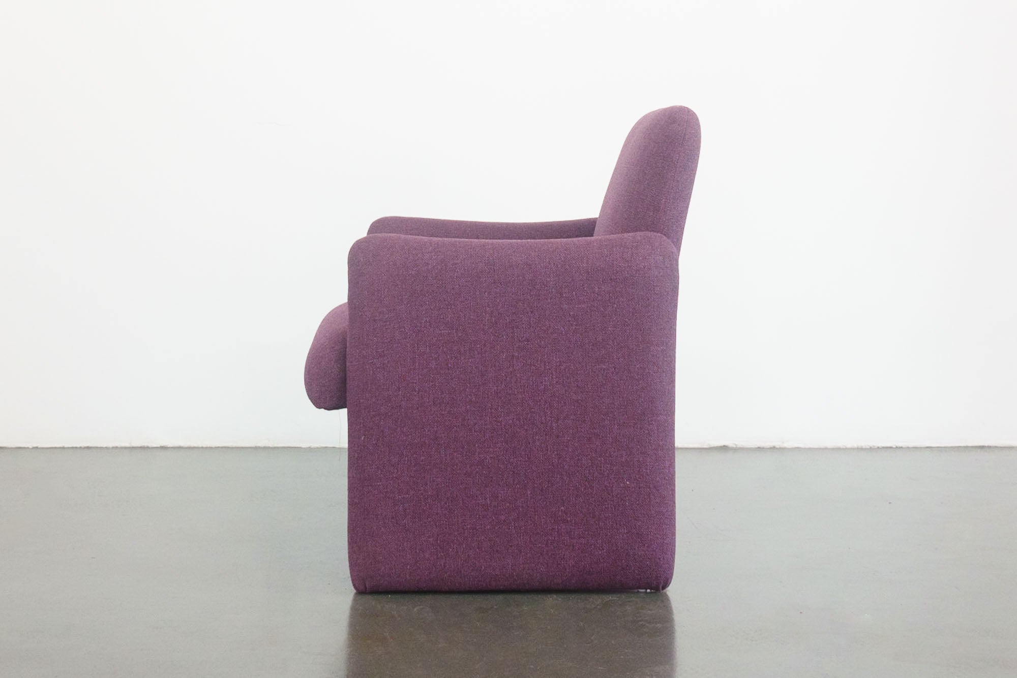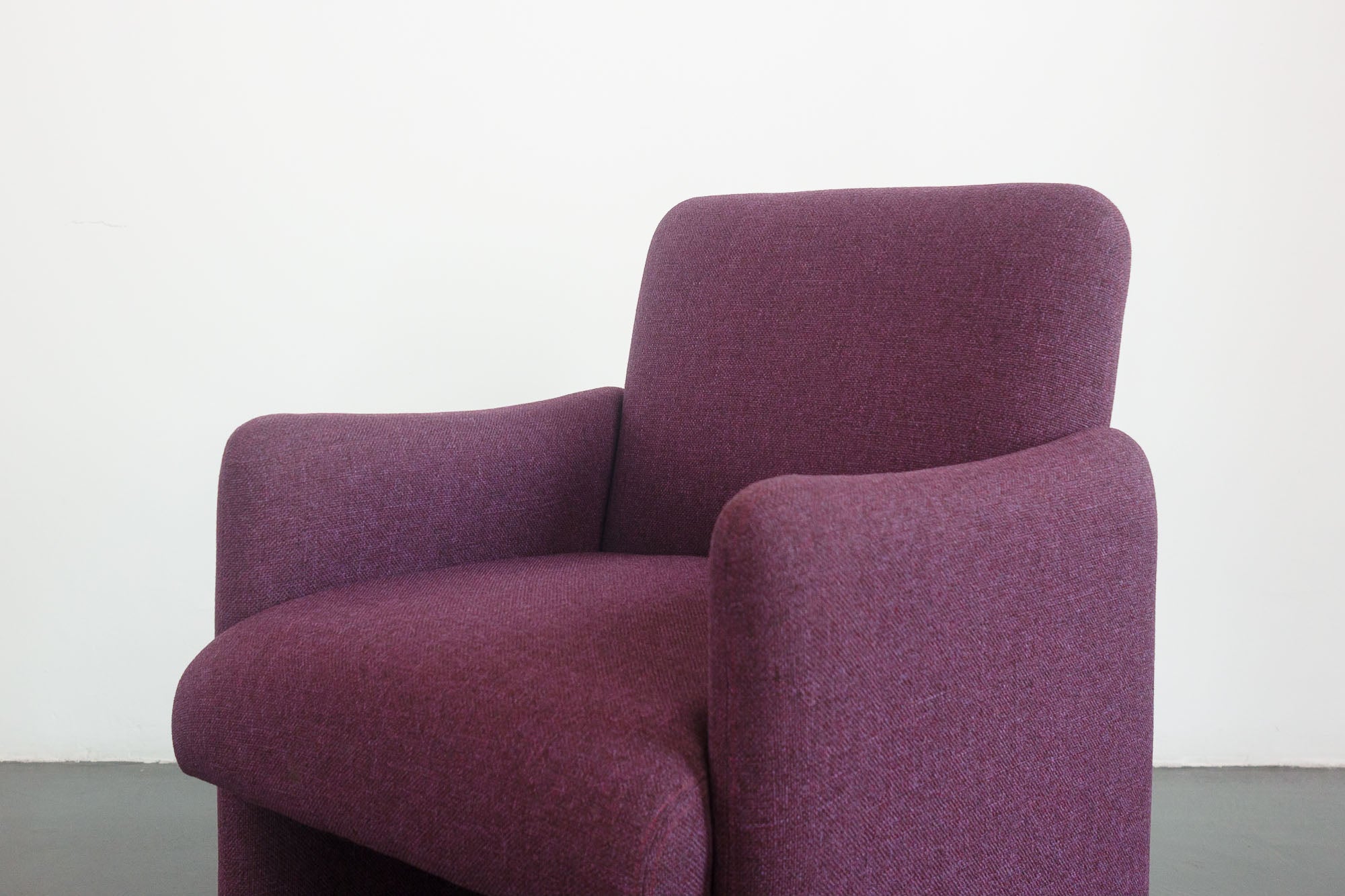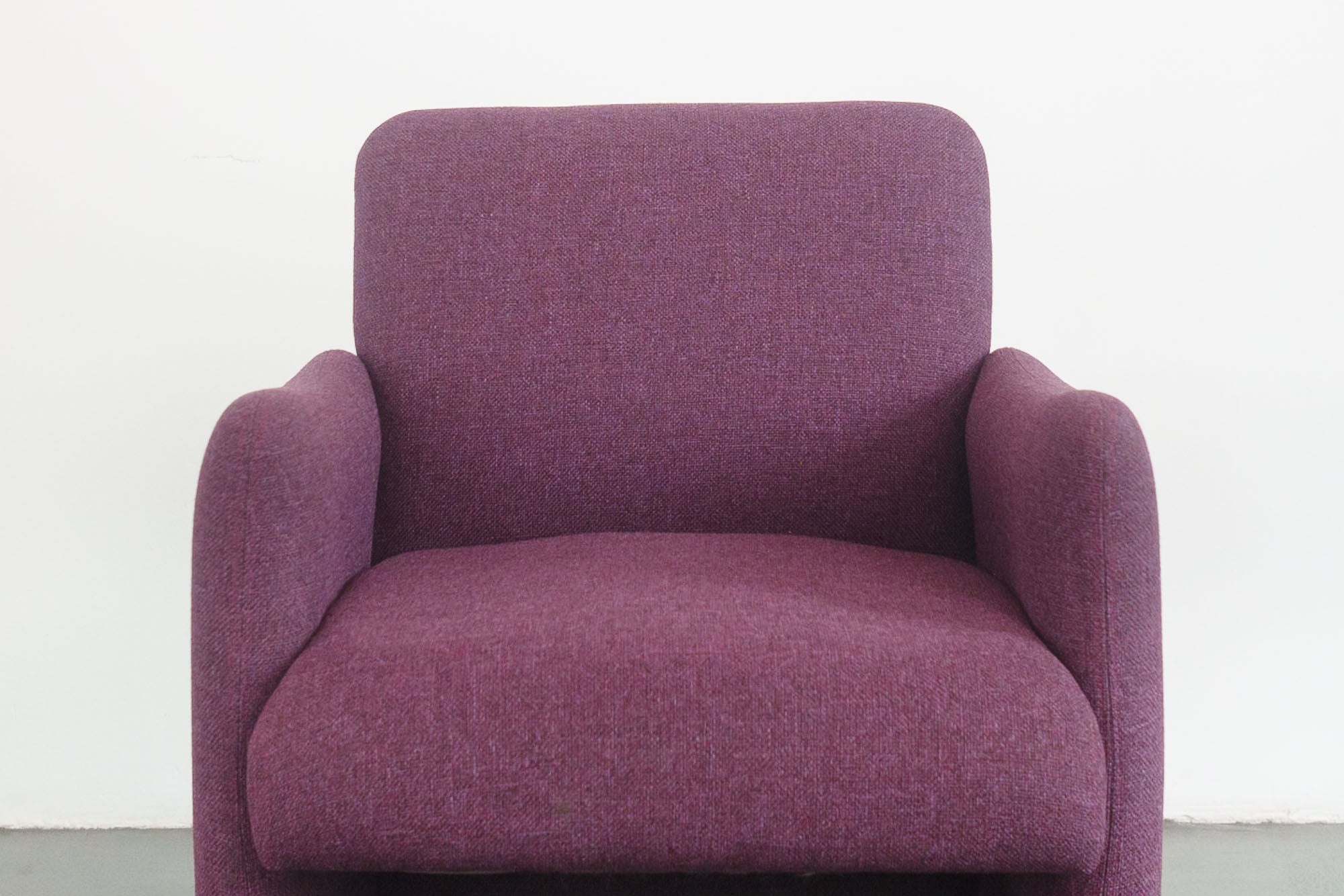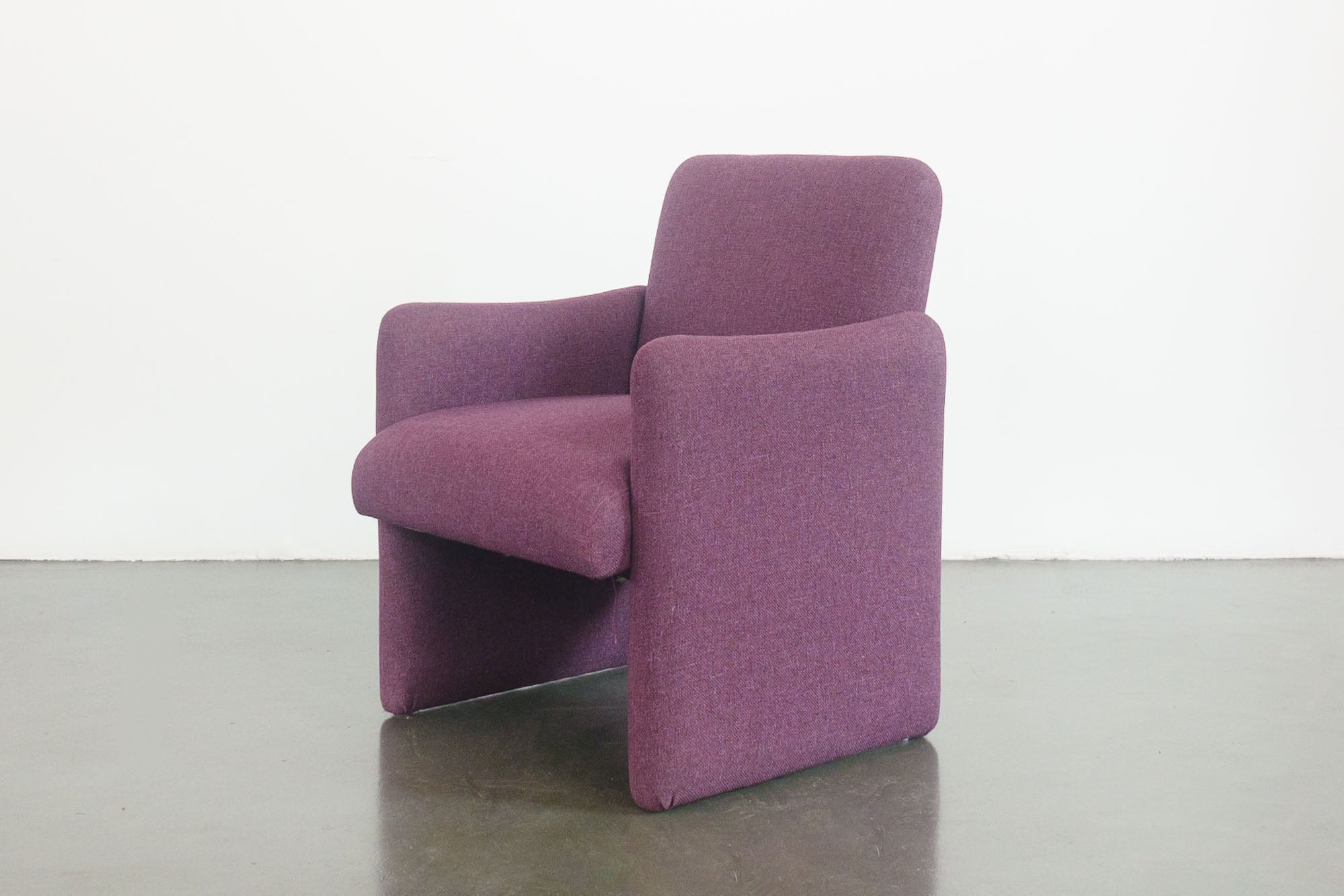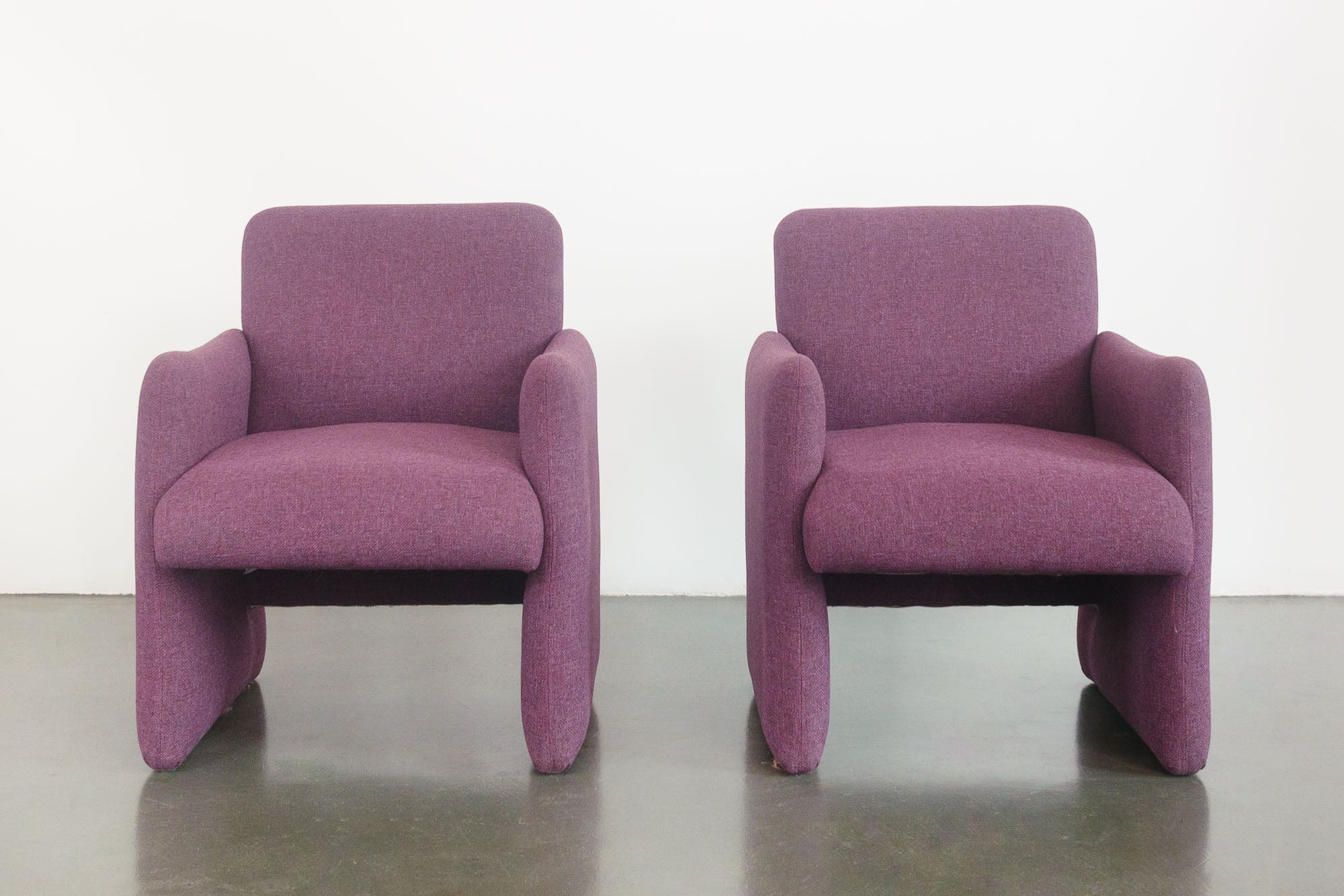 material: wood frames, purple woven upholstery