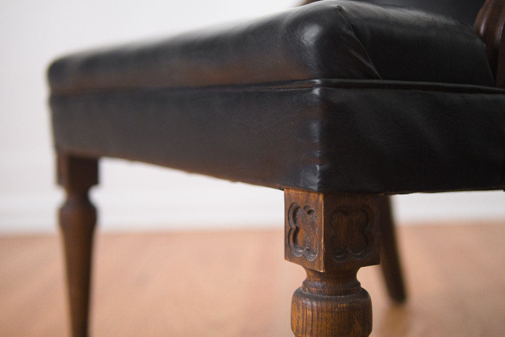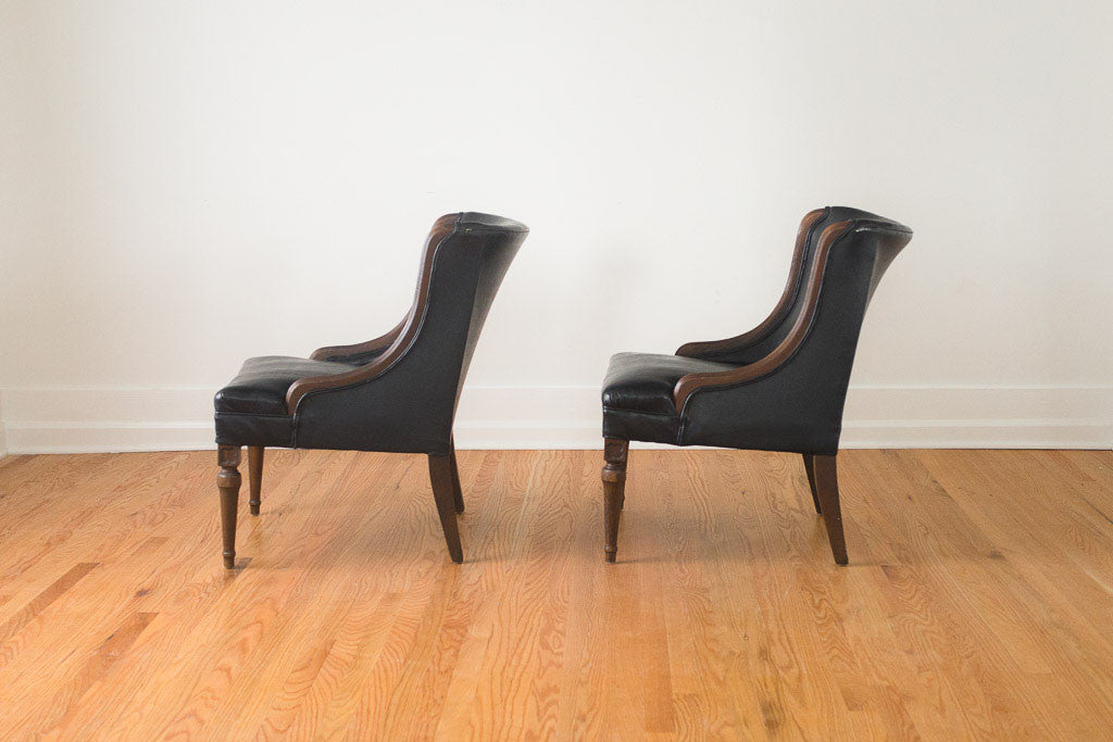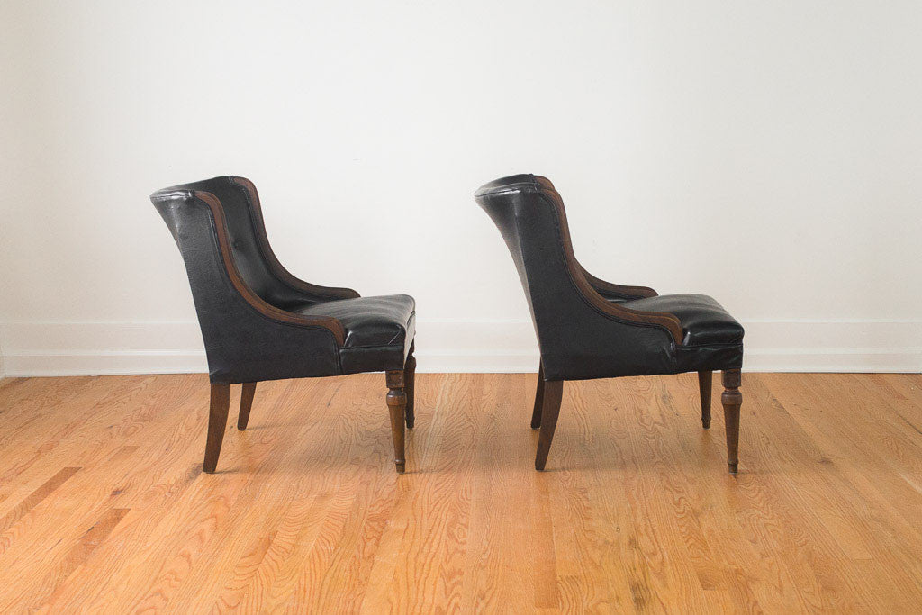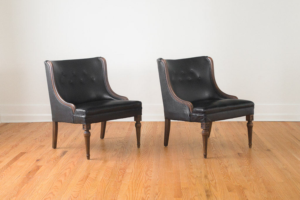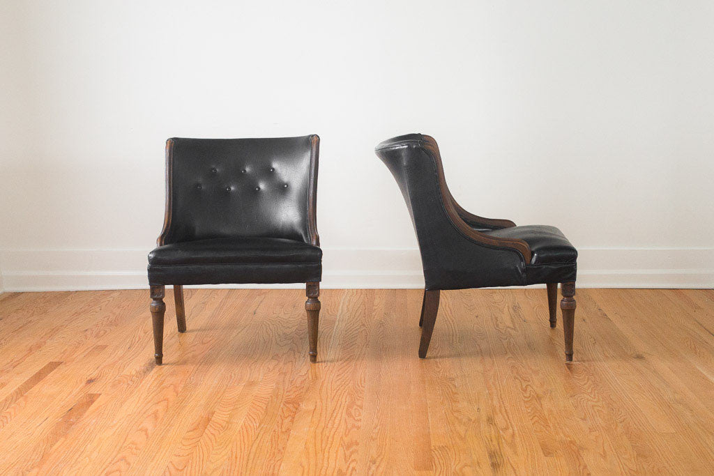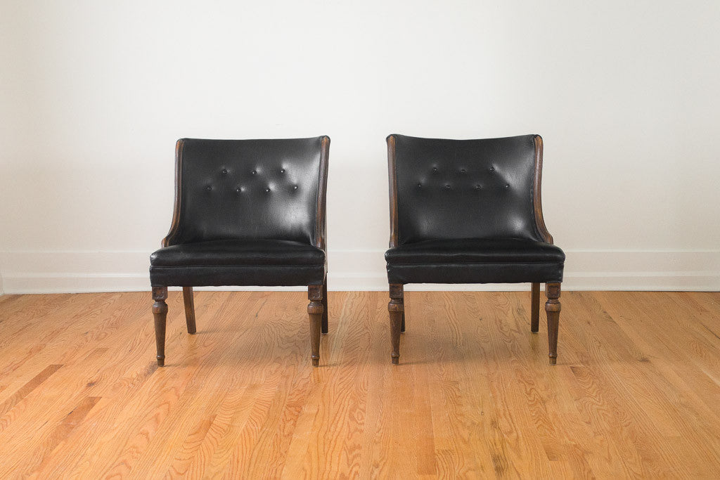 We have a really nice set of vintage tufted chairs with carved wood frames in the shop. The wood frame on both chairs was recently completely reglued and restained, so they are extremely sturdy and have a beautiful finish. The black Naugahyde upholstery is in excellent shape with button tufting on the seat back. These chairs would work well with an Art Deco, Hollywood Regency, Mid Century, eclectic, French industrial or Anthropologie style decorating scheme.