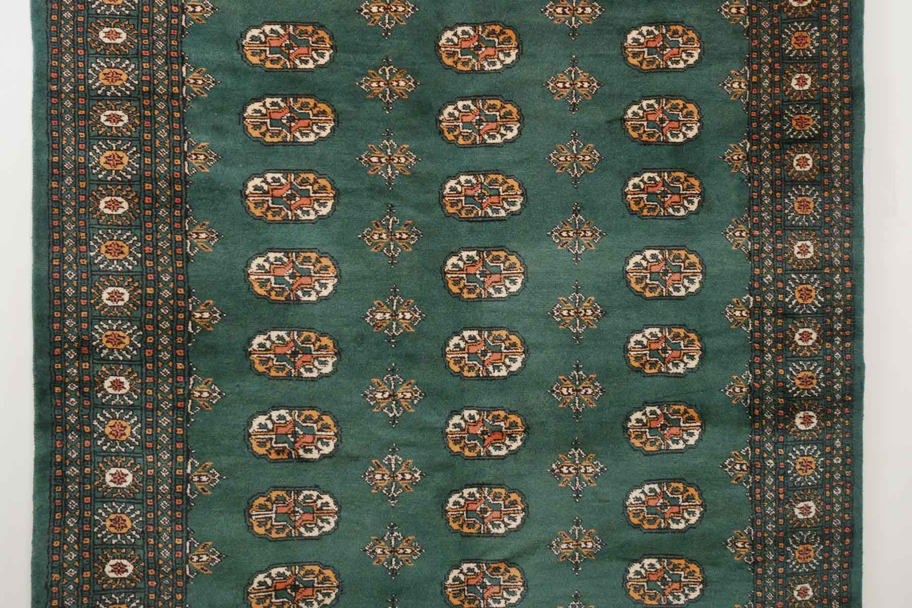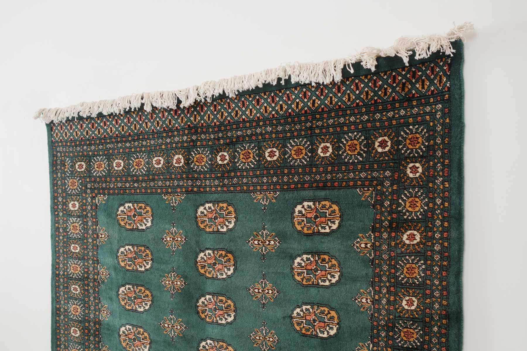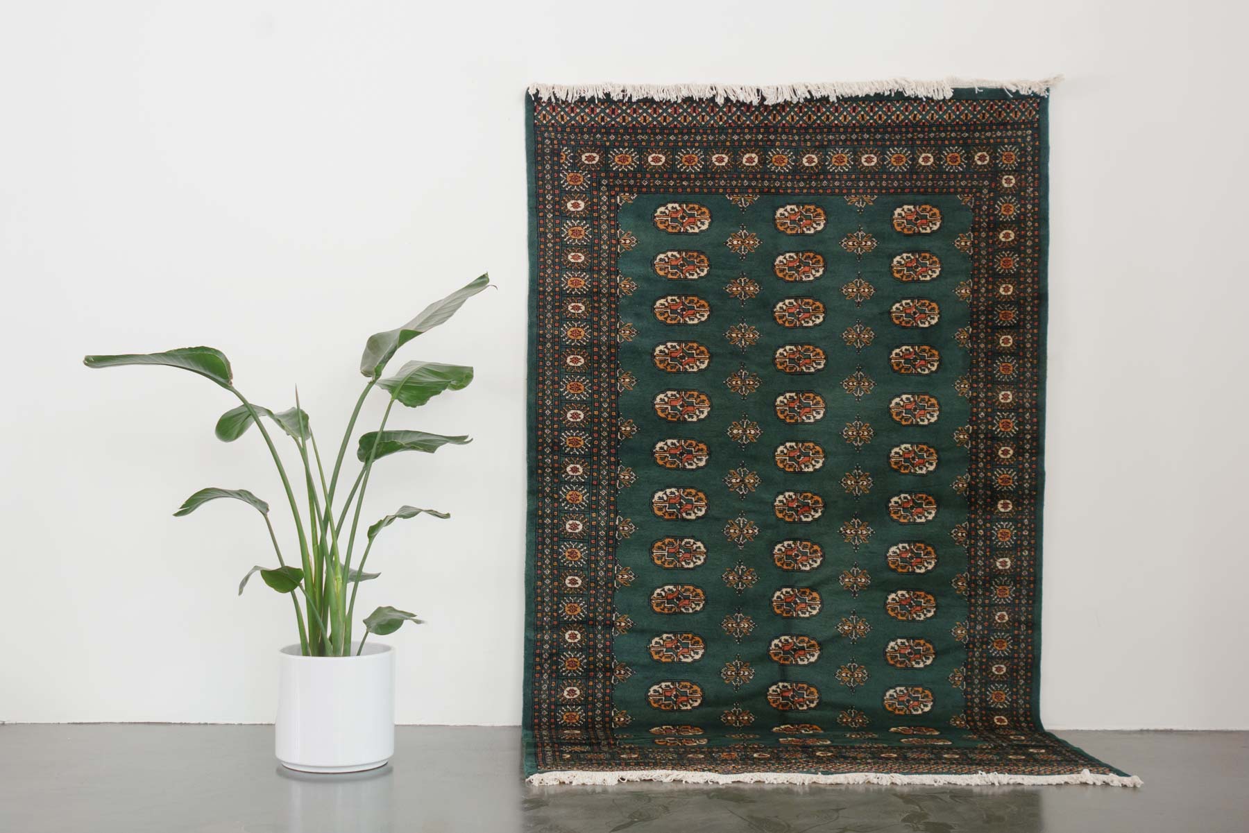 name: Dakshya style: hand knotted, Pakistani, rug, carpet material: woolcolors: green, tan, beige, sienna age: vintage condition: good, age related wear / small hole - see pictures